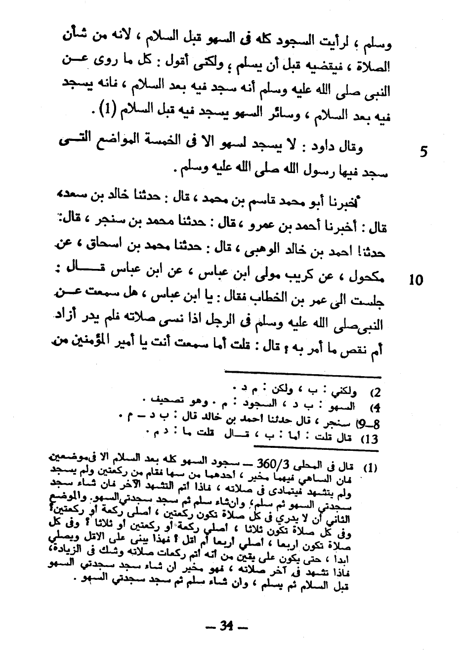 وَسَلَّمَ لَرَأَيْتُ السُّجُودَ كُلَّهُ فِي السَّهْوِ قَبْلَ السَّلَامِ لِأَنَّهُ مِنْ شَأْنِ الصَّلَاةِ فَيَقْضِيَهُ قَبْلَ أَنْ يُسَلِّمَ وَلَكِنِّي أَقُولُ كُلُّ مَا رُوِيَ عَنِ النَّبِيِّ صَلَّى اللَّهُ عَلَيْهِ وَسَلَّمَ أَنَّهُ سَجَدَ فِيهِ بَعْدَ السَّلَامِ فَإِنَّهُ يُسْجَدُ فِيهِ بَعْدَ السَّلَامِ وَسَائِرُ السَّهْوِ يُسْجَدُ فِيهِ قَبْلَ السلام وقال داود لايسجد لِسَهْوٍ إِلَّا فِي الْخَمْسَةِ الْمَوَاضِعِ الَّتِي سَجَدَ فِيهَا رَسُولُ اللَّهِ صَلَّى اللَّهُ عَلَيْهِ وَسَلَّمَ أَخْبَرَنَا أَبُو مُحَمَّدٍ قَاسِمُ بْنُ مُحَمَّدٍ قَالَ حَدَّثَنَا خَالِدُ بْنُ سَعْدٍ قَالَ أَخْبَرَنَا أَحْمَدُ بْنُ عَمْرٍو قَالَ حَدَّثَنَا مُحَمَّدُ بْنُ سَنْجَرٍ قَالَ حَدَّثَنَا أَحْمَدُ بْنُ خَالِدٍ الْوَهْبِيُّ قَالَ حَدَّثَنَا مُحَمَّدُ بْنُ إِسْحَاقَ عَنْ مَكْحُولٍ عَنْ كُرَيْبٍ مَوْلَى ابْنِ عَبَّاسٍ عَنِ ابْنِ عَبَّاسٍ قَالَ جَلَسْتُ إِلَى عُمَرَ بْنِ الْخَطَّابِ فَقَالَ يَا ابْنَ عَبَّاسٍ هَلْ سَمِعْتَ عَنِ النَّبِيِّ صَلَّى اللَّهُ عَلَيْهِ وَسَلَّمَ فِي الرَّجُلِ إِذَا نَسِيَ صَلَاتَهُ فَلَمْ يَدْرِ أَزَادَ أَمْ نَقَصَ مَا أُمِرَ بِهِ قَالَ قُلْتُ أَمَا سَمِعْتَ أَنْتَ يَا أَمِيرَ الْمُؤْمِنِينَ مِنْ