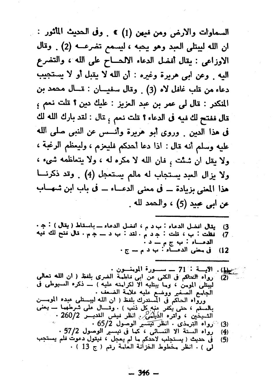 السَّمَاوَاتُ وَالْأَرْضُ وَمَنْ فِيهِنَّ وَفِي الْحَدِيثِ الْمَأْثُورِ إِنَّ اللَّهَ لَيَبْتَلِي الْعَبْدَ وَهُوَ يُحِبُّهُ لِيَسْمَعَ تَضَرُّعَهُ وَقَالَ الْأَوْزَاعِيُّ يُقَالُ أَفْضَلُ الدُّعَاءِ الْإِلْحَاحُ عَلَى اللَّهِ وَالتَّضَرُّعُ إِلَيْهِ وَعَنْ أَبِي هُرَيْرَةِ وَغَيْرِهِ إِنَّ اللَّهَ لَا يَقْبَلُ أَوْ لَا يَسْتَجِيبُ دُعَاءً مِنْ قَلْبٍ غَافِلٍ لَاهٍ وَقَالَ سُفْيَانُ قَالَ مُحَمَّدُ بْنُ الْمُنْكَدِرِ قَالَ لِي عُمَرُ بْنُ عَبْدِ الْعَزِيزِ عَلَيْكَ دَيْنٌ قُلْتُ نَعَمْ قَالَ فَفُتِحَ لَكَ فِيهِ فِي الدُّعَاءِ قُلْتُ نَعَمْ قَالَ لَقَدْ بَارَكَ اللَّهُ لَكَ فِي هَذَا الدَّيْنِ وَرَوَى أَبُو هُرَيْرَةَ وَأَنَسٌ عَنِ النَّبِيِّ صَلَّى اللَّهُ عَلَيْهِ وَسَلَّمَ أَنَّهُ قَالَ إِذَا دَعَا أَحَدُكُمْ فَلْيَعْزِمْ وَلِيُعَظِّمَ الرَّغْبَةَ وَلَا يَقُلْ إِنْ شِئْتُ فَإِنَّ اللَّهَ لَا مُكْرِهَ لَهُ وَلَا يَتَعَاظَمُهُ شَيْءٌ وَلَا يَزَالُ الْعَبْدُ يُسْتَجَابُ لَهُ مَا لَمْ يَسْتَعْجِلْ وَقَدْ ذَكَرْنَا هَذَا الْمَعْنَى بِزِيَادَةٍ فِي مَعْنَى الدُّعَاءِ فِي بَابِ ابْنِ شِهَابٍ عَنْ أَبِي عُبَيْدٍ والحمد لله
