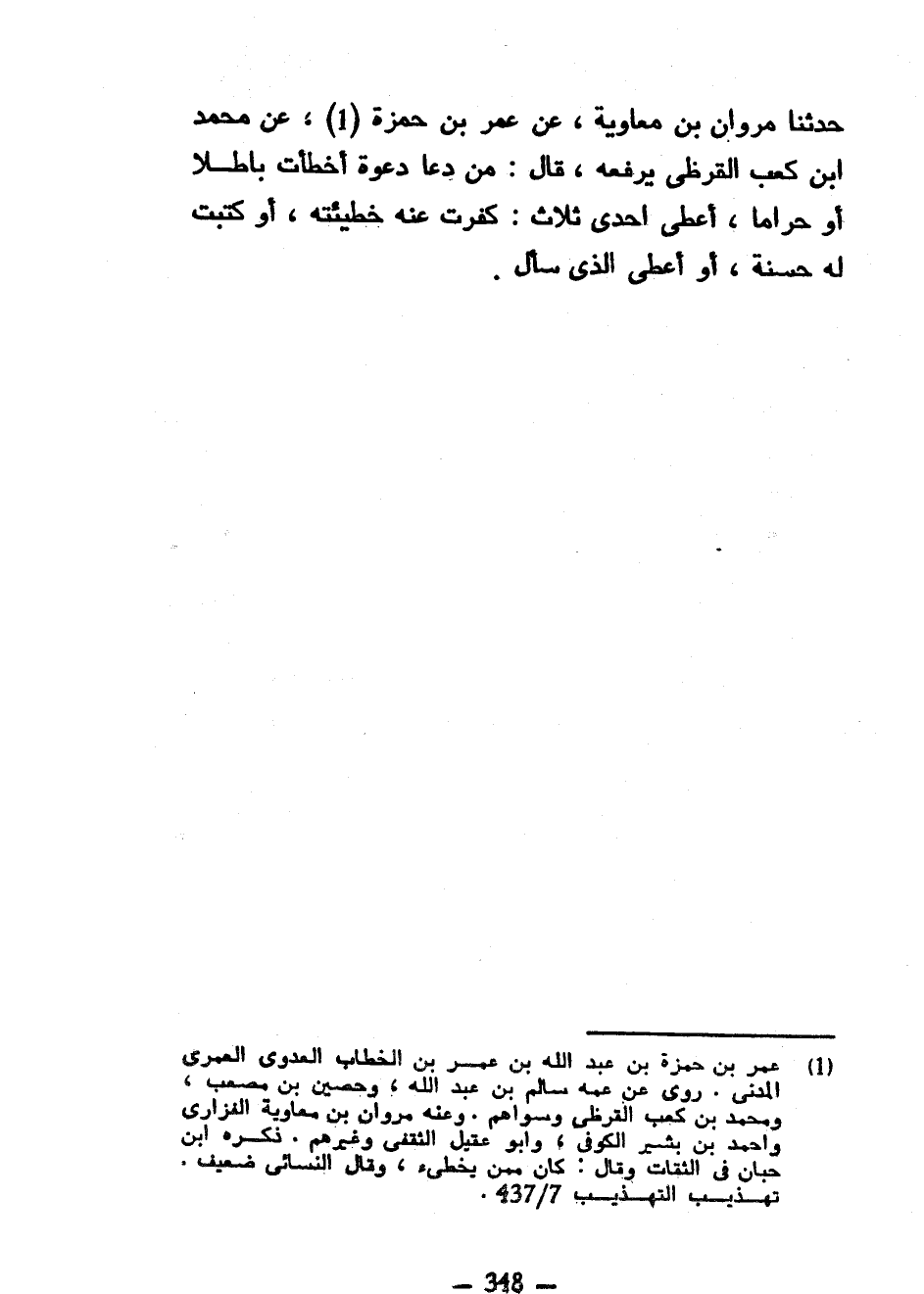 حَدَّثَنَا مَرْوَانُ بْنُ مُعَاوِيَةَ عَنْ عُمَرَ بْنِ حَمْزَةَ عَنْ مُحَمَّدِ بْنِ كَعْبٍ الْقُرَظِيِّ يَرْفَعُهُ قَالَ مَنْ دَعَا دَعْوَةً أَخْطَأَتْ بَاطِلًا أَوْ حَرَامًا أُعْطِيَ إِحْدَى ثَلَاثٍ كُفِّرَتْ عَنْهُ خَطِيئَتُهُ أَوْ كُتِبَتْ لَهُ حَسَنَةٌ أَوْ أُعْطِيَ الَّذِي سأل التمهيد لما في الموطأ من المعاني والأسانيد