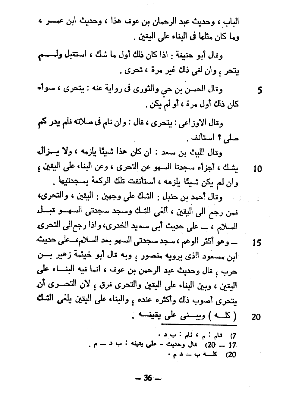 الباب وحديث عبد الرحمان بْنِ عَوْفٍ هَذَا وَحَدِيثُ ابْنِ عُمَرَ وَمَا كَانَ مِثْلَهَا فِي الْبِنَاءِ عَلَى الْيَقِينِ وَقَالَ أَبُو حَنِيفَةَ إِذَا كَانَ ذَلِكَ أَوَّلَ مَا شَكَّ اسْتَقْبَلَ وَلَمْ يَتَحَرَّ وَإِنَّ لَفِيَ ذَلِكَ غَيْرَ مَرَّةٍ تَحَرَّى وَقَالَ الْحَسَنُ بْنُ حَيٍّ وَالثَّوْرِيُّ فِي رِوَايَةٍ عَنْهُ يَتَحَرَّى سَوَاءٌ كَانَ ذَلِكَ أَوَّلَ مَرَّةٍ أَوْ لَمْ يَكُنْ وَقَالَ الْأَوْزَاعِيُّ يَتَحَرَّى قَالَ وَإِنْ نَامَ فِي صَلَاتِهِ فَلَمْ يَدْرِ كَمْ صَلَّى اسْتَأْنَفَ وَقَالَ اللَّيْثُ بْنُ سَعْدٍ إِنْ كَانَ هَذَا شَيْئًا يَلْزَمُهُ وَلَا يَزَالُ يَشُكُّ أَجَزْأَهُ سَجْدَتَا السَّهْوِ عَنِ التَّحَرِّي وَعَنِ الْبِنَاءِ عَلَى الْيَقِينِ وَإِنْ لَمْ يكن شيئا يلزمه استأنفت تِلْكَ الرَّكْعَةُ بِسَجْدَتَيْهَا وَقَالَ أَحْمَدُ بْنُ حَنْبَلٍ الشَّكُّ عَلَى وَجْهَيْنِ الْيَقِينُ وَالتَّحَرِّي فَمَنْ رَجَعَ إِلَى الْيَقِينِ أَلْغَى الشَّكَّ وَسَجَدَ سَجْدَتَيِ السَّهْوِ قَبْلَ السَّلَامِ عَلَى حَدِيثِ أَبِي سَعِيدٍ الْخُدْرِيِّ وَإِذَا رَجَعَ إِلَى التَّحَرِّي وَهُوَ أَكْثَرُ الْوَهْمِ سَجَدَ سَجْدَتَيِ السَّهْوِ بَعْدَ السَّلَامِ عَلَى حَدِيثِ ابْنِ مَسْعُودٍ الَّذِي يَرْوِيهِ مَنْصُورٌ وَبِهِ قَالَ أَبُو خَيْثَمَةَ زُهَيْرُ بْنُ حَرْبٍ قَالَ وَحَدِيثُ عَبْدِ الرَّحْمَنِ بْنِ عَوْفٍ إِنَّمَا فِيهِ الْبِنَاءُ عَلَى الْيَقِينِ وَبَيْنَ الْبِنَاءِ عَلَى الْيَقِينِ وَالتَّحَرِّي فَرْقٌ لِأَنَّ التَّحَرِّيَ أَنْ يَتَحَرَّى أَصْوَبَ ذَاكَ وَأَكْثَرَهُ عِنْدَهُ وَالْبِنَاءُ عَلَى الْيَقِينِ يُلْغِي الشَّكَّ (كُلَّهُ) وَيَبْنِي عَلَى يَقِينِهِ