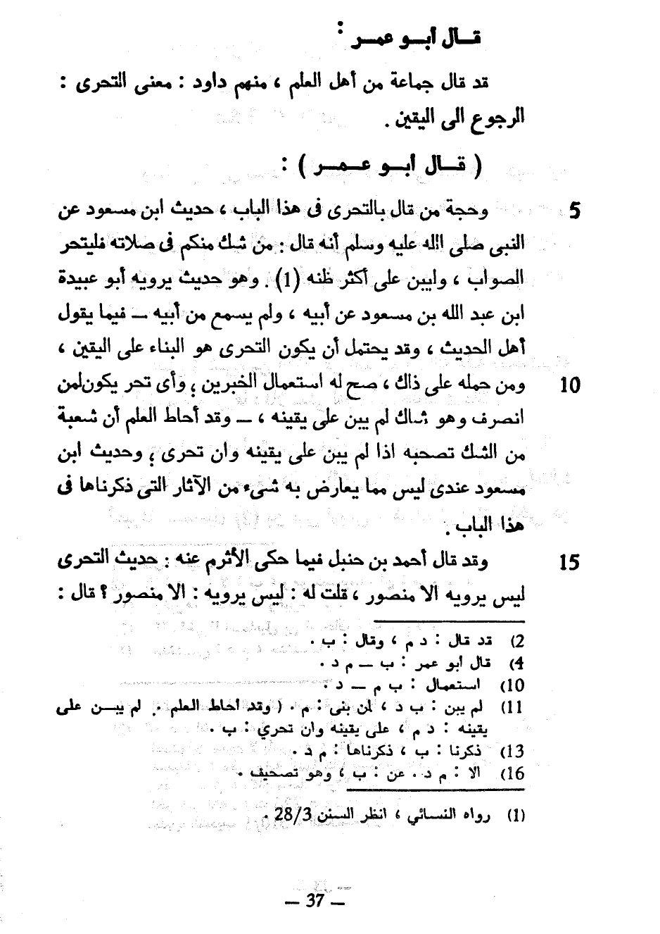 قَالَ أَبُو عُمَرَ قَدْ قَالَ جَمَاعَةٌ مِنَ أَهْلِ الْعِلْمِ مِنْهُمْ دَاوُدُ مَعْنَى التَّحَرِّي الرُّجُوعُ إِلَى الْيَقِينِ (قَالَ أَبُو عُمَرَ) وَحُجَّةُ مَنْ قَالَ بِالتَّحَرِّي فِي هَذَا الْبَابِ حَدِيثُ ابْنِ مَسْعُودٍ عَنِ النَّبِيِّ صَلَّى اللَّهُ عَلَيْهِ وَسَلَّمَ أَنَّهُ قَالَ مَنْ شَكَّ مِنْكُمْ فِي صَلَاتِهِ فَلْيَتَحَرَّ الصَّوَابَ وَلْيَبْنِ عَلَى أَكْثَرِ ظَنِّهِ وَهُوَ حديث يرويه أبو عبيدة ابن عَبْدِ اللَّهِ بْنِ مَسْعُودٍ عَنْ أَبِيهِ وَلَمْ يَسْمَعْ مِنْ أَبِيهِ فِيمَا يَقُولُ أَهْلُ الْحَدِيثِ وَقَدْ يُحْتَمَلُ أَنْ يَكُونَ التَّحَرِّي هُوَ الْبِنَاءُ عَلَى الْيَقِينِ وَمَنْ حَمَلَهُ عَلَى ذَاكَ صَحَّ لَهُ اسْتِعْمَالُ الْخَبَرَيْنِ وَأَيُّ تَحَرٍّ يَكُونُ لِمَنِ انْصَرَفَ وَهُوَ شَاكٌ لَمْ يَبْنِ عَلَى يَقِينِهِ وَقَدْ أَحَاطَ الْعِلْمُ أَنَّ شُعْبَةً مِنَ الشَّكِّ تَصْحَبُهُ إِذَا لَمْ يَبْنِ عَلَى يَقِينِهِ وَإِنْ تَحَرَّى وَحَدِيثُ ابْنِ مَسْعُودٍ عِنْدِي لَيْسَ مِمَّا يُعَارَضُ بِهِ شَيْءٌ مِنَ الْآثَارِ الَّتِي ذَكَرْنَاهَا فِي هَذَا الْبَابِ وَقَدْ قَالَ أَحْمَدُ بْنُ حَنْبَلٍ فِيمَا حَكَى الْأَثْرَمُ عَنْهُ حَدِيثُ التَّحَرِّي لَيْسَ يَرْوِيهِ إِلَّا مَنْصُورٌ قُلْتُ لَهُ لَيْسَ يَرْوِيهِ إِلَّا مَنْصُورٌ قَالَ