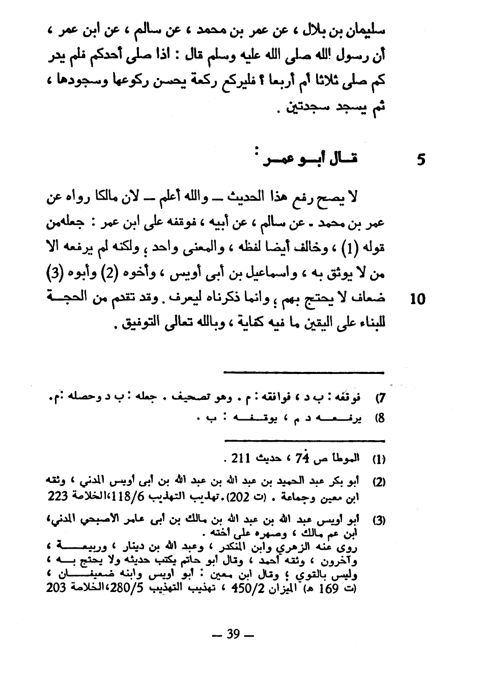 سُلَيْمَانَ بْنِ بِلَالٍ عَنْ عُمَرَ بْنِ مُحَمَّدٍ عَنْ سَالِمٍ عَنِ ابْنِ عُمَرَ أَنَّ رَسُولَ اللَّهِ صَلَّى اللَّهُ عَلَيْهِ وَسَلَّمَ قَالَ إِذَا صَلَّى أَحَدُكُمْ فَلَمْ يَدْرِ كَمْ صَلَّى ثَلَاثًا أَمْ أَرْبَعًا فَلْيَرْكَعْ رَكْعَةً يُحْسِنُ رُكُوعَهَا وَسُجُودَهَا ثُمَّ يَسْجُدْ سَجْدَتَيْنِ قَالَ أَبُو عُمَرَ لَا يَصِحُّ رَفْعُ هَذَا الْحَدِيثِ وَاللَّهُ أَعْلَمُ لِأَنَّ مَالِكًا رَوَاهُ عَنْ عُمَرَ بْنِ مُحَمَّدٍ عَنْ سَالِمٍ عَنْ أَبِيهِ فَوَقَفَهُ عَلَى ابْنِ عُمَرَ جَعَلَهُ مِنْ قَوْلِهِ وَخَالَفَ أَيْضًا لَفْظَهُ وَالْمَعْنَى وَاحِدٌ وَلَكِنَّهُ لَمْ يَرْفَعْهُ إِلَّا مَنْ لَا يُوثَقُ بِهِ وَإِسْمَاعِيلُ بْنُ أَبِي أُوَيْسٍ وَأَخُوهُ وَأَبُوهُ ضِعَافٌ لَا يُحْتَجُّ بِهِمْ وَإِنَّمَا ذَكَرْنَاهُ لِيُعْرَفَ وَقَدْ تَقَدَّمَ مِنَ الْحُجَّةِ لِلْبِنَاءِ عَلَى الْيَقِينِ مَا فِيهِ كِفَايَةٌ وَبِاللَّهِ تَعَالَى التَّوْفِيقُ