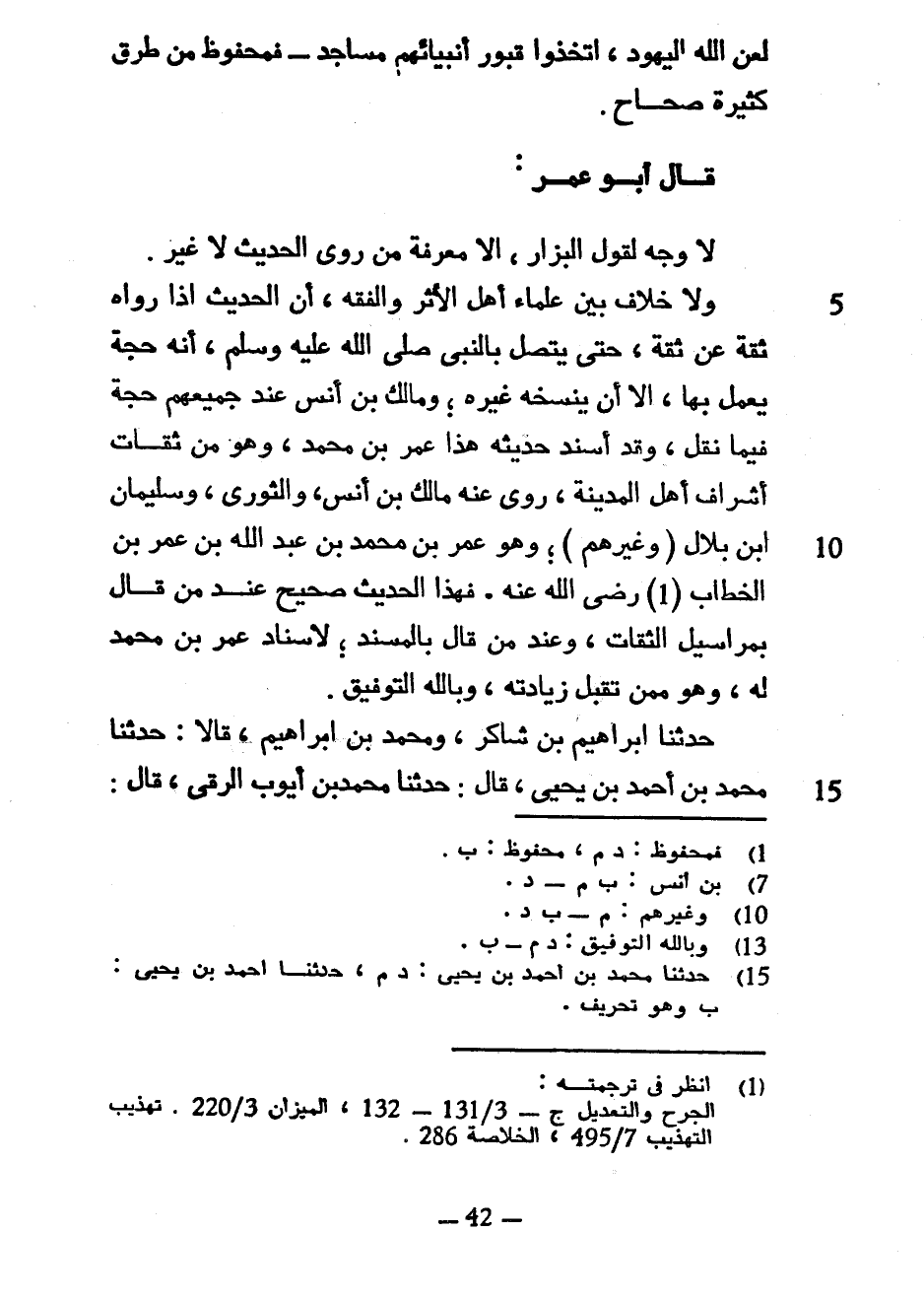 لَعَنَ اللَّهُ الْيَهُودَ اتَّخَذُوا قُبُورَ أَنْبِيَائِهِمْ مَسَاجِدَ فَمَحْفُوظٌ مِنْ طُرُقٍ كَثِيرَةٍ صِحَاحٍ قَالَ أَبُو عُمَرَ لَا وَجْهَ لِقَوْلِ الْبَزَّارِ إِلَّا مَعْرِفَةُ مَنْ رَوَى الْحَدِيثَ لَا غَيْرَ وَلَا خِلَافَ بن عُلَمَاءِ أَهْلِ الْأَثَرِ وَالْفِقْهِ أَنَّ الْحَدِيثَ إِذَا رَوَاهُ ثِقَةٌ عَنْ ثِقَةٍ حَتَّى يَتَّصِلَ بِالنَّبِيِّ صَلَّى اللَّهُ عَلَيْهِ وَسَلَّمَ أَنَّهُ حُجَّةٌ يُعْمَلُ بِهَا إِلَّا أَنْ يَنْسَخَهُ غَيْرُهُ وَمَالِكُ بْنُ أَنَسٍ عِنْدَ جَمِيعِهِمْ حُجَّةٌ فِيمَا نَقَلَ وَقَدْ أَسْنَدَ حَدِيثَهُ هَذَا عُمَرُ بْنُ مُحَمَّدٍ وَهُوَ مِنْ ثِقَاتِ أَشْرَافِ أَهْلِ الْمَدِينَةِ رَوَى عَنْهُ مَالِكُ بْنُ أَنَسٍ وَالثَّوْرِيُّ وَسُلَيْمَانُ بْنُ بِلَالٍ (وَغَيْرُهُمْ) وَهُوَ عُمَرُ بْنُ مُحَمَّدِ بْنِ عَبْدِ اللَّهِ بْنِ عُمَرَ بْنِ الْخَطَّابِ رَضِيَ اللَّهُ عَنْهُ فَهَذَا الْحَدِيثُ صَحِيحٌ عِنْدَ مَنْ قَالَ بِمَرَاسِيلِ الثِّقَاتِ وَعِنْدَ مَنْ قَالَ بِالْمُسْنَدِ لِإِسْنَادِ عُمَرَ بْنِ مُحَمَّدٍ لَهُ وَهُوَ مِمَّنْ تُقْبَلُ زِيَادَتُهُ وَبِاللَّهِ التَّوْفِيقُ حَدَّثَنَا إِبْرَاهِيمُ بْنُ شَاكِرٍ وَمُحَمَّدُ بْنُ إِبْرَاهِيمَ قَالَا حَدَّثَنَا مُحَمَّدُ بْنُ أَحْمَدَ بْنِ يَحْيَى قَالَ حَدَّثَنَا مُحَمَّدُ بْنُ أَيُّوبَ الرَّقِّيُّ قَالَ