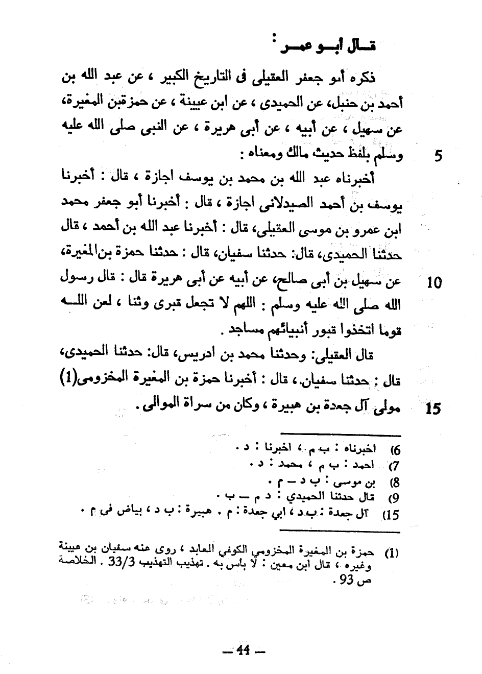 قَالَ أَبُو عُمَرَ ذَكَرَهُ أَبُو جَعْفَرٍ الْعُقَيْلِيُّ فِي التَّارِيخِ الْكَبِيرِ عَنْ عَبْدُ اللَّهِ بْنُ أَحْمَدَ بْنِ حَنْبَلٍ عَنْ الْحُمَيْدِيِّ عَنِ ابْنِ عُيَيْنَةَ عَنْ حَمْزَةَ بْنِ الْمُغِيرَةِ عَنْ سُهَيْلٍ عَنْ أَبِيهِ عَنْ أَبِي هُرَيْرَةَ عَنِ النَّبِيِّ صَلَّى اللَّهُ عَلَيْهِ وَسَلَّمَ بِلَفْظِ حَدِيثِ مَالِكٍ وَمَعْنَاهُ أَخْبَرَنَاهُ عَبْدُ اللَّهِ بْنُ مُحَمَّدِ بْنِ يُوسُفَ إِجَازَةً قَالَ أَخْبَرَنَا يُوسُفُ بْنُ أَحْمَدَ الصَّيْدَلَانِيُّ إِجَازَةً قَالَ أَخْبَرَنَا أَبُو جَعْفَرٍ مُحَمَّدُ بْنُ عَمْرِو بْنِ مُوسَى الْعُقَيْلِيُّ قَالَ أَخْبَرَنَا عَبْدُ اللَّهِ بْنُ أَحْمَدَ قَالَ حَدَّثَنَا الْحُمَيْدِيُّ قَالَ حَدَّثَنَا سُفْيَانُ قَالَ حَدَّثَنَا حَمْزَةُ بْنُ الْمُغِيرَةِ عَنْ سُهَيْلِ بْنِ أَبِي صَالِحٍ عَنْ أَبِيهِ عَنْ أَبِي هُرَيْرَةَ قَالَ قَالَ رَسُولُ اللَّهِ صَلَّى اللَّهُ عَلَيْهِ وَسَلَّمَ اللَّهُمَّ لَا تَجْعَلْ قَبْرِي وَثَنًا لَعَنَ اللَّهُ قَوْمًا اتَّخَذُوا قُبُورَ أَنْبِيَائِهِمْ مَسَاجِدَ قَالَ الْعُقَيْلِيُّ وَحَدَّثَنَا مُحَمَّدُ بْنُ إِدْرِيسَ قَالَ حَدَّثَنَا الْحُمَيْدِيُّ قَالَ حَدَّثَنَا سُفْيَانُ قَالَ أَخْبَرَنَا حَمْزَةُ بْنُ الْمُغِيرَةِ الْمَخْزُومِيُّ مَوْلَى آلِ جَعْدَةَ بْنِ هُبَيْرَةَ وَكَانَ مِنْ سراة الموالي