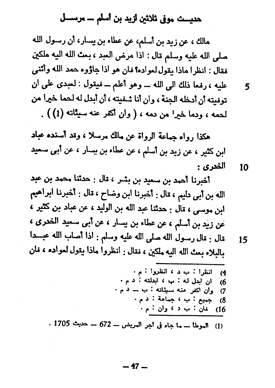 حَدِيثٌ مُوفِي ثَلَاثِينَ لِزَيْدِ بْنِ أَسْلَمَ مُرْسَلٌ مالك عَنْ زَيْدِ بْنِ أَسْلَمَ عَنْ عَطَاءِ بْنِ يَسَارٍ أَنَّ رَسُولَ اللَّهِ صَلَّى اللَّهُ عَلَيْهِ وَسَلَّمَ قَالَ إِذَا مَرِضَ الْعَبْدُ بَعَثَ اللَّهُ إِلَيْهِ مَلَكَيْنِ فَقَالَ انْظُرَا مَاذَا يَقُولُ لعواده فإن هو إذا جاؤوه حَمِدَ اللَّهَ وَأَثْنَى عَلَيْهِ رَفَعَا ذَلِكَ إِلَى اللَّهِ وَهُوَ أَعْلَمُ فَيَقُولُ لِعَبْدِي عَلَيَّ إِنْ تَوَفَّيْتُهُ أَنْ أُدْخِلَهُ الْجَنَّةَ وَإِنْ أَنَا شَفَيْتُهُ أَنْ أُبَدِّلَ لَهُ لَحْمًا خَيْرًا مِنْ لَحْمِهِ وَدَمًا خَيْرًا مِنْ دَمِهِ (وَأَنْ أُكَفِّرَ عَنْهُ سَيِّئَاتِهِ (1)) هَكَذَا رَوَاهُ جَمَاعَةُ الرُّوَاةِ عَنْ مَالِكٍ مُرْسَلًا وَقَدْ أَسْنَدَهُ عَبَّادُ بْنُ كَثِيرٍ عَنْ زَيْدِ بْنِ أَسْلَمَ عَنْ عَطَاءِ بْنِ يَسَارٍ عَنْ أَبِي سَعِيدٍ الْخُدْرِيِّ أَخْبَرَنَا أَحْمَدُ بْنُ سَعِيدِ بْنِ بِشْرٍ قَالَ حَدَّثَنَا مُحَمَّدُ بْنُ عَبْدِ اللَّهِ بْنِ أَبِي دُلَيْمٍ قَالَ أَخْبَرَنَا ابْنُ وَضَّاحٍ قَالَ أَخْبَرَنَا إِبْرَاهِيمُ بْنُ مُوسَى قَالَ حَدَّثَنَا عَبْدُ اللَّهِ بْنُ الْوَلِيدِ عَنْ عباد بن كثير عَنْ زَيْدِ بْنِ أَسْلَمَ عَنْ عَطَاءِ بْنِ يَسَارٍ عَنْ أَبِي سَعِيدٍ الْخُدْرِيِّ قَالَ قَالَ رَسُولُ اللَّهِ صَلَّى اللَّهُ عَلَيْهِ وَسَلَّمَ إِذَا أَصَابَ اللَّهُ عَبْدًا بِالْبَلَاءِ بَعَثَ اللَّهُ إِلَيْهِ مَلَكَيْنِ فَقَالَ انْظُرُوا مَاذَا يَقُولُ لِعُوَّادِهِ فَإِنْ