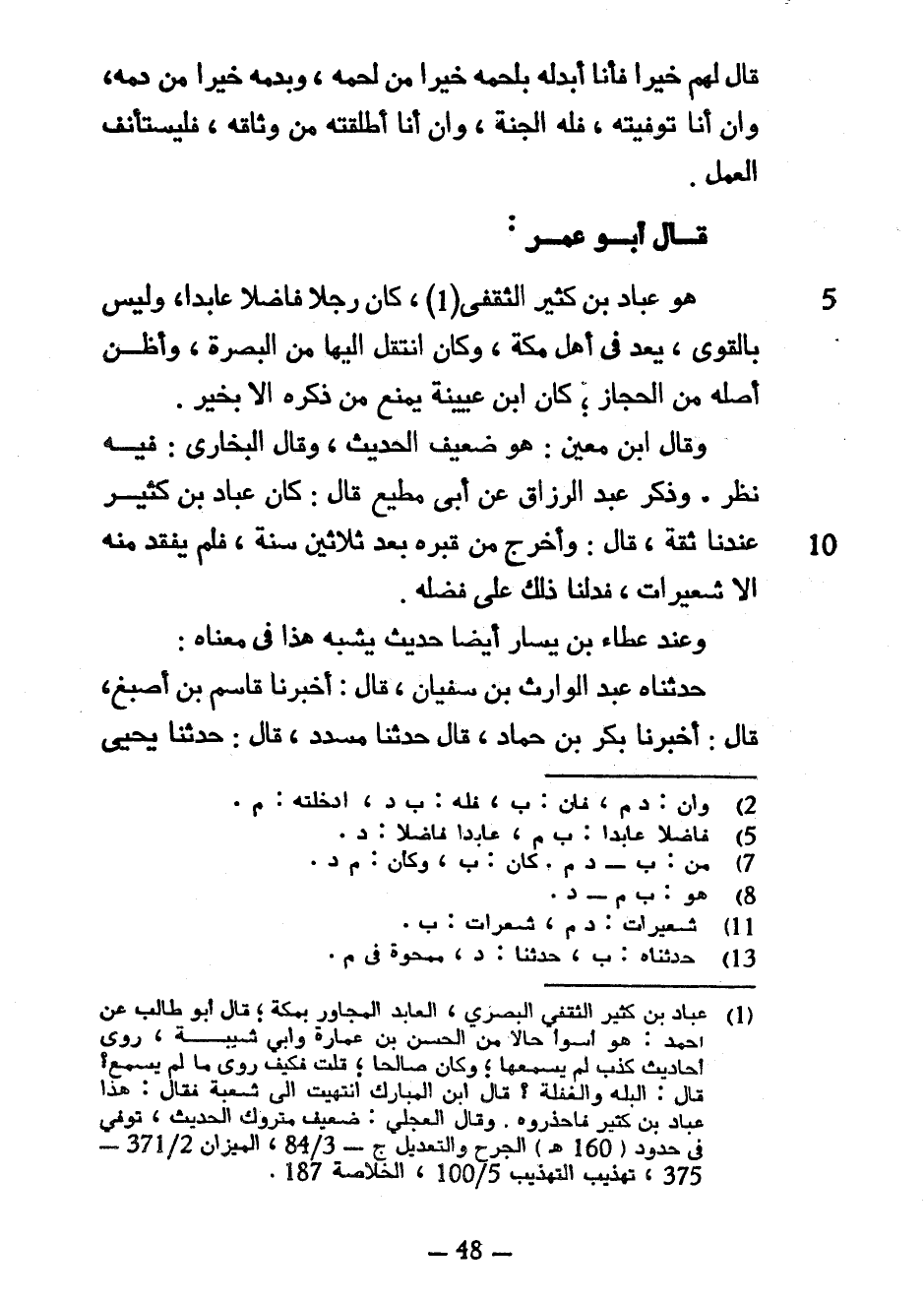 قَالَ لَهُمْ خَيْرًا فَأَنَا أُبَدِّلُهُ بِلَحْمِهِ خَيْرًا مِنْ لَحْمِهِ وَبِدَمِهِ خَيْرًا مِنْ دَمِهِ وَإِنْ أَنَا تَوَفَّيْتُهُ فَلَهُ الْجَنَّةُ وَإِنْ أَنَا أَطْلَقْتُهُ مِنْ وَثَاقِهِ فَلْيَسْتَأْنِفِ الْعَمَلَ قَالَ أَبُو عُمَرَ هُوَ عَبَّادُ بْنُ كَثِيرٍ الثَّقَفِيُّ كَانَ رَجُلًا فَاضِلًا عَابِدًا وَلَيْسَ بِالْقَوِيِّ يُعَدُّ فِي أَهْلِ مَكَّةَ وَكَانَ انْتَقَلَ إِلَيْهَا مِنَ الْبَصْرَةِ وَأَظُنُّ أَصْلَهُ مِنَ الْحِجَازِ كَانَ ابْنُ عُيَيْنَةَ يَمْنَعُ مِنْ ذِكْرِهِ إِلَّا بِخَيْرٍ وَقَالَ ابْنُ مَعِينٍ هُوَ ضَعِيفُ الْحَدِيثِ وَقَالَ الْبُخَارِيُّ فِيهِ نَظَرٌ وَذَكَرَ عَبْدُ الرَّزَّاقِ عَنْ أَبِي مُطِيعٍ قَالَ كَانَ عَبَّادُ بْنُ كَثِيرٍ عِنْدَنَا ثِقَةٌ قَالَ وَأُخْرَجَ مِنْ قَبْرِهِ بَعْدَ ثَلَاثِينَ سَنَةً فَلَمْ يُفْقَدْ مِنْهُ إِلَّا شُعَيْرَاتٌ فَدَلَّنَا ذَلِكَ عَلَى فَضْلِهِ وَعِنْدَ عَطَاءِ بْنِ يَسَارٍ أَيْضًا حَدِيثٌ يُشْبِهُ هَذَا فِي مَعْنَاهُ حَدَّثَنَاهُ عَبْدُ الْوَارِثِ بْنُ سُفْيَانَ قَالَ أَخْبَرَنَا قَاسِمُ بْنُ أَصْبَغَ قَالَ أَخْبَرَنَا بَكْرُ بْنُ حَمَّادٍ قَالَ حَدَّثَنَا مُسَدَّدٌ قَالَ حَدَّثَنَا يَحْيَى