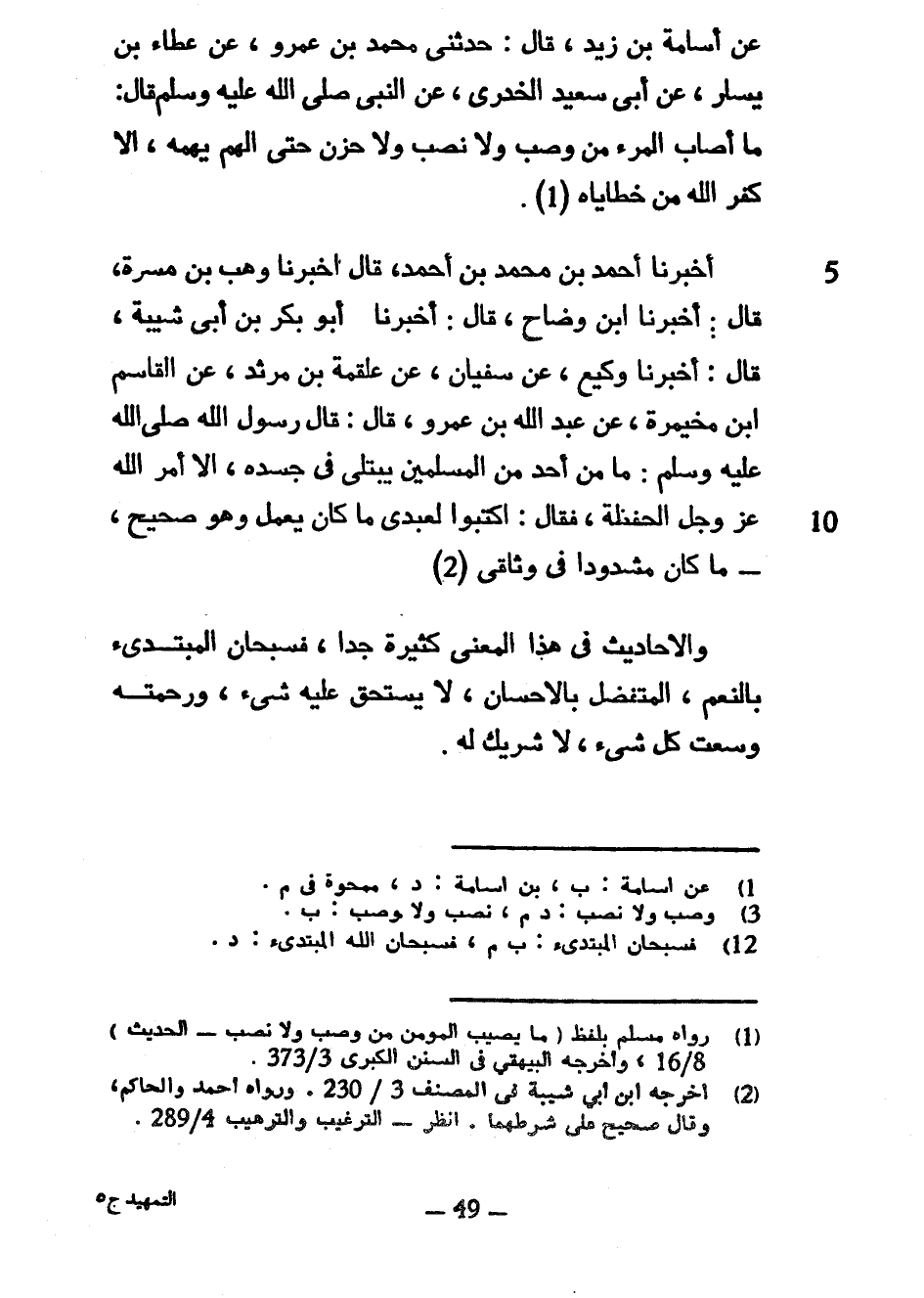 عَنْ أُسَامَةَ بْنِ زَيْدٍ قَالَ حَدَّثَنِي مُحَمَّدُ بْنُ عَمْرٍو عَنْ عَطَاءِ بْنِ يَسَارٍ عَنْ أَبِي سَعِيدٍ الْخُدْرِيِّ عَنِ النَّبِيِّ صَلَّى اللَّهُ عَلَيْهِ وَسَلَّمَ قَالَ مَا أَصَابَ الْمَرْءُ مِنْ وَصَبٍ وَلَا نَصَبٍ وَلَا حُزْنٍ حَتَّى الْهَمِّ يُهَمُّهُ إِلَّا كَفَّرَ اللَّهُ مِنْ خَطَايَاهُ أَخْبَرَنَا أَحْمَدُ بْنُ مُحَمَّدِ بْنِ أَحْمَدَ قَالَ أَخْبَرَنَا وَهْبُ بْنُ مَسَرَّةَ قَالَ أَخْبَرَنَا ابْنُ وَضَّاحٍ قَالَ أَخْبَرَنَا أَبُو بَكْرِ بْنُ أَبِي شَيْبَةَ قَالَ أَخْبَرَنَا وَكِيعٌ عَنْ سُفْيَانَ عَنْ عَلْقَمَةَ بْنِ مَرْثَدٍ عَنِ الْقَاسِمِ بْنِ مُخَيْمِرَةَ عَنْ عَبْدِ اللَّهِ بْنِ عَمْرٍو قَالَ قَالَ رَسُولُ اللَّهِ صَلَّى اللَّهُ عَلَيْهِ وَسَلَّمَ مَا مِنْ أَحَدٍ مِنَ الْمُسْلِمِينَ يُبْتَلَى فِي جَسَدِهِ إِلَّا أَمَرَ اللَّهُ عَزَّ وَجَلَّ الْحَفَظَةَ فَقَالَ اكْتُبُوا لِعَبْدِي مَا كَانَ يَعْمَلُ وَهُوَ صَحِيحٌ مَا كان مشدودا في وثاقي والأحاديث في هذاالمعنى كثيرة جدا فسبحان المبتدىء بِالنِّعَمِ الْمُتَفَضِّلِ بِالْإِحْسَانِ لَا يُسْتَحَقُّ عَلَيْهِ شَيْءٌ وَرَحْمَتُهُ وَسِعَتْ كُلَّ شَيْءٍ لَا شَرِيكَ لَهُ