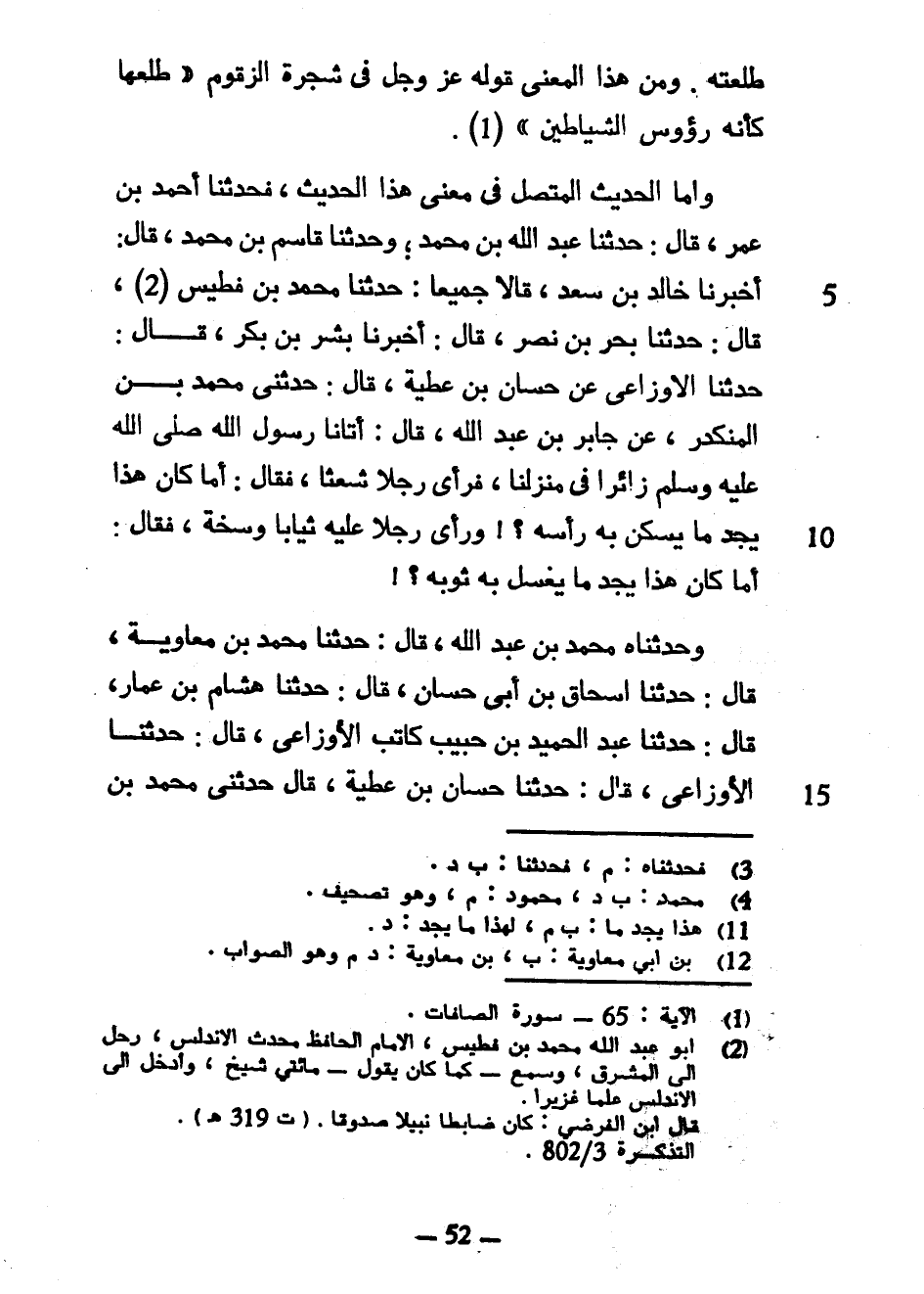 طَلْعَتِهِ وَمِنْ هَذَا الْمَعْنَى قَوْلُهُ عَزَّ وَجَلَّ في شجرة الزقوم طلعها كأنه رؤوس الشَّيَاطِينِ وَأَمَّا الْحَدِيثُ الْمُتَّصِلُ فِي مَعْنَى هَذَا الْحَدِيثِ فَحَدَّثَنَا أَحْمَدُ بْنُ عُمَرَ قَالَ حَدَّثَنَا عَبْدُ اللَّهِ بْنُ مُحَمَّدٍ وَحَدَّثَنَا قَاسِمُ بْنُ مُحَمَّدٍ قَالَ أَخْبَرَنَا خَالِدُ بْنُ سَعْدٍ قَالَا جَمِيعًا حَدَّثَنَا مُحَمَّدُ بْنُ فُطَيْسٍ قَالَ حَدَّثَنَا بَحْرُ بْنُ نَصْرٍ قَالَ أَخْبَرَنَا بِشْرُ بْنُ بَكْرٍ قَالَ حَدَّثَنَا الْأَوْزَاعِيُّ عَنْ حَسَّانَ بْنِ عَطِيَّةَ قَالَ حَدَّثَنِي مُحَمَّدِ بْنِ الْمُنْكَدِرِ عَنْ جَابِرِ بْنِ عَبْدِ اللَّهِ قَالَ أَتَانَا رَسُولُ اللَّهِ صَلَّى اللَّهُ عَلَيْهِ وَسَلَّمَ زَائِرًا فِي مَنْزِلِنَا فَرَأَى رَجُلًا شَعِثًا فَقَالَ أَمَا كَانَ هَذَا يَجِدُ مَا يُسَكِّنُ بِهِ رَأْسَهُ وَرَأَى رَجُلًا عَلَيْهِ ثِيَابًا وَسِخَةً فَقَالَ أَمَا كَانَ هَذَا يَجِدُ مَا يَغْسِلُ بِهِ ثَوْبَهُ وَحَدَّثَنَا محمد بن عبد الله قال حدقنا مُحَمَّدُ بْنُ مُعَاوِيَةَ قَالَ حَدَّثَنَا إِسْحَاقُ بْنُ أَبِي حَسَّانَ قَالَ حَدَّثَنَا هِشَامُ بْنُ عَمَّارٍ قَالَ حَدَّثَنَا عَبْدُ الْحَمِيدِ بْنُ حَبِيبٍ كَاتِبُ الْأَوْزَاعِيِّ قَالَ حَدَّثَنَا الْأَوْزَاعِيُّ قَالَ حَدَّثَنَا حَسَّانُ بن عطية قال حدثني محمد بن