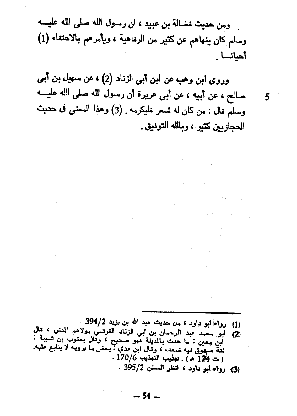 وَمِنْ حَدِيثِ فَضَالَةَ بْنِ عُبَيْدٍ أَنَّ رَسُولَ اللَّهِ صَلَّى اللَّهُ عَلَيْهِ وَسَلَّمَ كَانَ يَنْهَاهُمْ عَنْ كَثِيرٍ مِنَ الرَّفَاهِيَةِ وَيَأْمُرُهُمْ بِالِاحْتِفَاءِ أَحْيَانًا وَرَوَى ابْنُ وَهْبٍ عَنِ ابْنِ أَبِي الزِّنَادِ عَنْ سُهَيْلِ بْنِ أَبِي صَالِحٍ عَنْ أَبِيهِ عَنْ أَبِي هُرَيْرَةَ أَنَّ رَسُولَ اللَّهِ صَلَّى اللَّهُ عَلَيْهِ وَسَلَّمَ قَالَ مَنْ كَانَ لَهُ شَعْرٌ فَلْيُكْرِمْهُ وَهَذَا الْمَعْنَى فِي حَدِيثِ الْحِجَازِيِّينَ كَثِيرٌ وَبِاللَّهِ التَّوْفِيقُ