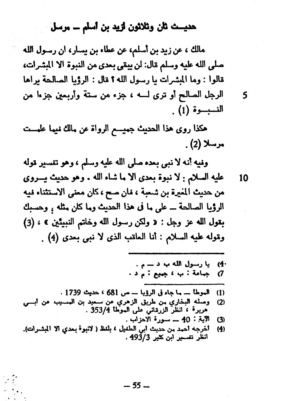 حَدِيثٌ ثَانٍ وَثَلَاثُونَ لِزَيْدِ بْنِ أَسْلَمَ مُرْسَلٌ مالك عَنْ زَيْدِ بْنِ أَسْلَمَ عَنْ عَطَاءِ بْنِ يَسَارٍ أَنَّ رَسُولَ اللَّهِ صَلَّى اللَّهُ عَلَيْهِ وَسَلَّمَ قَالَ لَنْ يَبْقَى بَعْدِي مِنَ النُّبُوَّةِ إِلَّا الْمُبَشِّرَاتُ قَالُوا وَمَا الْمُبَشِّرَاتُ يَا رَسُولَ اللَّهِ قَالَ الرُّؤْيَا الصَّالِحَةُ يَرَاهَا الرَّجُلُ الصَّالِحُ أَوْ تُرَى لَهُ جُزْءٌ مِنْ سِتَّةٍ وَأَرْبَعِينَ جُزْءًا مِنَ النُّبُوَّةِ هَكَذَا رَوَى هَذَا الْحَدِيثَ جَمِيعُ الرُّوَاةِ عَنْ مَالِكٍ فِيمَا عَلِمْتُ مُرْسَلًا وَفِيهِ أَنَّهُ لَا نَبِيَّ بَعْدَهُ صَلَّى اللَّهُ عَلَيْهِ وَسَلَّمَ وَهُوَ تَفْسِيرُ قَوْلِهِ عَلَيْهِ السَّلَامُ لَا نُبُوَّةَ بَعْدِي إِلَّا مَا شَاءَ اللَّهُ وَهُوَ حَدِيثٌ يُرْوَى مِنْ حَدِيثِ الْمُغِيرَةِ بْنِ شُعْبَةَ فَإِنَّ صَحَّ كَانَ مَعْنَى الِاسْتِثْنَاءِ فِيهِ الرُّؤْيَا الصَّالِحَةُ عَلَى مَا فِي هَذَا الْحَدِيثِ وَمَا كَانَ مِثْلَهُ وَحَسْبُكَ بِقَوْلِ اللَّهِ عَزَّ وَجَلَّ وَلَكِنْ رَسُولَ اللَّهِ وَخَاتَمَ النَّبِيِّينَ وَقَوْلُهُ عَلَيْهِ السَّلَامُ أَنَا الْعَاقِبُ الَّذِي لَا نبي بعدي