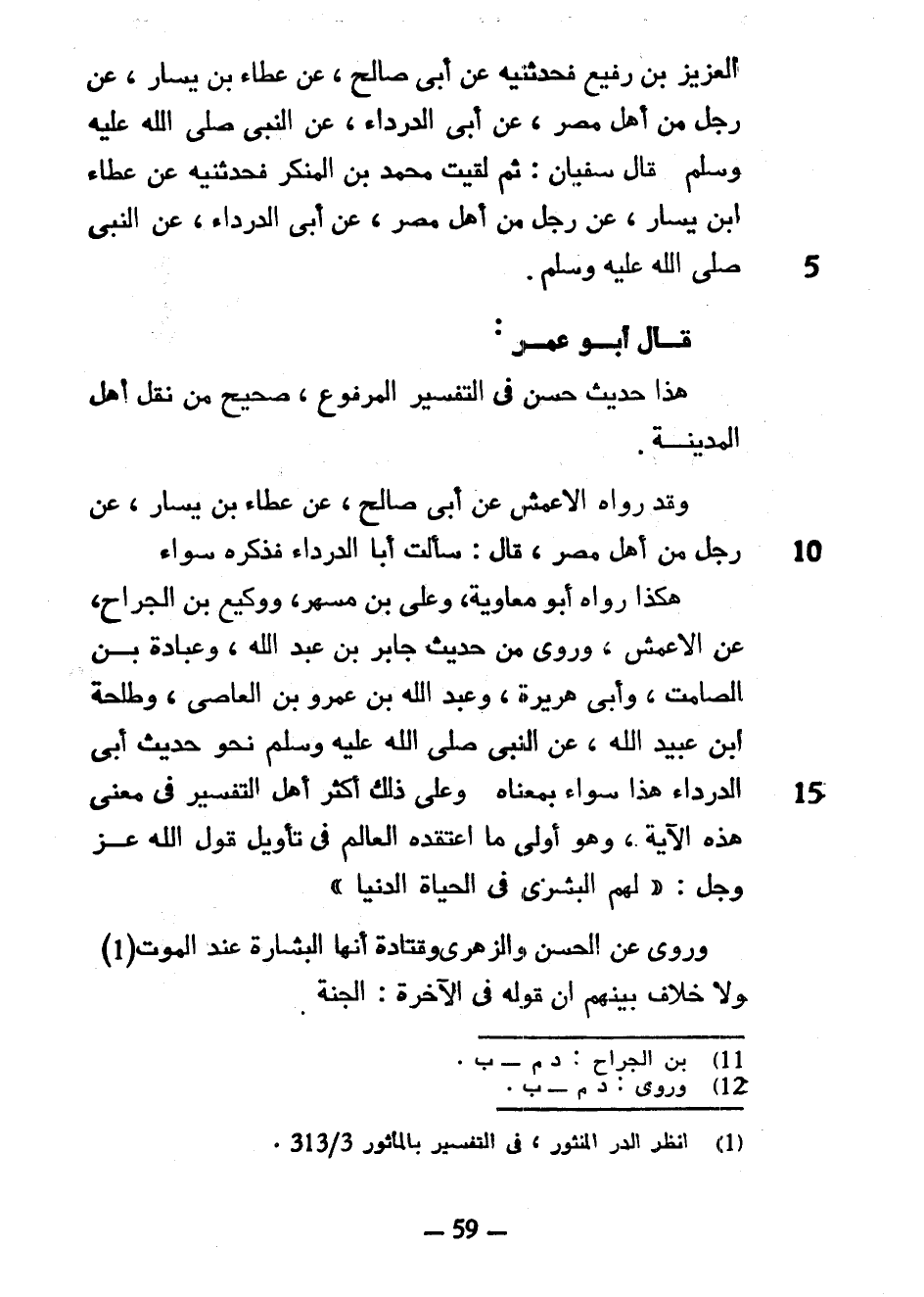 بْنَ رُفَيْعٍ فَحَدَّثَنِيهِ عَنْ أَبِي صَالِحٍ عَنْ عَطَاءِ بْنِ يَسَارٍ عَنْ رَجُلٍ مِنْ أهل مِصْرَ عَنْ أَبِي الدَّرْدَاءِ عَنِ النَّبِيِّ صَلَّى اللَّهُ عَلَيْهِ وَسَلَّمَ قَالَ سُفْيَانُ ثُمَّ لَقِيتُ محمد بن المنكر! فَحَدَّثَنِيهِ عَنْ عَطَاءِ بْنِ يَسَارٍ عَنْ رَجُلٍ مِنْ أَهْلِ مِصْرَ عَنْ أَبِي الدَّرْدَاءِ عَنِ النَّبِيِّ صَلَّى اللَّهُ عَلَيْهِ وَسَلَّمَ قَالَ أَبُو عُمَرَ هَذَا حَدِيثٌ حَسَنٌ فِي التَّفْسِيرِ الْمَرْفُوعِ صَحِيحٌ مِنْ نَقْلِ أَهْلِ الْمَدِينَةِ وَقَدْ رَوَاهُ الْأَعْمَشُ عَنْ أَبِي صَالِحٍ عَنْ عَطَاءِ بْنِ يَسَارٍ عَنْ رَجُلٍ مِنْ أَهْلِ مِصْرَ قَالَ سَأَلْتُ أَبَا الدَّرْدَاءِ فَذَكَرَهُ سَوَاءً هَكَذَا رَوَاهُ أَبُو مُعَاوِيَةَ وَعَلِيُّ بْنُ مُسْهِرٍ وَوَكِيعُ بْنُ الْجَرَّاحِ عَنِ الْأَعْمَشِ وَرُوِيَ مِنْ حَدِيثِ جَابِرِ بْنِ عَبْدِ اللَّهِ وَعُبَادَةَ بْنِ الصَّامِتِ وَأَبِي هريرة وعبد الله بن عمرو بن العاصي وَطَلْحَةَ بْنِ عُبَيْدِ اللَّهِ عَنِ النَّبِيِّ صَلَّى اللَّهُ عَلَيْهِ وَسَلَّمَ نَحْوَ حَدِيثِ أَبِي الدَّرْدَاءِ هذا سواء بمعناه وَعَلَى ذَلِكَ أَكْثَرُ أَهْلِ التَّفْسِيرِ فِي مَعْنَى هَذِهِ الْآيَةِ وَهُوَ أَوْلَى مَا اعْتَقَدَهُ الْعَالِمُ فِي تَأْوِيلِ قَوْلِ اللَّهِ عَزَّ وَجَلَّ لَهُمُ الْبُشْرَى فِي الْحَيَاةِ الدُّنْيَا وَرُوِيَ عَنِ الْحَسَنِ وَالزُّهْرِيِّ وَقَتَادَةَ أَنَّهَا الْبِشَارَةُ عِنْدَ الْمَوْتِ وَلَا خِلَافَ بَيْنَهُمْ أَنَّ قَوْلَهُ فِي الْآخِرَةِ الْجَنَّةُ