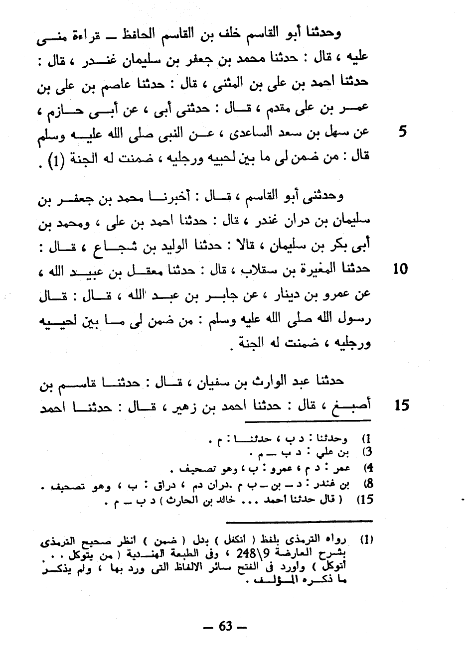 وَحَدَّثَنَا أَبُو الْقَاسِمِ خَلَفُ بْنُ الْقَاسِمِ الْحَافِظُ قِرَاءَةً مِنِّي عَلَيْهِ قَالَ حَدَّثَنَا مُحَمَّدُ بْنُ جَعْفَرِ بْنِ سُلَيْمَانَ غُنْدَرٌ قَالَ حَدَّثَنَا أَحْمَدُ بْنُ عَلِيِّ بْنِ الْمُثَنَّى قَالَ حَدَّثَنَا عَاصِمُ بْنُ عَلِيِّ بْنِ عُمَرَ بْنِ عَلِيٍّ مُقَدَّمٌ قَالَ حَدَّثَنِي أَبِي عَنْ أَبِي حَازِمٍ عَنْ سَهْلِ بْنِ سَعْدٍ السَّاعِدِيِّ عَنِ النَّبِيِّ صَلَّى اللَّهُ عَلَيْهِ وَسَلَّمَ قَالَ مَنْ ضَمِنَ لِي مَا بَيْنَ لَحْيَيْهِ وَرِجْلَيْهِ ضَمِنْتُ لَهُ الْجَنَّةَ وَحَدَّثَنِي أَبُو الْقَاسِمِ قَالَ أَخْبَرَنَا مُحَمَّدُ بْنُ جَعْفَرِ بْنِ سُلَيْمَانَ بْنِ دُرَّانَ غُنْدَرٌ قَالَ حَدَّثَنَا أَحْمَدُ بْنُ عَلِيٍّ وَمُحَمَّدُ بْنُ أَبِي بَكْرِ بْنِ سُلَيْمَانَ قَالَا حَدَّثَنَا الْوَلِيدُ بْنُ شُجَاعٍ قَالَ حَدَّثَنَا الْمُغِيرَةُ بْنُ سِقْلَابٍ قَالَ حَدَّثَنَا مَعْقِلُ بْنُ عُبَيْدِ اللَّهِ عَنْ عَمْرِو بْنِ دِينَارٍ عَنْ جَابِرِ بْنِ عَبْدِ اللَّهِ قَالَ قَالَ رَسُولُ اللَّهِ صَلَّى اللَّهُ عَلَيْهِ وسلم من ضمن لي ما بين لحييه وَرِجْلَيْهِ ضَمِنْتُ لَهُ الْجَنَّةَ حَدَّثَنَا عَبْدُ الْوَارِثِ بْنُ سُفْيَانَ قَالَ حَدَّثَنَا قَاسِمُ بْنُ أَصْبَغَ قَالَ حَدَّثَنَا أَحْمَدُ بْنُ زهير قال حدثنا أحمد