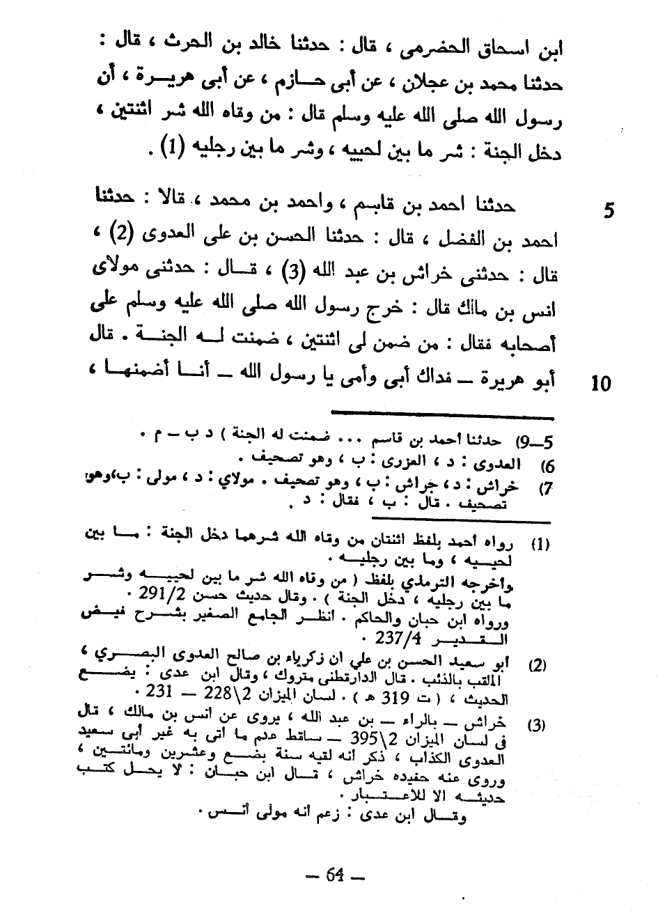 ابن اسحاق الحضرمي قال حدثنا خالد بن الحرث قَالَ حَدَّثَنَا مُحَمَّدُ بْنُ عَجْلَانَ عَنْ أَبِي حَازِمٍ عَنْ أَبِي هُرَيْرَةَ أَنَّ رَسُولَ اللَّهِ صَلَّى اللَّهُ عَلَيْهِ وَسَلَّمَ قَالَ مَنْ وَقَاهُ اللَّهُ شَرَّ اثْنَتَيْنِ دَخَلَ الْجَنَّةَ شَرَّ مَا بَيْنَ لَحْيَيْهِ وَشَرَّ مَا بَيْنَ رِجْلَيْهِ حَدَّثَنَا أَحْمَدُ بْنُ قَاسِمٍ وَأَحْمَدُ بْنُ مُحَمَّدٍ قَالَا حَدَّثَنَا أَحْمَدُ بْنُ الْفَضْلِ قَالَ حَدَّثَنَا الْحَسَنُ بْنُ عَلِيٍّ الْعَدَوِيُّ قَالَ حَدَّثَنِي خِرَاشُ بْنُ عَبْدِ اللَّهِ قَالَ حَدَّثَنِي مَوْلَايَ أَنَسُ بْنُ مَالِكٍ قَالَ خَرَجَ رَسُولُ اللَّهِ صَلَّى اللَّهُ عَلَيْهِ وَسَلَّمَ عَلَى أَصْحَابِهِ فَقَالَ مَنْ ضَمِنَ لِي اثْنَتَيْنِ ضَمِنْتُ لَهُ الْجَنَّةَ قَالَ أَبُو هُرَيْرَةَ فِدَاكَ أَبِي وَأُمِّي يَا رَسُولَ اللَّهِ أنا أضمنها