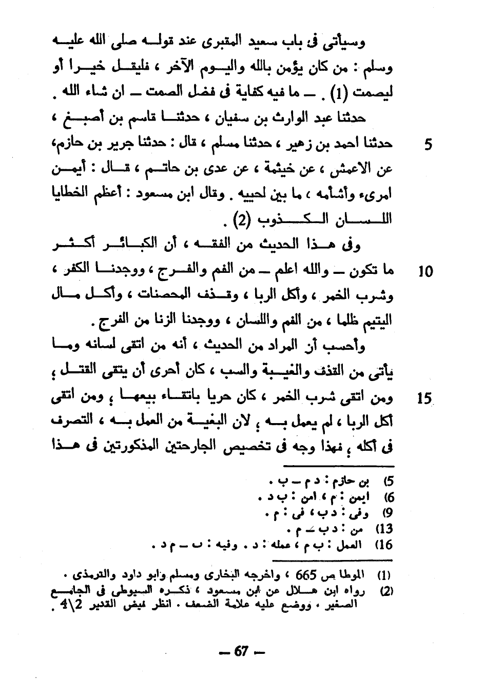 وسيأتي في باب سعيدالمقبري عِنْدَ قَوْلِهِ صَلَّى اللَّهُ عَلَيْهِ وَسَلَّمَ مَنْ كَانَ يُؤْمِنُ بِاللَّهِ وَالْيَوْمِ الْآخِرِ فَلْيَقُلْ خَيْرًا أَوْ لِيَصْمُتْ مَا فِيهِ كِفَايَةٌ فِي فَضْلِ الصَّمْتِ إِنْ شَاءَ اللَّهُ حَدَّثَنَا عَبْدُ الْوَارِثِ بْنُ سُفْيَانَ حَدَّثَنَا قَاسِمُ بْنُ أَصْبَغَ حَدَّثَنَا أَحْمَدُ بْنُ زُهَيْرٍ حَدَّثَنَا مُسْلِمٌ قَالَ حَدَّثَنَا جَرِيرُ بْنُ حَازِمٍ عَنِ الْأَعْمَشِ عَنْ خَيْثَمَةَ عن عدي بن حاتم قال أيمن امرىء وَأَشْأَمُهُ مَا بَيْنَ لَحْيَيْهِ وَقَالَ ابْنُ مَسْعُودٍ أَعْظَمُ الْخَطَايَا اللِّسَانُ الْكَذُوبُ وَفِي هَذَا الْحَدِيثِ مِنَ الْفِقْهِ أَنَّ الْكَبَائِرَ أَكْثَرُ مَا تَكُونُ وَاللَّهُ أَعْلَمُ مِنَ الْفَمِ وَالْفَرْجِ وَوَجَدْنَا الْكُفْرَ وَشُرْبَ الْخَمْرِ وَأَكْلَ الرِّبَا وَقَذْفَ الْمُحْصَنَاتِ وَأَكْلَ مَالِ الْيَتِيمِ ظُلْمًا مِنَ الْفَمِ وَاللِّسَانِ وَوَجَدْنَا الزِّنَا مِنَ الْفَرْجِ وَأَحْسَبُ أَنَّ الْمُرَادَ مِنَ الْحَدِيثِ أَنَّهُ مَنِ اتَّقَى لِسَانَهُ وَمَا يَأْتِي مِنَ الْقَذْفِ وَالْغِيبَةِ وَالسَّبِّ كَانَ أَحْرَى أَنْ يَتَّقِيَ الْقَتْلَ وَمَنِ اتَّقَى شُرْبَ الْخَمْرِ كَانَ حَرِيًّا بِاتِّقَاءِ بَيْعِهَا وَمَنِ اتَّقَى أَكْلَ الرِّبَا لَمْ يَعْمَلْ بِهِ لِأَنَّ الْبُغْيَةَ مِنَ الْعَمَلِ بِهِ التَّصَرُّفُ فِي أَكْلِهِ فَهَذَا وَجْهٌ فِي تَخْصِيصِ الْجَارِحَتَيْنِ الْمَذْكُورَتَيْنِ فِي هَذَا