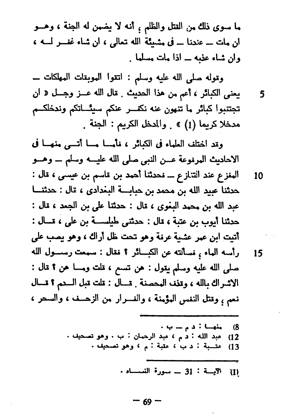 مَا سِوَى ذَلِكَ مِنَ الْقَتْلِ وَالظُّلْمِ أَنَّهُ لَا يُضْمَنُ لَهُ الْجَنَّةُ وَهُوَ إِنْ مَاتَ عِنْدَنَا فِي مَشِيئَةِ اللَّهِ تَعَالَى إِنْ شَاءَ غَفَرَ لَهُ وَإِنْ شَاءَ عَذَّبَهُ إِذَا مَاتَ مُسْلِمًا وَقَوْلُهُ صَلَّى اللَّهُ عَلَيْهِ وَسَلَّمَ اتَّقُوا الْمُوبِقَاتِ الْمُهْلِكَاتِ يَعْنِي الْكَبَائِرَ أَعَمُّ مِنْ هَذَا الْحَدِيثِ قَالَ اللَّهِ عَزَّ وَجَلَّ إِنْ تَجْتَنِبُوا كَبَائِرَ مَا تُنْهَوْنَ عَنْهُ نُكَفِّرْ عَنْكُمْ سَيِّئَاتِكُمْ وَنُدْخِلْكُمْ مُدْخَلًا كَرِيمًا وَالْمُدْخَلُ الْكَرِيمُ الْجَنَّةُ وَقَدِ اخْتَلَفَ الْعُلَمَاءُ فِي الْكَبَائِرِ فَأَمَّا مَا أَتَى مِنْهَا فِي الْأَحَادِيثِ الْمَرْفُوعَةِ عَنِ النَّبِيِّ صَلَّى اللَّهُ عَلَيْهِ وَسَلَّمَ وَهُوَ الْمَفْزَعُ عِنْدَ التَّنَازُعِ فَحَدَّثْنَا أَحْمَدُ بْنُ قَاسِمِ بْنِ عِيسَى قَالَ حَدَّثَنَا عُبَيْدُ اللَّهِ بْنُ مُحَمَّدِ بْنِ حُبَابَةَ الْبَغْدَادِيُّ قَالَ حَدَّثَنَا عَبْدُ اللَّهِ بْنُ مُحَمَّدٍ الْبَغَوِيُّ قَالَ حَدَّثَنَا عَلِيُّ بْنُ الْجَعْدِ قَالَ حَدَّثَنَا أَيُّوبُ بْنُ عُتْبَةَ قَالَ حَدَّثَنِي طَيْلَسَةُ بْنُ عَلِيٍّ قَالَ أَتَيْتُ ابْنَ عُمَرَ عَشِيَّةَ عَرَفَةَ وَهُوَ تَحْتَ ظِلِّ أَرَاكٍ وَهُوَ يَصُبُّ عَلَى رَأْسِهِ الْمَاءَ فَسَأَلْتُهُ عَنِ الْكَبَائِرِ فَقَالَ سَمِعْتُ رَسُولَ اللَّهِ صَلَّى اللَّهُ عَلَيْهِ وسلم يَقُولُ هُنَّ تِسْعٌ قُلْتُ وَمَا هُنَّ قَالَ الْإِشْرَاكُ بِاللَّهِ وَقَذْفُ الْمُحْصَنَةِ قَالَ قُلْتُ قَبْلَ الدَّمِ قَالَ نَعَمْ وَقَتْلُ النَّفْسِ الْمُؤْمِنَةِ وَالْفِرَارُ مِنَ الزَّحْفِ وَالسِّحْرُ