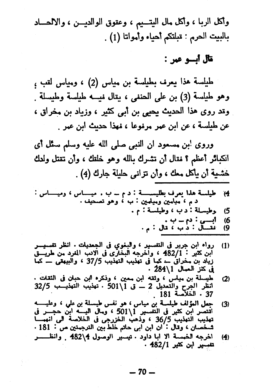 وَأَكْلُ الرِّبَا وَأَكْلُ مَالِ الْيَتِيمِ وَعُقُوقُ الْوَالِدَيْنِ وَالْإِلْحَادُ بِالْبَيْتِ الْحَرَمِ قِبْلَتِكُمْ أَحْيَاءً وَأَمْوَاتًا قَالَ أَبُو عُمَرَ طَيْلَسَةُ هَذَا يُعْرَفُ بَطَيْلَسَةَ بْنِ مَيَّاسٍ وَمَيَّاسٌ لَقَبٌ وَهُوَ طَيْلَسَةُ بْنُ عَلِيٍّ الْحَنَفِيُّ يُقَالُ فِيهِ طَيْلَسَةُ وَطَيْسَلَةُ وَقَدْ رَوَى هَذَا الْحَدِيثَ يَحْيَى بْنُ أَبِي كَثِيرٍ وَزِيَادُ بْنُ مِخْرَاقٍ عَنْ طَيْلَسَةَ عَنِ ابْنِ عُمَرَ مَرْفُوعًا فَهَذَا حَدِيثُ ابْنِ عُمَرَ وَرَوَى ابْنُ مَسْعُودٍ أَنَّ النَّبِيَّ صَلَّى اللَّهُ عَلَيْهِ وَسَلَّمَ سُئِلَ أَيُّ الْكَبَائِرِ أَعْظَمُ فَقَالَ أَنْ تُشْرِكَ بِاللَّهِ وَهُوَ خَلَقَكَ وَأَنْ تَقْتُلَ وَلَدَكَ خَشْيَةَ أَنْ يَأْكُلَ مَعَكَ وَأَنْ تُزَانِيَ حَلِيلَةَ جَارِكَ