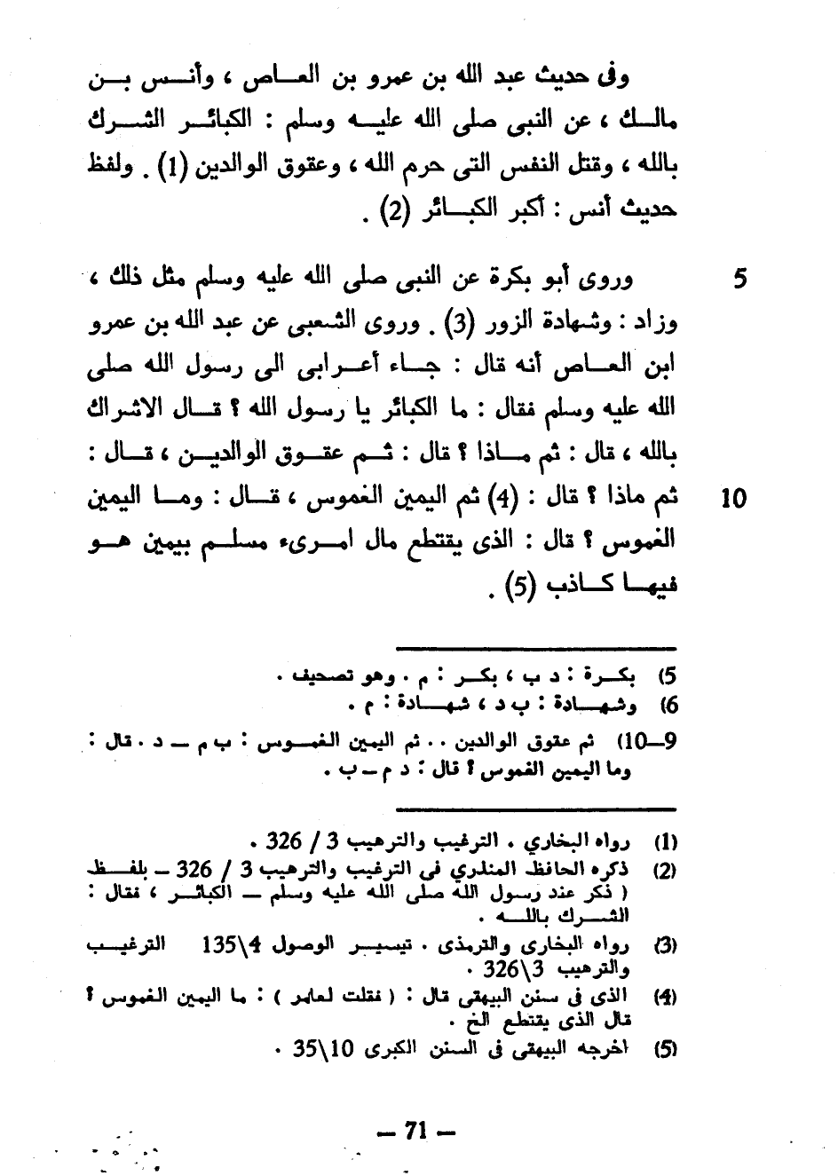 وَفِي حَدِيثِ عَبْدِ اللَّهِ بْنِ عَمْرِو بْنِ الْعَاصِ وَأَنَسِ بْنِ مَالِكٍ عَنِ النَّبِيِّ صَلَّى اللَّهُ عَلَيْهِ وَسَلَّمَ الْكَبَائِرُ الشِّرْكُ بِاللَّهِ وَقَتْلُ النَّفْسِ الَّتِي حَرَّمَ اللَّهُ وَعُقُوقُ الْوَالِدَيْنِ وَلَفْظُ حَدِيثِ أَنَسٍ أَكْبَرُ الْكَبَائِرِ وَرَوَى أَبُو بَكْرَةَ عَنِ النَّبِيِّ صَلَّى اللَّهُ عَلَيْهِ وَسَلَّمَ مِثْلَ ذَلِكَ وَزَادَ وَشَهَادَةُ الزُّورِ وَرَوَى الشَّعْبِيُّ عَنْ عَبْدِ اللَّهِ بْنِ عَمْرِو بْنِ الْعَاصِ أَنَّهُ قَالَ جَاءَ أَعْرَابِيٌّ إِلَى رَسُولِ اللَّهِ صَلَّى اللَّهُ عَلَيْهِ وَسَلَّمَ فَقَالَ مَا الْكَبَائِرُ يَا رَسُولَ اللَّهِ قَالَ الْإِشْرَاكُ بِاللَّهِ قَالَ ثُمَّ مَاذَا قَالَ ثُمَّ عُقُوقُ الْوَالِدَيْنِ قَالَ ثُمَّ مَاذَا قَالَ ثُمَّ الْيَمِينُ الْغَمُوسُ قَالَ وَمَا اليمين الغموس قال الذي يقتطع مال امرىء مُسْلِمٍ بِيَمِينٍ هُوَ فِيهَا كَاذِبٌ