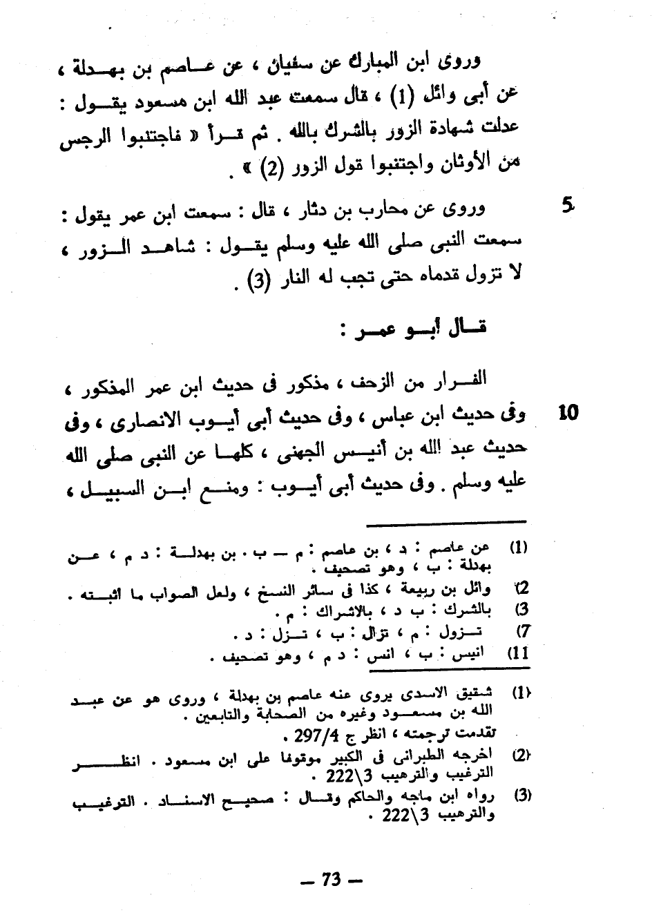 وَرَوَى ابْنُ الْمُبَارَكِ عَنْ سُفْيَانَ عَنْ عَاصِمِ بْنِ بَهْدَلَةَ عَنْ أَبِي وَائِلٍ قَالَ سَمِعْتُ عَبْدَ اللَّهِ بْنَ مَسْعُودٍ يَقُولُ عَدَلَتْ شَهَادَةُ الزُّورِ بِالشِّرْكِ بِاللَّهِ ثُمَّ قَرَأَ فَاجْتَنِبُوا الرِّجْسَ مِنَ الْأَوْثَانِ وَاجْتَنِبُوا قَوْلَ الزُّورِ وَرُوِيَ عَنْ مُحَارِبِ بْنِ دِثَارٍ قَالَ سَمِعْتُ ابْنَ عُمَرَ يَقُولُ سَمِعْتُ النَّبِيَّ صَلَّى اللَّهُ عَلَيْهِ وَسَلَّمَ يَقُولُ شَاهِدُ الزُّورِ لَا تَزُولُ قَدَمَاهُ حَتَّى تَجِبُ لَهُ النَّارُ قَالَ أَبُو عُمَرَ الْفِرَارُ مِنَ الزَّحْفِ مَذْكُورٌ فِي حَدِيثِ ابْنِ عُمَرَ الْمَذْكُورِ وَفِي حَدِيثِ ابْنِ عَبَّاسٍ وَفِي حَدِيثِ أَبِي أَيُّوبَ الْأَنْصَارِيِّ وَفِي حَدِيثِ عَبْدِ اللَّهِ بْنِ أُنَيْسٍ الْجُهَنِيِّ كُلُّهَا عَنِ النَّبِيِّ صَلَّى اللَّهُ عَلَيْهِ وَسَلَّمَ وَفِي حَدِيثِ أَبِي أَيُّوبَ وَمَنْعُ ابْنِ السَّبِيلِ