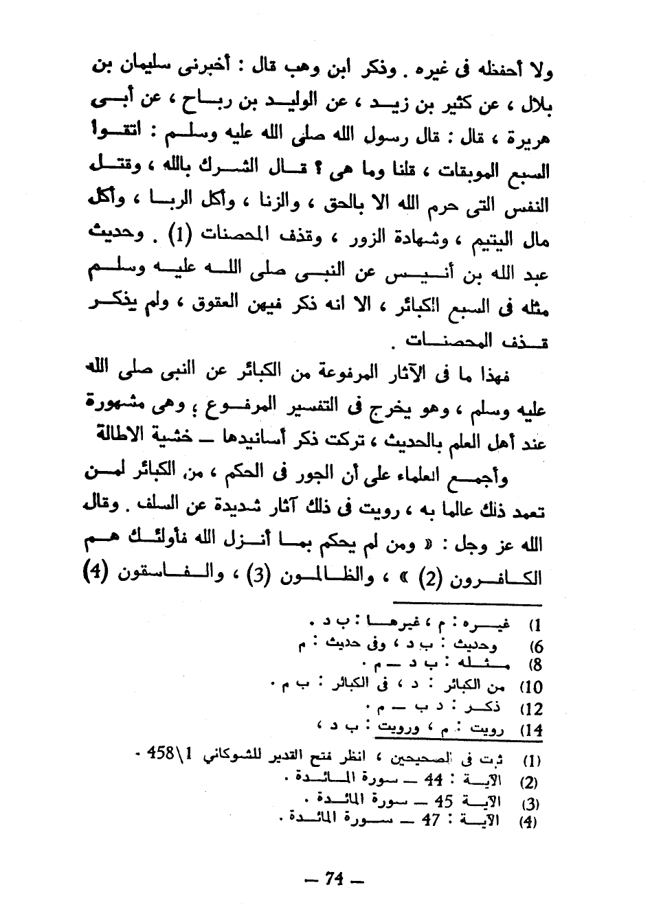 وَلَا أَحْفَظُهُ فِي غَيْرِهِ وَذَكَرَ ابْنُ وَهْبٍ قَالَ أَخْبَرَنِي سُلَيْمَانُ بْنُ بِلَالٍ عَنْ كَثِيرِ بْنِ زَيْدٍ عَنِ الْوَلِيدِ بْنِ رَبَاحٍ عَنْ أَبِي هُرَيْرَةَ قَالَ قَالَ رَسُولُ اللَّهِ صَلَّى اللَّهُ عَلَيْهِ وَسَلَّمَ اتَّقُوا السَّبْعَ الْمُوبِقَاتِ قُلْنَا وَمَا هِيَ قَالَ الشِّرْكُ بِاللَّهِ وَقَتْلُ النَّفْسِ الَّتِي حَرَّمَ اللَّهُ إِلَّا بِالْحَقِّ وَالزِّنَا وَأَكْلُ الرِّبَا وَأَكْلُ مَالِ الْيَتِيمِ وَشَهَادَةُ الزُّورِ وَقَذْفُ الْمُحْصَنَاتِ وَحَدِيثُ عَبْدِ اللَّهِ بْنِ أُنَيْسٍ عَنِ النَّبِيِّ صَلَّى اللَّهُ عَلَيْهِ وَسَلَّمَ مِثْلُهُ فِي السَّبْعِ الْكَبَائِرِ إِلَّا أَنَّهُ ذَكَرَ فِيهِنَّ الْعُقُوقَ وَلَمْ يَذْكُرْ قَذْفَ الْمُحْصَنَاتِ فَهَذَا مَا فِي الْآثَارِ الْمَرْفُوعَةِ مِنَ الْكَبَائِرِ عَنِ النَّبِيِّ صَلَّى اللَّهُ عَلَيْهِ وَسَلَّمَ وَهُوَ يَخْرُجُ فِي التَّفْسِيرِ الْمَرْفُوعِ وَهِيَ مَشْهُورَةٌ عِنْدَ أَهْلِ الْعِلْمِ بِالْحَدِيثِ تركت ذكر أسانيدها خشيةالإطالة وَأَجْمَعَ الْعُلَمَاءُ عَلَى أَنَّ الْجَوْرَ فِي الْحُكْمِ مِنَ الْكَبَائِرِ لِمَنْ تَعَمَّدَ ذَلِكَ عَالِمًا بِهِ رُوِيَتْ فِي ذَلِكَ آثَارٌ شَدِيدَةٌ عَنِ السَّلَفِ وَقَالَ اللَّهُ عَزَّ وَجَلَّ وَمَنْ لَمْ يَحْكُمْ بِمَا أَنْزَلَ اللَّهُ فَأُولَئِكَ هُمُ الْكَافِرُونَ وَالظَّالِمُونَ والفاسقون