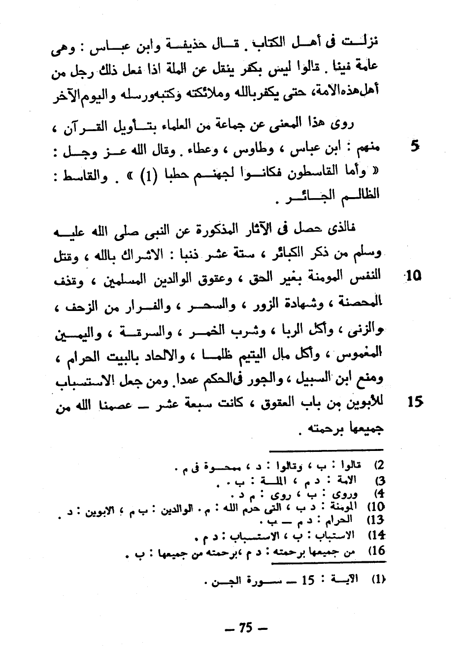 نَزَلَتْ فِي أَهْلِ الْكِتَابِ قَالَ حُذَيْفَةُ وَابْنُ عَبَّاسٍ وَهِيَ عَامَّةٌ فِينَا قَالُوا لَيْسَ بِكُفْرٍ يَنْقُلُ عَنِ الْمِلَّةِ إِذَا فَعَلَ ذَلِكَ رَجُلٌ مِنْ أَهْلِ هَذِهِ الْأُمَّةِ حَتَّى يَكْفُرَ بِاللَّهِ وَمَلَائِكَتِهِ وَكُتُبِهِ وَرُسُلِهِ وَالْيَوْمِ الْآخِرِ رُوِيَ هَذَا الْمَعْنَى عَنْ جَمَاعَةٍ مِنَ الْعُلَمَاءِ بِتَأْوِيلِ الْقُرْآنِ مِنْهُمُ ابْنُ عَبَّاسٍ وَطَاوُسٌ وَعَطَاءٌ وَقَالَ اللَّهُ عَزَّ وَجَلَّ وَأَمَّا الْقَاسِطُونَ فَكَانُوا لِجَهَنَّمَ حَطَبًا وَالْقَاسِطُ الظَّالِمُ الْجَائِرُ فَالَّذِي حَصَلَ فِي الْآثَارِ الْمَذْكُورَةِ عَنِ النَّبِيِّ صَلَّى اللَّهُ عَلَيْهِ وَسَلَّمَ مِنْ ذِكْرِ الْكَبَائِرِ سِتَّةَ عَشَرَ ذَنْبًا الْإِشْرَاكُ بِاللَّهِ وَقَتْلُ النَّفْسِ الْمُؤْمِنَةِ بِغَيْرِ الْحَقِّ وَعُقُوقُ الْوَالِدَيْنِ الْمُسْلِمَيْنِ وَقَذْفُ الْمُحْصَنَةِ وَشَهَادَةُ الزُّورِ وَالسِّحْرُ وَالْفِرَارُ مِنَ الزَّحْفِ وَالزِّنَى وَأَكْلُ الرِّبَا وَشُرْبُ الخمر والسرقة واليمين المغموس وَأَكْلُ مَالِ الْيَتِيمِ ظُلْمًا وَالْإِلْحَادُ بِالْبَيْتِ الْحَرَامِ وَمَنْعُ ابْنِ السَّبِيلِ وَالْجَوْرُ فِي الْحُكْمِ عَمْدًا وَمَنْ جَعَلَ الِاسْتِسْبَابَ لِلْأَبَوَيْنِ مِنْ بَابِ الْعُقُوقِ كَانَتْ سَبْعَةَ عَشَرَ عَصَمَنَا اللَّهُ مِنْ جَمِيعِهَا برحمته