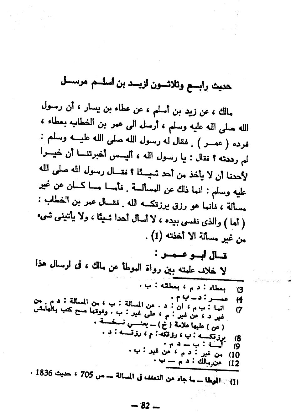 حَدِيثٌ رَابِعٌ وَثَلَاثُونَ لِزَيْدِ بْنِ أَسْلَمَ مُرْسَلٌ مالك عَنْ زَيْدِ بْنِ أَسْلَمَ عَنْ عَطَاءِ بْنِ يَسَارٍ أَنَّ رَسُولَ اللَّهِ صَلَّى اللَّهُ عَلَيْهِ وَسَلَّمَ أَرْسَلَ إِلَى عُمَرَ بْنِ الْخَطَّابِ بِعَطَاءٍ فَرَدَّهُ (عُمَرُ) فَقَالَ لَهُ رَسُولُ اللَّهِ صَلَّى اللَّهُ عَلَيْهِ وَسَلَّمَ لِمَ رَدَدْتَهُ فَقَالَ يَا رَسُولَ اللَّهِ أَلَيْسَ أَخْبَرْتَنَا أَنَّ خَيْرًا لِأَحَدِنَا أَنْ لَا يَأْخُذَ مَنْ أَحَدٍ شَيْئًا فَقَالَ رَسُولُ اللَّهِ صَلَّى اللَّهُ عَلَيْهِ وَسَلَّمَ إِنَّمَا ذَلِكَ عَنِ الْمَسْأَلَةِ فَأَمَّا مَا كَانَ عَنْ غَيْرِ مَسْأَلَةٍ فَإِنَّمَا هُوَ رِزْقٌ يَرْزُقُكَهُ اللَّهُ فَقَالَ عُمَرُ بْنُ الْخَطَّابِ (أَمَا) وَالَّذِي نَفْسِي بِيَدِهِ لَا أَسْأَلُ أَحَدًا شَيْئًا وَلَا يَأْتِينِي شَيْءٌ مِنْ غَيْرِ مَسْأَلَةٍ إِلَّا أَخَذْتُهُ قال أبو عمر لا خلاف علمته بن رُوَاةِ الْمُوَطَّإِ عَنْ مَالِكٍ فِي إِرْسَالِ هَذَا