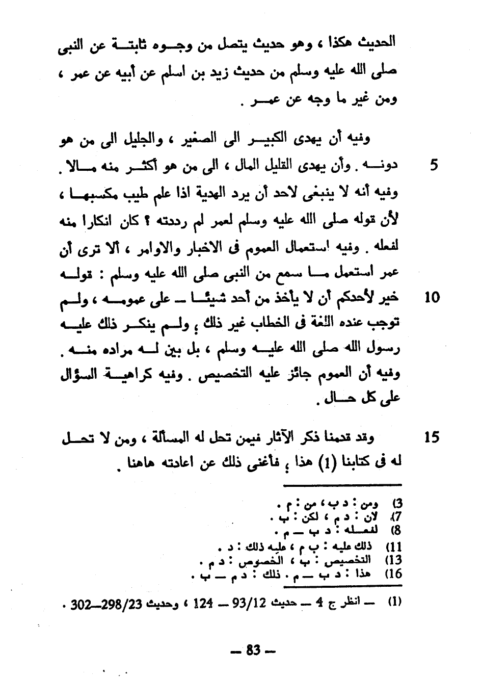 الْحَدِيثِ هَكَذَا وَهُوَ حَدِيثٌ يَتَّصِلُ مِنْ وُجُوهٍ ثَابِتَةٌ عَنِ النَّبِيِّ صَلَّى اللَّهُ عَلَيْهِ وَسَلَّمَ مِنْ حَدِيثِ زَيْدِ بْنِ أَسْلَمَ عَنْ أَبِيهِ عَنْ عُمَرَ وَمِنْ غَيْرِ مَا وَجْهٍ عَنْ عُمَرَ وَفِيهِ أَنْ يُهْدِيَ الْكَبِيرُ إِلَى الصَّغِيرِ وَالْجَلِيلُ إِلَى مَنْ هُوَ دُونَهُ وَأَنْ يُهْدِيَ الْقَلِيلُ الْمَالِ إِلَى مَنْ هُوَ أَكْثَرُ مِنْهُ مَالًا وَفِيهِ أَنَّهُ لَا يَنْبَغِي لِأَحَدٍ أَنْ يَرُدَّ الْهَدِيَّةَ إِذَا عَلِمَ طِيبَ مَكْسَبِهَا لِأَنَّ قَوْلَهُ صَلَّى اللَّهُ عَلَيْهِ وَسَلَّمَ لِعُمَرَ لِمَ رَدَدْتَهُ كَانَ إِنْكَارًا مِنْهُ لِفِعْلِهِ وَفِيهِ اسْتِعْمَالُ الْعُمُومِ فِي الْأَخْبَارِ وَالْأَوَامِرِ أَلَا تَرَى أَنَّ عُمَرَ اسْتَعْمَلَ مَا سَمِعَ مِنَ النَّبِيِّ صَلَّى اللَّهُ عَلَيْهِ وَسَلَّمَ قَوْلَهُ خَيْرٌ لِأَحَدِكُمْ أَنْ لَا يَأْخُذَ مِنْ أَحَدٍ شَيْئًا عَلَى عُمُومِهِ وَلَمْ تُوجِبْ عِنْدَهُ اللُّغَةُ فِي الْخِطَابِ غَيْرَ ذَلِكَ وَلَمْ يُنْكِرْ ذَلِكَ عَلَيْهِ رَسُولُ اللَّهِ صَلَّى اللَّهُ عَلَيْهِ وَسَلَّمَ بَلْ بَيَّنَ لَهُ مُرَادَهُ مِنْهُ وَفِيهِ أَنَّ الْعُمُومَ جَائِزٌ عَلَيْهِ التَّخْصِيصُ وَفِيهِ كَرَاهِيَةُ السُّؤَالِ عَلَى كُلِّ حَالٍ وَقَدْ قَدَّمْنَا ذِكْرَ الْآثَارِ فِيمَنْ تَحِلُّ لَهُ الْمَسْأَلَةُ وَمَنْ لَا تَحِلُّ لَهُ فِي كِتَابِنَا هَذَا فَأَغْنَى ذَلِكَ عَنْ إِعَادَتِهِ هَاهُنَا