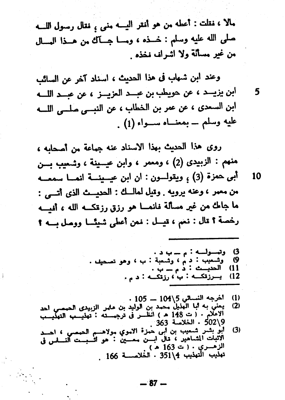 مَالًا فَقُلْتُ أَعْطِهِ مَنْ هُوَ أَفْقَرُ إِلَيْهِ مِنِّي فَقَالَ رَسُولُ اللَّهِ صَلَّى اللَّهُ عَلَيْهِ وَسَلَّمَ خُذْهُ وَمَا جَاءَكَ مِنْ هَذَا الْمَالِ مِنْ غَيْرِ مَسْأَلَةٍ وَلَا إِشْرَافٍ فَخُذْهُ وَعِنْدَ ابْنِ شِهَابٍ فِي هَذَا الْحَدِيثِ إِسْنَادٌ آخَرُ عَنِ السَّائِبِ بْنِ يَزِيدَ عَنْ حُوَيْطِبِ بْنِ عَبْدِ الْعَزِيزِ عَنْ عَبْدِ اللَّهِ بْنِ السَّعْدِيِّ عَنْ عُمَرَ بْنِ الْخَطَّابِ عَنِ النَّبِيِّ صَلَّى اللَّهُ عَلَيْهِ وَسَلَّمَ بِمَعْنَاهُ سَوَاءً رَوَى هَذَا الْحَدِيثَ بِهَذَا الْإِسْنَادِ عَنْهُ جَمَاعَةٌ مِنْ أَصْحَابِهِ مِنْهُمُ الزُّبَيْدِيُّ وَمَعْمَرٌ وَابْنُ عُيَيْنَةَ وَشُعَيْبُ بْنُ أَبِي حَمْزَةَ وَيَقُولُونَ إِنَّ ابْنَ عُيَيْنَةَ إِنَّمَا سَمِعَهُ مِنْ مَعْمَرٍ وَعَنْهُ يَرْوِيهِ وَقِيلَ لِمَالِكٍ الْحَدِيثُ الَّذِي أَتَى مَا جَاءَكَ مِنْ غَيْرِ مَسْأَلَةٍ فَإِنَّمَا هُوَ رِزْقٌ رَزَقَكَهُ اللَّهُ أَفِيهِ رُخْصَةٌ قَالَ نَعَمْ قِيلَ فَمَنْ أُعْطِيَ شَيْئًا وَوُصِلَ بِهِ