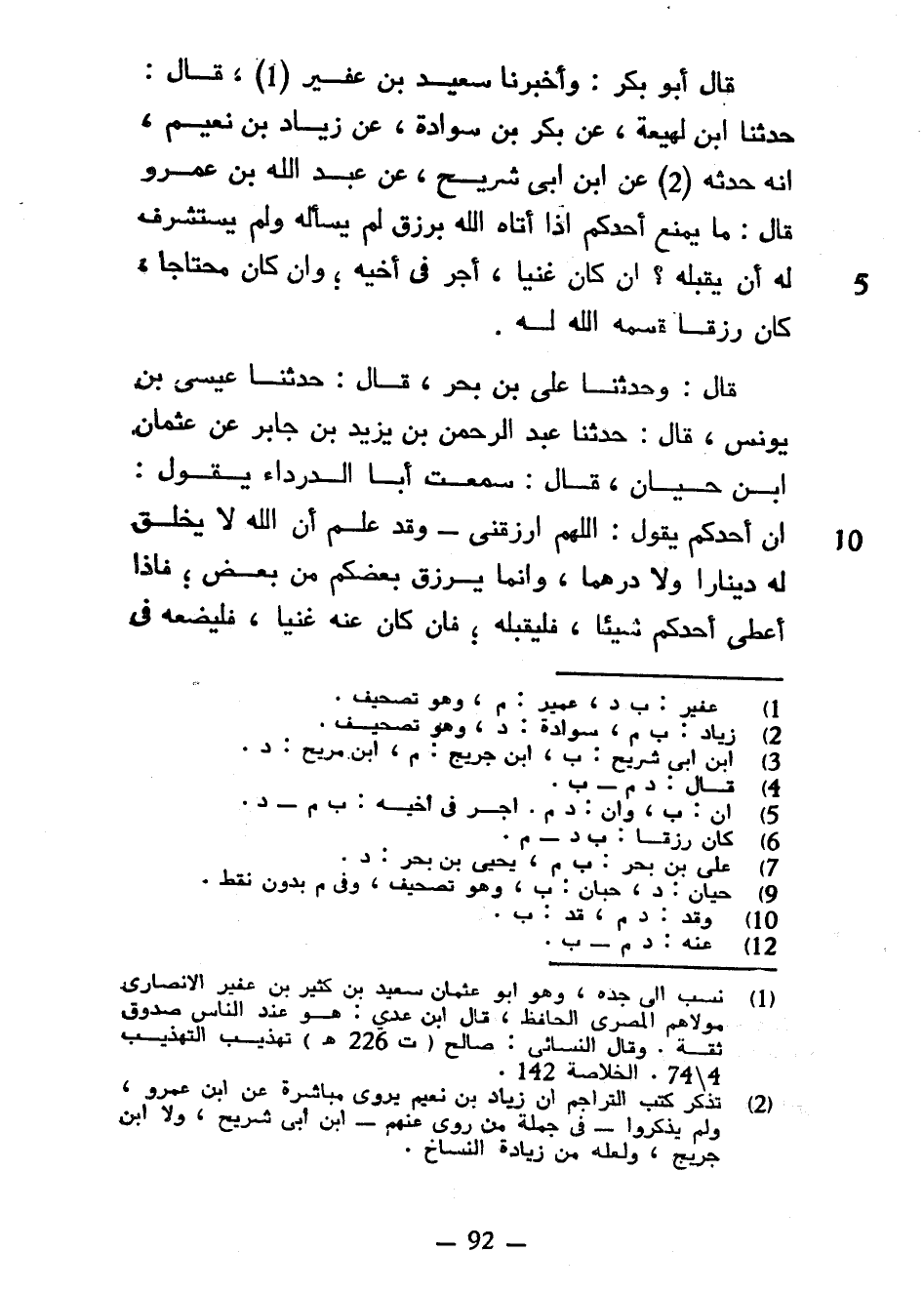 قَالَ أَبُو بَكْرٍ وَأَخْبَرَنَا سَعِيدُ بْنُ عُفَيْرٍ قَالَ حَدَّثَنَا ابْنُ لَهِيعَةَ عَنْ بَكْرِ بْنِ سَوَادَةَ عَنْ زِيَادِ بْنِ نُعَيْمٍ أَنَّهُ حَدَّثَهُ عَنِ ابْنِ أَبِي شُرَيْحٍ عَنْ عَبْدِ اللَّهِ بْنِ عَمْرٍو قَالَ مَا يَمْنَعُ أَحَدَكُمْ إِذَا أتاه الله برزق لم يسأله وَلَمْ يَسْتَشْرِفْ لَهُ أَنْ يَقْبَلَهُ إِنْ كَانَ غَنِيًّا أُجِرَ فِي أَخِيهِ وَإِنْ كَانَ مُحْتَاجًا كَانَ رِزْقًا قَسَمَهُ اللَّهُ لَهُ قَالَ وَحَدَّثَنَا عَلِيُّ بْنُ بَحْرٍ قَالَ حَدَّثَنَا عِيسَى بْنُ يُونُسَ قَالَ حَدَّثَنَا عَبْدُ الرَّحْمَنِ بْنُ يَزِيدَ بْنِ جَابِرٍ عَنْ عُثْمَانَ بْنِ حَيَّانَ قَالَ سَمِعْتُ أَبَا الدَّرْدَاءِ يَقُولُ إِنَّ أَحَدَكُمْ يَقُولُ اللَّهُمَّ ارْزُقْنِي وَقَدْ عَلِمَ أَنَّ اللَّهَ لَا يَخْلُقُ لَهُ دِينَارًا وَلَا دِرْهَمًا وَإِنَّمَا يُرْزَقُ بَعْضُكُمْ مِنْ بَعْضٍ فَإِذَا أُعْطِيَ أَحَدُكُمْ شَيْئًا فَلْيَقْبَلْهُ فَإِنْ كَانَ عَنْهُ غَنِيًّا فَلْيَضَعْهُ فِي