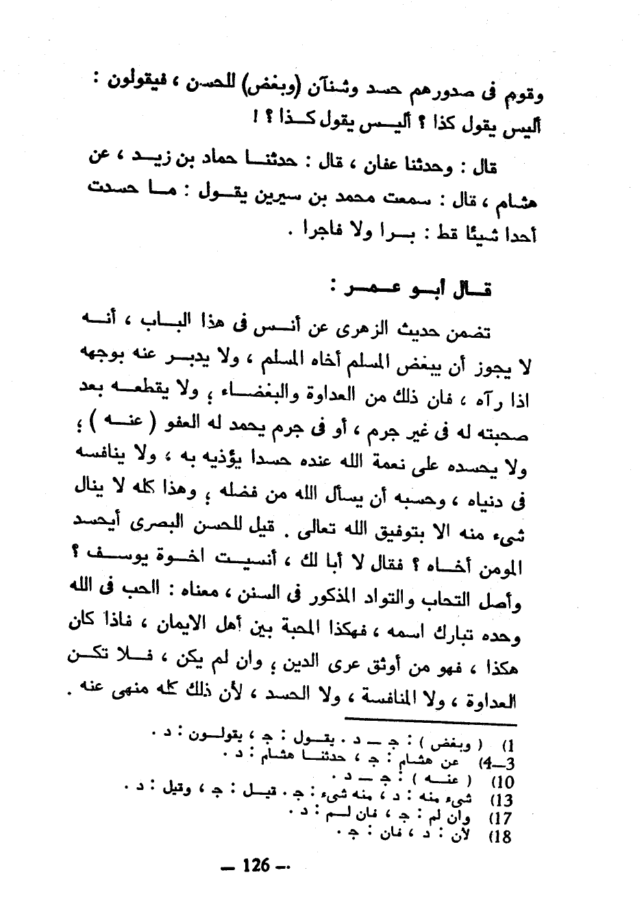 وقوم في صدورهم حدس وَشَنَآنٌ (وَبُغْضٌ) لِلْحَسَنِ فَيَقُولُونَ أَلَيْسَ يَقُولُ كَذَا أَلَيْسَ يَقُولُ كَذَا قَالَ وَحَدَّثَنَا عَفَّانُ قَالَ حَدَّثَنَا حَمَّادُ بْنُ زَيْدٍ عَنْ هِشَامِ قَالَ سَمِعْتُ مُحَمَّدَ بْنَ سِيرِينَ يَقُولُ مَا حَسَدْتُ أَحَدًا شَيْئًا قَطُّ بَرًّا وَلَا فَاجِرًا قَالَ أَبُو عُمَرَ تَضَمَّنَ حَدِيثُ الزُّهْرِيِّ عَنْ أَنَسٍ فِي هَذَا الْبَابِ أَنَّهُ لَا يَجُوزُ أَنْ يُبْغِضَ الْمُسْلِمُ أَخَاهُ الْمُسْلِمَ وَلَا يُدْبِرَ عَنْهُ بِوَجْهِهِ إِذَا رَآهُ فَإِنَّ ذَلِكَ مِنَ الْعَدَاوَةِ وَالْبَغْضَاءِ وَلَا يَقْطَعَهُ بَعْدَ صُحْبَتِهِ لَهُ فِي غَيْرِ جُرْمٍ أَوْ فِي جُرْمٍ يُحْمَدُ لَهُ الْعَفْوُ (عَنْهُ) وَلَا يَحْسُدَهُ عَلَى نِعْمَةِ اللَّهِ عِنْدَهُ حَسَدًا يُؤْذِيهِ بِهِ وَلَا يُنَافِسَهُ فِي دُنْيَاهُ وَحَسْبُهُ أَنْ يَسْأَلَ اللَّهَ مِنْ فَضْلِهِ وَهَذَا كُلُّهُ لَا يُنَالُ شَيْءٌ مِنْهُ إِلَّا بِتَوْفِيقِ اللَّهِ تَعَالَى قِيلَ لِلْحَسَنِ الْبَصْرِيِّ أَيَحْسُدُ الْمُؤْمِنُ أَخَاهُ فَقَالَ لَا أَبَا لَكَ أَنَسِيتَ إِخْوَةَ يُوسُفَ وَأَصْلُ التَّحَابِّ وَالتَّوَادِّ الْمَذْكُورِ فِي السُّنَنِ مَعْنَاهُ الْحُبُّ فِي اللَّهِ وَحْدَهُ تَبَارَكَ اسْمُهُ فَهَكَذَا الْمَحَبَّةُ بَيْنَ أَهْلِ الْإِيمَانِ فَإِذَا كَانَ هَكَذَا فَهُوَ مِنْ أَوْثَقِ عُرَى الدِّينِ وَإِنْ لَمْ يَكُنْ فَلَا تَكُنِ الْعَدَاوَةُ وَلَا الْمُنَافَسَةُ وَلَا الْحَسَدُ لِأَنَّ ذَلِكَ كُلَّهُ مَنْهِيٌّ عنه