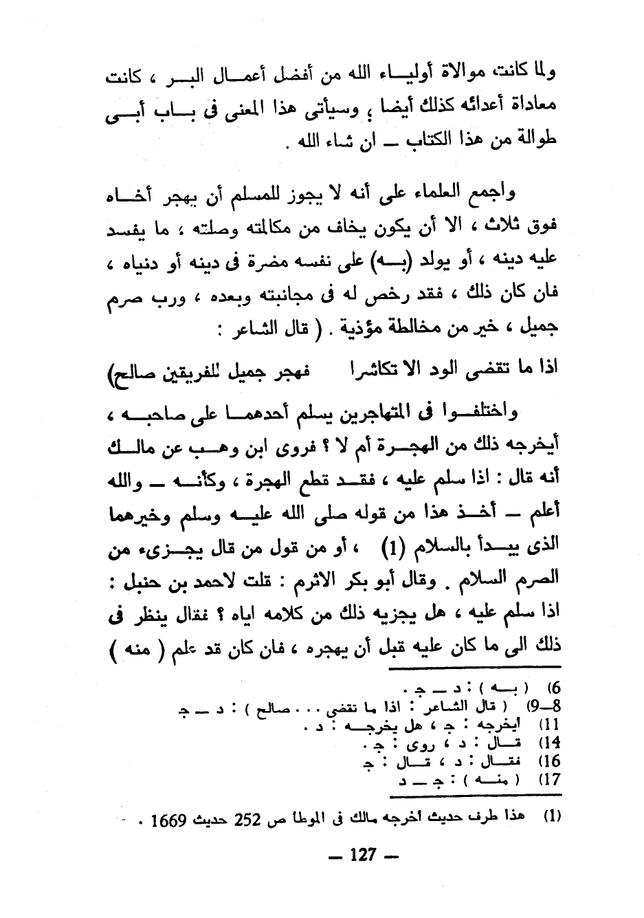 وَلَمَّا كَانَتْ مُوَالَاةُ أَوْلِيَاءِ اللَّهِ مِنْ أَفْضَلِ أَعْمَالِ الْبِرِّ كَانَتْ مُعَادَاةُ أَعْدَائِهِ كَذَلِكَ أَيْضًا وَسَيَأْتِي هَذَا الْمَعْنَى فِي بَابِ أَبِي طُوَالَةَ مِنْ هَذَا الْكِتَابِ إِنْ شَاءَ اللَّهُ وَأَجْمَعَ الْعُلَمَاءُ عَلَى أَنَّهُ لَا يَجُوزُ لِلْمُسْلِمِ أَنْ يَهْجُرَ أَخَاهُ فَوْقَ ثَلَاثٍ إِلَّا أَنْ يَكُونَ يَخَافُ مِنْ مُكَالَمَتِهِ وَصِلَتِهِ مَا يُفْسِدُ عَلَيْهِ دِينَهُ أَوْ يُوَلِّدُ (بِهِ) عَلَى نَفْسِهِ مَضَرَّةً فِي دِينِهِ أَوْ دُنْيَاهُ فَإِنْ كَانَ ذَلِكَ فَقَدْ رُخِّصَ لَهُ فِي مُجَانَبَتِهِ وَبُعْدِهِ وَرُبَّ صَرْمٍ جَمِيلٍ خَيْرٌ مِنْ مُخَالَطَةٍ مُؤْذِيَةٍ (قَالَ الشَّاعِرُ ... إِذَا مَا تَقَضَّى الْوُدُّ إِلَّا تَكَاشُرًا ... فَهَجْرٌ جَمِيلٌ لِلْفَرِيقَيْنِ صَالِحُ) وَاخْتَلَفُوا فِي الْمُتَهَاجِرَيْنِ يُسَلِّمُ أَحَدُهُمَا عَلَى صَاحِبِهِ أَيُخْرِجُهُ ذَلِكَ مِنَ الْهِجْرَةِ أَمْ لَا فَرَوَى ابْنُ وَهْبٍ عَنْ مَالِكٍ أَنَّهُ قَالَ إِذَا سَلَّمَ عَلَيْهِ فَقَدْ قَطَعَ الْهِجْرَةَ وَكَأَنَّهُ وَاللَّهُ أَعْلَمُ أَخَذَ هَذَا مِنْ قَوْلِهِ صَلَّى اللَّهُ عَلَيْهِ وَسَلَّمَ وَخَيْرُهُمَا الَّذِي يَبْدَأُ بِالسَّلَامِ أَوْ مِنْ قَوْلِ مَنْ قال يجزىء مِنَ الصَّرْمِ السَّلَامُ وَقَالَ أَبُو بَكْرٍ الْأَثْرَمُ قُلْتُ لِأَحْمَدَ بْنِ حَنْبَلٍ إِذَا سَلَّمَ عَلَيْهِ هَلْ يُجْزِيهِ ذَلِكَ مِنْ كَلَامِهِ إِيَّاهُ فَقَالَ يُنْظَرُ فِي ذَلِكَ إِلَى مَا كَانَ عَلَيْهِ قَبْلَ أَنْ يَهْجُرَهُ فَإِنْ كَانَ قَدْ عُلِمَ (منه)
