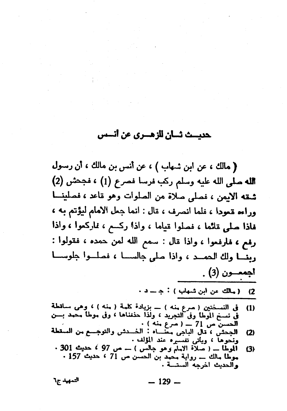 حَدِيثٌ ثَانٍ لِلزُّهْرِيِّ عَنْ أَنَسٍ (مَالِكٌ عَنِ ابْنِ شِهَابٍ) عَنْ أَنَسِ بْنِ مَالِكٍ أَنَّ رَسُولَ اللَّهِ صَلَّى اللَّهُ عَلَيْهِ وَسَلَّمَ رَكِبَ فَرَسًا فَصُرِعَ فَجُحِشَ شِقُّهُ الْأَيْمَنُ فَصَلَّى صَلَاةً مِنَ الصَّلَوَاتِ وَهُوَ قَاعِدٌ فَصَلَّيْنَا وَرَاءَهُ قُعُودًا فَلَمَّا انْصَرَفَ قَالَ إِنَّمَا جُعِلَ الْإِمَامُ لِيُؤْتَمَّ بِهِ فَإِذَا صَلَّى قَائِمًا فَصَلُّوا قِيَامًا وَإِذَا رَكَعَ فَارْكَعُوا وَإِذَا رَفَعَ فَارْفَعُوا وَإِذَا قَالَ سَمِعَ اللَّهُ لِمَنْ حَمِدَهُ فَقُولُوا رَبَّنَا وَلَكَ الْحَمْدُ وَإِذَا صَلَّى جَالِسًا فَصَلُّوا جُلُوسًا أَجْمَعُونَ