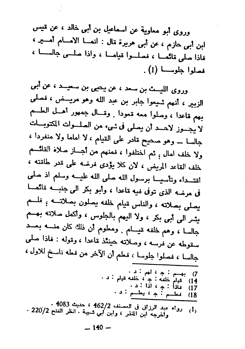 وَرَوَى أَبُو مُعَاوِيَةَ عَنْ إِسْمَاعِيلَ بْنِ أَبِي خَالِدٍ عَنْ قَيْسِ بْنِ أَبِي حَازِمٍ عَنْ أَبِي هُرَيْرَةَ قَالَ إِنَّمَا الْإِمَامُ أَمِيرٌ فَإِذَا صَلَّى قَائِمًا فَصَلُّوا قِيَامًا وَإِذَا صَلَّى جَالِسًا فَصَلُّوا جُلُوسًا وَرَوَى اللَّيْثُ بْنُ سَعْدٍ عَنْ يَحْيَى بْنِ سَعِيدٍ عَنْ أَبِي الزُّبَيْرِ أَنَّهُمْ شَيَّعُوا جَابِرَ بْنَ عَبْدِ اللَّهِ وَهُوَ مَرِيضٌ فَصَلَّى بِهِمْ قَاعِدًا وَصَلَّوْا مَعَهُ قُعُودًا وَقَالَ جُمْهُورُ أَهْلِ الْعِلْمِ لَا يَجُوزُ لِأَحَدٍ أَنْ يُصَلِّيَ فِي شَيْءٍ مِنَ الصَّلَوَاتِ الْمَكْتُوبَاتِ جَالِسًا وَهُوَ صَحِيحٌ قَادِرٌ عَلَى الْقِيَامِ لَا إِمَامًا ولا منفردا ولا خلف امال ثُمَّ اخْتَلَفُوا فَمِنْهُمْ مَنْ أَجَازَ صَلَاةَ الْقَائِمِ خَلْفَ الْقَاعِدِ الْمَرِيضِ لِأَنَّ كُلًّا يُؤَدِّي فَرْضَهُ عَلَى قَدْرِ طَاقَتِهِ اقْتِدَاءً وَتَأَسِّيًا بِرَسُولِ اللَّهِ صَلَّى اللَّهُ عَلَيْهِ وَسَلَّمَ إِذْ صَلَّى فِي مَرَضِهِ الَّذِي تُوُفِّيَ فِيهِ قَاعِدًا وَأَبُو بَكْرٍ إِلَى جَنْبِهِ قَائِمًا يُصَلِّي بِصَلَاتِهِ وَالنَّاسُ قِيَامٌ خَلْفَهُ يُصَلُّونَ بِصَلَاتِهِ فَلَمْ يُشِرْ إِلَى أَبِي بَكْرٍ وَلَا إِلَيْهِمْ بِالْجُلُوسِ وَأَكْمَلَ صَلَاتَهُ بِهِمْ جَالِسًا وَهُمْ خَلْفَهُ قِيَامٌ وَمَعْلُومٌ أَنَّ ذَلِكَ كَانَ مِنْهُ بَعْدَ سُقُوطِهِ عَنْ فَرَسِهِ وَصَلَاتِهِ حِينَئِذٍ قَاعِدًا وَقَوْلِهِ فَإِذَا صَلَّى جَالِسًا فَصَلُّوا جُلُوسًا فَعُلِمَ أَنَّ الْآخِرَ مِنْ فِعْلِهِ نَاسِخٌ للأول