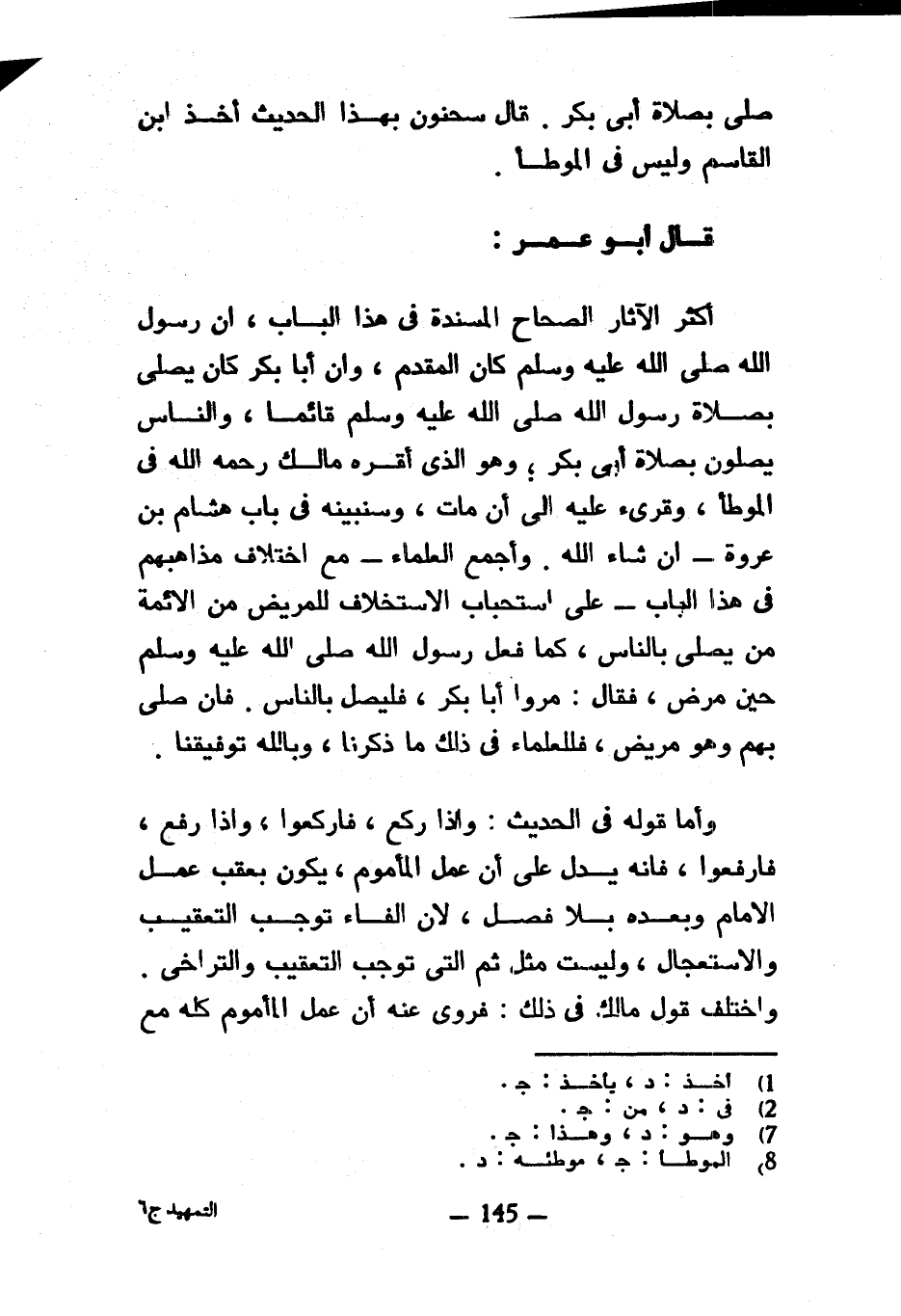 صَلَّى بِصَلَاةِ أَبِي بَكْرٍ قَالَ سَحْنُونٌ بِهَذَا الْحَدِيثِ أَخَذَ ابْنُ الْقَاسِمِ وَلَيْسَ فِي الْمُوَطَّإِ قَالَ أَبُو عُمَرَ أَكْثَرُ الْآثَارِ الصِّحَاحِ الْمُسْنَدَةِ فِي هَذَا الْبَابِ أَنَّ رَسُولَ اللَّهِ صَلَّى اللَّهُ عَلَيْهِ وَسَلَّمَ كَانَ الْمُقَدَّمَ وَأَنَّ أَبَا بَكْرٍ كَانَ يُصَلِّي بِصَلَاةِ رَسُولِ اللَّهِ صَلَّى اللَّهُ عَلَيْهِ وَسَلَّمَ قَائِمًا وَالنَّاسُ يُصَلُّونَ بِصَلَاةِ أَبِي بَكْرٍ وَهُوَ الَّذِي أَقَرَّهُ مَالِكٌ رَحِمَهُ الله في الموطأ وقرىء عَلَيْهِ إِلَى أَنْ مَاتَ وَسَنُبَيِّنُهُ فِي بَابِ هِشَامِ بْنِ عُرْوَةَ إِنْ شَاءَ اللَّهُ وَأَجْمَعَ الْعُلَمَاءُ مَعَ اخْتِلَافِ مَذَاهِبِهِمْ فِي هَذَا الْبَابِ عَلَى اسْتِحْبَابِ الِاسْتِخْلَافِ لِلْمَرِيضِ مِنَ الْأَئِمَّةِ مَنْ يُصَلِّي بِالنَّاسِ كَمَا فَعَلَ رَسُولُ اللَّهِ صَلَّى اللَّهُ عَلَيْهِ وَسَلَّمَ حِينَ مَرِضَ فَقَالَ مُرُوا أَبَا بَكْرٍ فَلْيُصَلِّ بِالنَّاسِ فَإِنْ صَلَّى بِهِمْ وَهُوَ مَرِيضٌ فَلِلْعُلَمَاءِ فِي ذَلِكَ مَا ذَكَرْنَا وَبِاللَّهِ تَوْفِيقُنَا وَأَمَّا قَوْلُهُ فِي الْحَدِيثِ وَإِذَا رَكَعَ فَارْكَعُوا وَإِذَا رَفَعَ فَارْفَعُوا فَإِنَّهُ يَدُلُّ عَلَى أَنَّ عَمَلَ الْمَأْمُومِ يَكُونُ بِعَقِبِ عَمَلِ الْإِمَامِ وَبَعْدَهُ بِلَا فَصْلٍ لِأَنَّ الْفَاءَ تُوجِبُ التَّعْقِيبَ وَالِاسْتِعْجَالَ وَلَيْسَتْ مِثْلَ ثُمَّ الَّتِي تُوجِبُ التَّعْقِيبَ وَالتَّرَاخِيَ وَاخْتَلَفَ قَوْلُ مَالِكٍ فِي ذَلِكَ فَرُوِيَ عَنْهُ أَنَّ عَمَلَ الْمَأْمُومِ كُلَّهُ مَعَ