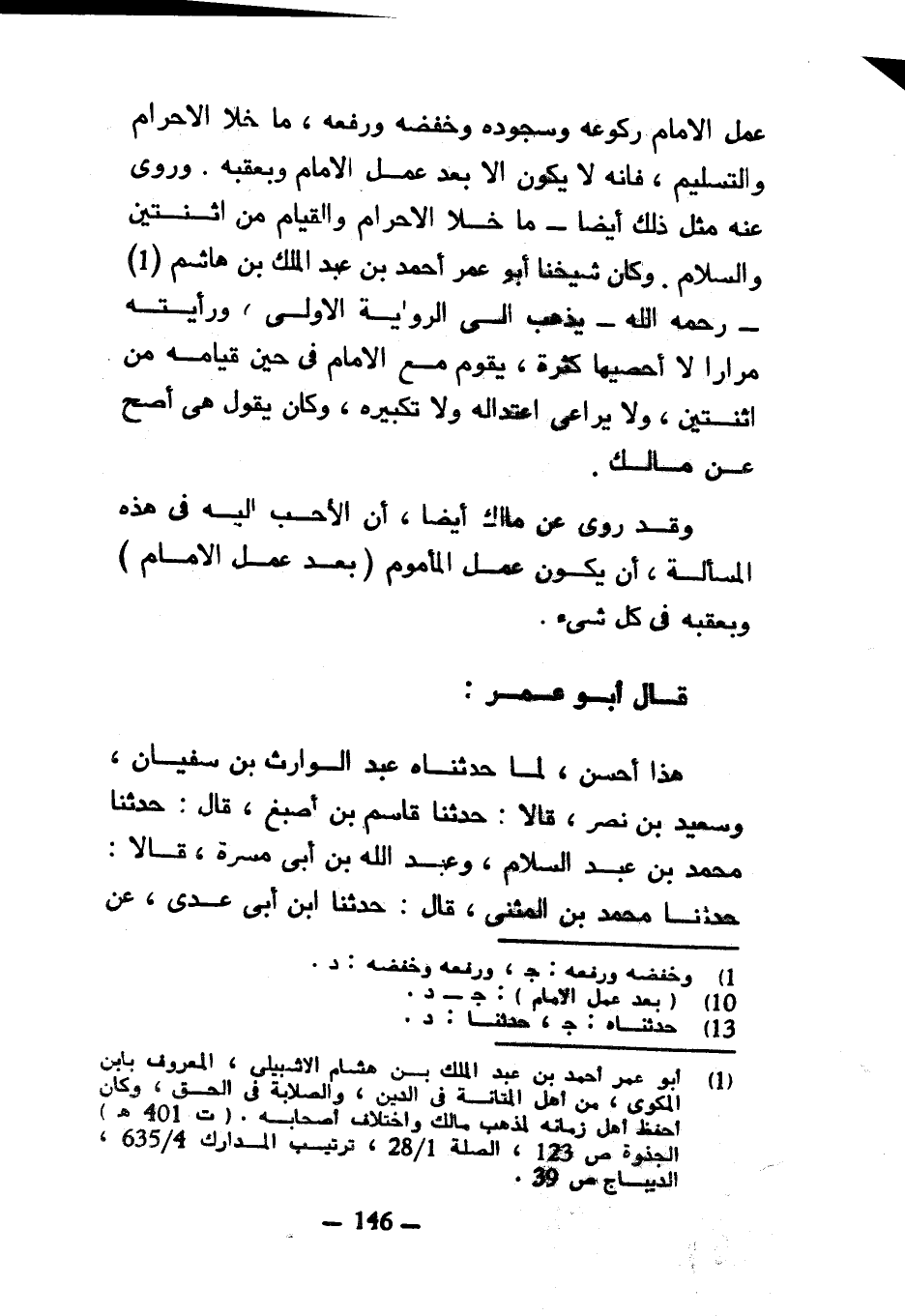عَمَلِ الْإِمَامِ رُكُوعِهِ وَسُجُودِهِ وَخَفْضِهِ وَرَفْعِهِ مَا خَلَا الْإِحْرَامَ وَالتَّسْلِيمَ فَإِنَّهُ لَا يَكُونُ إِلَّا بَعْدَ عَمَلِ الْإِمَامِ وَبِعَقِبِهِ وَرُوِيَ عَنْهُ مِثْلُ ذَلِكَ أَيْضًا مَا خَلَا الْإِحْرَامَ وَالْقِيَامَ مِنِ اثْنَتَيْنِ وَالسَّلَامَ وَكَانَ شَيْخُنَا أَبُو عُمَرَ أَحْمَدُ بْنَ عَبْدِ الْمَلِكِ بْنِ هَاشِمٍ رحمه الله يَذْهَبُ إِلَى الرِّوَايَةِ الْأُولَى وَرَأَيْتُهُ مِرَارًا لَا أُحْصِيهَا كَثْرَةً يَقُومُ مَعَ الْإِمَامِ فِي حِينِ قِيَامِهِ مِنِ اثْنَتَيْنِ وَلَا يُرَاعِي اعْتِدَالَهُ وَلَا تَكْبِيرَهُ وَكَانَ يَقُولُ هِيَ أَصَحُّ عَنْ مَالِكٍ وَقَدْ رُوِيَ عَنْ مَالِكٍ أَيْضًا أَنَّ الْأَحَبَّ إِلَيْهِ فِي هَذِهِ الْمَسْأَلَةِ أَنْ يَكُونَ عَمَلُ الْمَأْمُومِ (بَعْدَ عَمَلِ الْإِمَامِ) وَبِعَقِبِهِ فِي كُلِّ شَيْءٍ قَالَ أَبُو عُمَرَ هَذَا أَحْسَنُ لِمَا حَدَّثَنَاهُ عَبْدُ الْوَارِثِ بْنُ سُفْيَانَ وَسَعِيدُ بْنُ نَصْرٍ قَالَا حَدَّثَنَا قَاسِمُ بْنُ أَصْبَغَ قَالَ حَدَّثَنَا مُحَمَّدُ بْنُ عَبْدِ السَّلَامِ وَعَبْدُ اللَّهِ بْنُ أَبِي مَسَرَّةَ قَالَا حَدَّثَنَا مُحَمَّدُ بْنُ الْمُثَنَّى قَالَ حَدَّثَنَا ابْنُ أَبِي عَدِيٍّ عَنْ