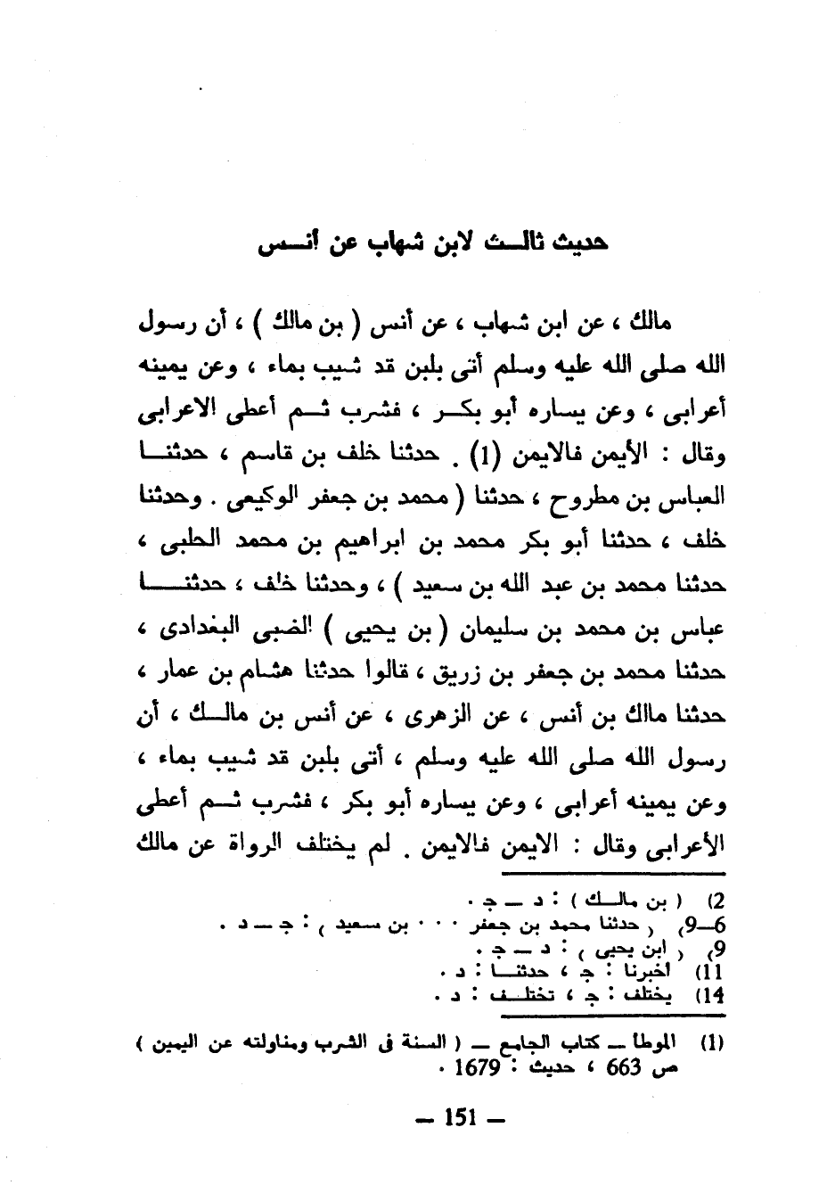 حديثٌ ثَالِثٌ لِابْنِ شِهَابٍ عَنْ أَنَسٍ مَالِكٌ عَنِ ابْنِ شِهَابٍ عَنْ أَنَسِ (بْنِ مَالِكٍ) أَنَّ رَسُولَ اللَّهِ صَلَّى اللَّهُ عليه وسلم أُتِيَ بِلَبَنٍ قَدْ شِيبَ بِمَاءٍ وَعَنْ يَمِينِهِ أَعْرَابِيٌّ وَعَنْ يَسَارِهِ أَبُو بَكْرٍ فَشَرِبَ ثُمَّ أَعْطَى الْأَعْرَابِيَّ وَقَالَ الْأَيْمَنَ فَالْأَيْمَنَ حَدَّثَنَا خَلَفُ بْنُ قَاسِمٍ حَدَّثَنَا الْعَبَّاسُ بْنُ مَطْرُوحٍ حَدَّثَنَا (مُحَمَّدُ بْنُ جَعْفَرٍ الْوَكِيعِيُّ وَحَدَّثَنَا خَلَفٌ حَدَّثَنَا أَبُو بَكْرٍ مُحَمَّدُ بْنُ إِبْرَاهِيمَ بْنِ مُحَمَّدٍ الْحَلَبِيُّ حَدَّثَنَا مُحَمَّدُ بْنُ عَبْدِ اللَّهِ بْنِ سَعِيدٍ) وَحَدَّثَنَا خَلَفٌ حَدَّثَنَا عَبَّاسُ بْنُ مُحَمَّدِ بْنِ سُلَيْمَانَ بْنِ يَحْيَى الضَّبِّيُّ الْبَغْدَادِيُّ حَدَّثَنَا مُحَمَّدُ بْنُ جَعْفَرِ بْنِ زُرَيْقٍ قَالُوا حَدَّثَنَا هِشَامُ بْنُ عَمَّارٍ حَدَّثَنَا مَالِكُ بْنُ أَنَسٍ عَنِ الزُّهْرِيِّ عَنْ أَنَسِ بْنِ مَالِكٍ أَنَّ رَسُولَ اللَّهِ صَلَّى اللَّهُ عَلَيْهِ وَسَلَّمَ أُتِيَ بِلَبَنٍ قَدْ شِيبَ بِمَاءٍ وَعَنْ يَمِينِهِ أَعْرَابِيٌّ وَعَنْ يَسَارِهِ أَبُو بَكْرٍ فَشَرِبَ ثُمَّ أَعْطَى الْأَعْرَابِيَّ وَقَالَ الْأَيْمَنَ فَالْأَيْمَنَ لَمْ يَخْتَلِفِ الرُّوَاةُ عَنْ مَالِكٍ