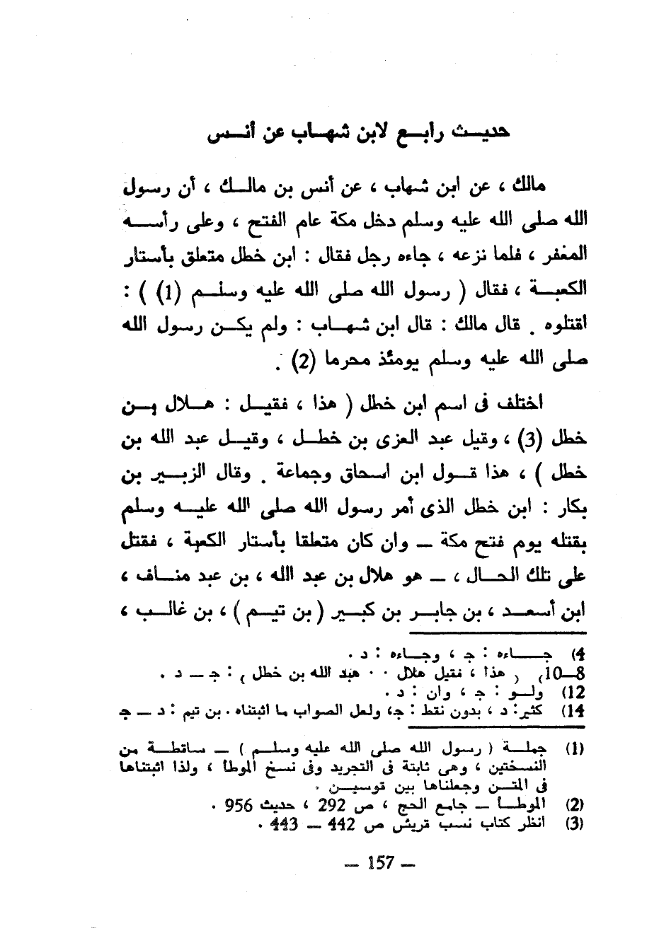 حَدِيثٌ رَابِعٌ لِابْنِ شِهَابٍ عَنْ أَنَسٍ مَالِكٌ عَنِ ابْنِ شِهَابٍ عَنْ أَنَسِ بْنِ مَالِكٍ أَنَّ رَسُولَ اللَّهِ صَلَّى اللَّهُ عليه وسلم دَخَلَ مَكَّةَ عَامَ الْفَتْحِ وَعَلَى رَأْسِهِ الْمِغْفَرُ فَلَمَّا نَزَعَهُ جَاءَهُ رَجُلٌ فَقَالَ ابْنُ خَطَلٍ مُتَعَلِّقٌ بِأَسْتَارِ الْكَعْبَةِ فَقَالَ (رَسُولُ اللَّهِ صَلَّى اللَّهُ عَلَيْهِ وَسَلَّمَ (1)) اقْتُلُوهُ قَالَ مَالِكٌ قَالَ ابْنُ شِهَابٍ وَلَمْ يَكُنْ رَسُولُ اللَّهِ صَلَّى اللَّهُ عَلَيْهِ وَسَلَّمَ يَوْمَئِذٍ مُحْرِمًا اخْتُلِفَ فِي اسْمِ ابْنِ خَطَلٍ (هَذَا فَقِيلَ هِلَالُ بْنُ خَطَلٍ (3) وَقِيلَ عَبْدُ الْعُزَّى بْنُ خَطَلٍ وَقِيلَ عَبْدُ اللَّهِ بْنُ خَطَلٍ) هَذَا قَوْلُ ابْنِ إِسْحَاقَ وَجَمَاعَةٍ وَقَالَ الزُّبَيْرُ بْنُ بَكَّارٍ ابْنُ خَطَلٍ الَّذِي أَمَرَ رَسُولُ اللَّهِ صَلَّى اللَّهُ عَلَيْهِ وَسَلَّمَ بِقَتْلِهِ يَوْمَ فَتْحِ مَكَّةَ وَإِنْ كَانَ مُتَعَلِّقًا بِأَسْتَارِ الْكَعْبَةِ فَقُتِلَ عَلَى تِلْكَ الْحَالِ هُوَ هِلَالُ بْنُ عَبْدِ اللَّهِ بْنِ عَبْدِ مَنَافِ بْنِ أَسْعَدَ بْنِ جَابِرِ بْنِ كبير (بن تيم) بن غالب