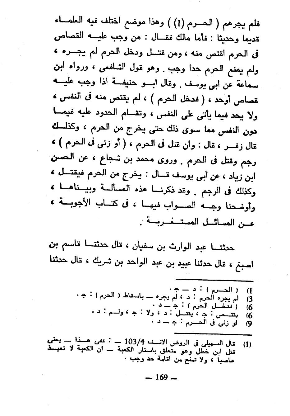 فَلَمْ يُجِرْهُمُ (الْحَرَمُ (1)) وَهَذَا مَوْضِعٌ اخْتَلَفَ فِيهِ الْعُلَمَاءُ قَدِيمًا وَحَدِيثًا فَأَمَّا مَالِكٌ فَقَالَ مَنْ وَجَبَ عَلَيْهِ الْقِصَاصُ فِي الْحَرَمِ اقْتُصَّ مِنْهُ وَمَنْ قَتَلَ وَدَخَلَ الْحَرَمَ لَمْ يُجِرْهُ وَلَمْ يَمْنَعِ الْحَرَمُ حَدًّا وَجَبَ وَهُوَ قَوْلُ الشَّافِعِيِّ وَرَوَاهُ ابْنُ سَمَاعَةَ عَنْ أَبِي يُوسُفَ وَقَالَ أَبُو حَنِيفَةَ إِذَا وَجَبَ عَلَيْهِ قِصَاصٌ أَوْ حَدٌّ (فَدَخَلَ الْحَرَمَ) لَمْ يُقْتَصَّ مِنْهُ فِي النَّفْسِ وَلَا يُحَدُّ فِيمَا يَأْتِي عَلَى النَّفْسِ وَتُقَامُ الْحُدُودُ عَلَيْهِ فِيمَا دُونَ النَّفْسِ مِمَّا سِوَى ذَلِكَ حَتَّى يَخْرُجَ مِنَ الْحَرَمِ وَكَذَلِكَ قَالَ زُفَرُ قَالَ وَإِنْ قَتَلَ فِي الْحَرَمِ (أَوْ زَنَى فِي الْحَرَمِ) رُجِمَ وَقُتِلَ فِي الْحَرَمِ وَرَوَى مُحَمَّدُ بْنُ شُجَاعٍ عَنِ الْحَسَنِ بْنِ زِيَادٍ عَنْ أَبِي يُوسُفَ قَالَ يُخْرَجُ مِنَ الْحَرَمِ فَيُقْتَلُ وَكَذَلِكَ فِي الرَّجْمِ وَقَدْ ذَكَرْنَا هَذِهِ الْمَسْأَلَةَ وَبَيَّنَّاهَا وَأَوْضَحْنَا وَجْهَ الصَّوَابِ فِيهَا فِي كِتَابِ الْأَجْوِبَةِ عَنِ الْمَسَائِلِ الْمُسْتَغْرَبَةِ حَدَّثَنَا عَبْدُ الْوَارِثِ بْنُ سُفْيَانَ قَالَ حَدَّثَنَا قَاسِمُ بْنُ أَصْبَغَ قَالَ حَدَّثَنَا عُبَيْدُ بْنُ عَبْدِ الْوَاحِدِ بْنِ شَرِيكٍ قَالَ حَدَّثَنَا