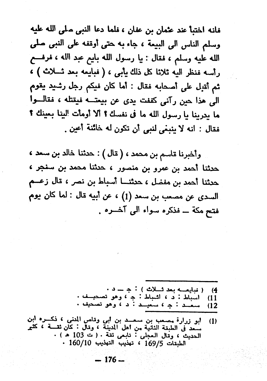 فَإِنَّهُ اخْتَبَأَ عِنْدَ عُثْمَانَ بْنِ عَفَّانَ فَلَمَّا دَعَا النَّبِيُّ صَلَّى اللَّهُ عَلَيْهِ وَسَلَّمَ النَّاسَ إِلَى الْبَيْعَةِ جَاءَ بِهِ حَتَّى أَوْقَفَهُ عَلَى النَّبِيِّ صَلَّى اللَّهُ عَلَيْهِ وَسَلَّمَ فَقَالَ يَا رَسُولَ اللَّهِ بَايِعْ عَبْدَ اللَّهِ فَرَفَعَ رَأْسَهُ فَنَظَرَ إِلَيْهِ ثَلَاثًا كُلُّ ذَلِكَ يَأْبَى (فَبَايَعَهُ بَعْدَ ثَلَاثٍ) ثُمَّ أَقْبَلَ عَلَى أَصْحَابِهِ فَقَالَ أما كان فيكم رَجُلٌ رَشِيدٌ يَقُومُ إِلَى هَذَا حِينَ رَآنِي كَفَفْتُ يَدِيَ عَنْ بَيْعَتِهِ فَيَقْتُلَهُ فَقَالُوا مَا يُدْرِينَا يَا رَسُولَ اللَّهِ مَا فِي نَفْسِكَ أَلَا أَوْمَأْتَ إِلَيْنَا بِعَيْنِكَ فَقَالَ إِنَّهُ لَا يَنْبَغِي لِنَبِيٍّ أَنْ تَكُونَ لَهُ خَائِنَةُ أَعْيُنٍ وَأَخْبَرَنَا قَاسِمُ بْنُ مُحَمَّدٍ (قَالَ) حَدَّثَنَا خَالِدُ بْنُ سَعْدٍ حَدَّثَنَا أَحْمَدُ بْنُ عَمْرِو بْنِ مَنْصُورٍ حَدَّثَنَا مُحَمَّدُ بْنُ سَنْجَرٍ حَدَّثَنَا أَحْمَدُ بْنُ مُفَضَّلٍ حَدَّثَنَا أَسْبَاطُ بْنُ نَصْرٍ قَالَ زَعَمَ السُّدِّيُّ عَنْ مُصْعَبِ بْنِ سَعْدٍ عَنْ أَبِيهِ قَالَ لَمَّا كَانَ يَوْمُ فَتْحِ مَكَّةَ فَذَكَرَهُ سَوَاءً إِلَى آخِرِهِ