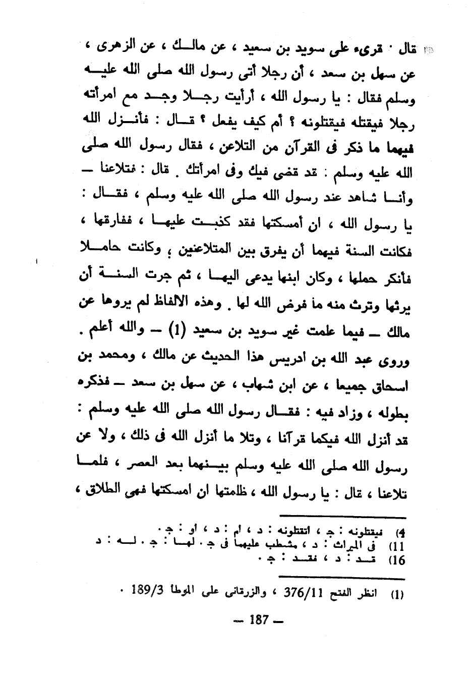 قال قرىء عَلَى سُوِيدِ بْنِ سَعِيدٍ عَنْ مَالِكٍ عَنِ الزُّهْرِيِّ عَنْ سَهْلِ بْنِ سَعْدٍ أَنَّ رَجُلًا أَتَى رَسُولَ اللَّهِ صَلَّى اللَّهُ عليه وسلم فَقَالَ يَا رَسُولَ اللَّهِ أَرَأَيْتَ رَجُلًا وَجَدَ مَعَ امْرَأَتِهِ رَجُلًا فَيَقْتُلُهُ فَيَقْتُلُونَهُ أَمْ كَيْفَ يَفْعَلُ قَالَ فَأَنْزَلَ اللَّهُ فِيهِمَا مَا ذُكِرَ فِي الْقُرْآنِ مِنَ التَّلَاعُنِ فَقَالَ رَسُولُ اللَّهِ صَلَّى اللَّهُ عَلَيْهِ وَسَلَّمَ قَدْ قُضِيَ فِيكَ وَفِي امْرَأَتِكَ قَالَ فَتَلَاعَنَا وَأَنَا شَاهِدٌ عِنْدَ رَسُولِ اللَّهِ صَلَّى اللَّهُ عَلَيْهِ وَسَلَّمَ فقال يَا رَسُولَ اللَّهِ إِنْ أَمْسَكْتُهَا فَقَدْ كَذَبْتُ عَلَيْهَا فَفَارَقَهَا فَكَانَتِ السُّنَّةُ فِيهِمَا أَنْ يُفَرَّقَ بَيْنَ الْمُتَلَاعِنَيْنِ وَكَانَتْ حَامِلًا فَأَنْكَرَ حَمْلَهَا وَكَانَ ابْنُهَا يُدْعَى إِلَيْهَا ثُمَّ جَرَتِ السُّنَّةُ أَنْ يرثها وترث منه ما فرض الله لها وَهَذِهِ الْأَلْفَاظُ لَمْ يَرْوِهَا عَنْ مَالِكٍ فِيمَا عَلِمْتُ غَيْرُ سُوِيدِ بْنِ سَعِيدٍ وَاللَّهُ أَعْلَمُ وَرَوَى عَبْدُ اللَّهِ بْنُ إِدْرِيسَ هَذَا الْحَدِيثَ عَنْ مَالِكٍ وَمُحَمَّدِ بْنِ إِسْحَاقَ جَمِيعًا عَنِ ابْنِ شِهَابٍ عَنْ سَهْلِ بْنِ سَعْدٍ فَذَكَرَهُ بِطُولِهِ وَزَادَ فِيهِ فَقَالَ رَسُولُ اللَّهِ صَلَّى اللَّهُ عَلَيْهِ وَسَلَّمَ قَدْ أَنْزَلَ اللَّهُ فِيكُمَا قُرْآنًا وَتَلَا مَا أَنْزَلَ اللَّهُ فِي ذَلِكَ و! لا عَنْ رَسُولِ اللَّهِ صَلَّى اللَّهُ عَلَيْهِ وَسَلَّمَ بَيْنَهُمَا بَعْدَ الْعَصْرِ فَلَمَّا تَلَاعَنَا قَالَ يَا رَسُولَ اللَّهِ ظَلَمْتُهَا إِنْ أَمْسَكْتُهَا فَهِيَ الطَّلَاقُ
