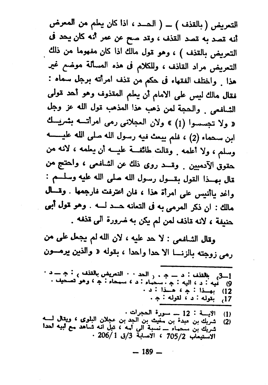 التَّعْرِيضِ (بِالْقَذْفِ) (الْحَدُّ إِذَا كَانَ يَعْلَمُ مِنَ الْمُعَرِّضِ أَنَّهُ قَصَدَ بِهِ قَصْدَ الْقَذْفِ وَقَدْ صَحَّ عَنْ عُمَرَ أَنَّهُ كَانَ يَحُدُّ فِي التَّعْرِيضِ بِالْقَذْفِ) وَهُوَ قَوْلُ مَالِكٍ إِذَا كَانَ مَفْهُومًا مِنْ ذَلِكَ التَّعْرِيضِ مُرَادُ الْقَاذِفِ وَلِلْكَلَامِ فِي هَذِهِ الْمَسْأَلَةِ مَوْضِعٌ غَيْرُ هَذَا وَاخْتَلَفَ الْفُقَهَاءُ فِي حُكْمِ مَنْ قَذَفَ امْرَأَتَهُ بِرَجُلٍ سَمَّاهُ فَقَالَ مَالِكٌ لَيْسَ عَلَى الْإِمَامِ أَنْ يُعْلِمَ الْمَقْذُوفَ وَهُوَ أَحَدُ قَوْلَيِ الشَّافِعِيِّ وَالْحُجَّةُ لِمَنْ ذَهَبَ هَذَا الْمَذْهَبَ قَوْلُ اللَّهِ عَزَّ وَجَلَّ وَلَا تَجَسَّسُوا وَلِأَنَّ الْعَجْلَانِيَّ رَمَى امْرَأَتَهُ بشريك ابن سَحْمَاءَ فَلَمْ يَبْعَثْ فِيهِ رَسُولُ اللَّهِ صَلَّى اللَّهُ عَلَيْهِ وَسَلَّمَ وَلَا أَعْلَمَهُ وَقَالَتْ طَائِفَةٌ عَلَيْهِ أَنْ يُعْلِمَهُ لِأَنَّهُ مِنْ حُقُوقِ الْآدَمِيِّينَ وَقَدْ رُوِيَ ذَلِكَ عَنِ الشَّافِعِيِّ وَاحْتَجَّ مَنْ قَالَ بِهَذَا الْقَوْلِ بِقَوْلِ رَسُولِ اللَّهِ صَلَّى اللَّهُ عَلَيْهِ وَسَلَّمَ وَاغَدُ يَا أُنَيْسُ عَلَى امْرَأَةِ هَذَا فَإِنِ اعْتَرَفَتْ فَارْجُمْهَا وَقَالَ مَالِكٌ إِنْ ذَكَرَ الْمَرْمِيَّ بِهِ فِي الْتِعَانِهِ حُدَّ لَهُ وَهُوَ قَوْلُ أَبِي حَنِيفَةَ لِأَنَّهُ قَاذِفٌ لِمَنْ لَمْ يَكُنْ بِهِ ضَرُورَةٌ إِلَى قَذْفِهِ وَقَالَ الشَّافِعِيُّ لَا حَدَّ عَلَيْهِ لِأَنَّ اللَّهَ لَمْ يَجْعَلْ عَلَى مَنْ رَمَى زَوْجَتَهُ بِالزِّنَا إِلَّا حَدًّا وَاحِدًا بِقَوْلِهِ وَالَّذِينَ يَرْمُونَ