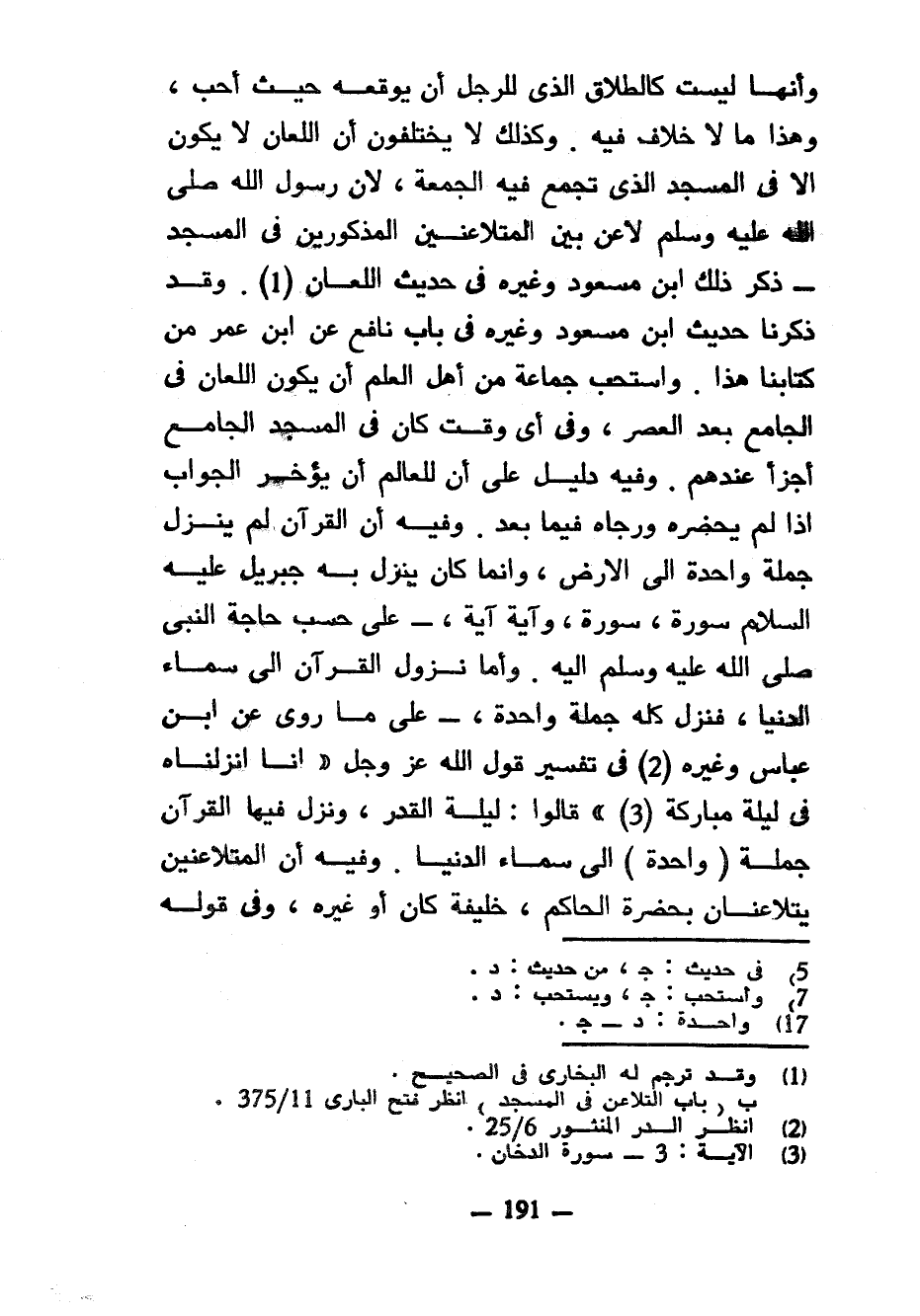 وَأَنَّهَا لَيْسَتْ كَالطَّلَاقِ الَّذِي لِلرَّجُلِ أَنْ يُوقِعَهُ حَيْثُ أَحَبَّ وَهَذَا مَا لَا خِلَافَ فِيهِ وَكَذَلِكَ لَا يَخْتَلِفُونَ أَنَّ اللِّعَانَ لَا يَكُونُ إِلَّا فِي الْمَسْجِدِ الَّذِي تُجْمَعُ فِيهِ الْجُمُعَةُ لِأَنَّ رَسُولَ اللَّهِ صَلَّى اللَّهُ عَلَيْهِ وَسَلَّمَ لَاعَنَ بَيْنَ الْمُتَلَاعِنَيْنِ الْمَذْكُورَيْنِ فِي الْمَسْجِدِ ذَكَرَ ذَلِكَ ابْنُ مَسْعُودٍ وَغَيْرُهُ فِي حَدِيثِ اللِّعَانِ وَقَدْ ذَكَرْنَا حَدِيثَ ابْنِ مَسْعُودٍ وَغَيْرِهِ فِي بَابِ نَافِعٍ عَنِ ابْنِ عُمَرَ مِنْ كِتَابِنَا هَذَا وَاسْتَحَبَّ جَمَاعَةٌ مِنْ أَهْلِ الْعِلْمِ أَنْ يَكُونَ اللِّعَانُ فِي الْجَامِعِ بَعْدَ الْعَصْرِ وَفِي أَيِّ وَقْتٍ كَانَ فِي الْمَسْجِدِ الْجَامِعِ أَجْزَأَ عِنْدَهُمْ وَفِيهِ دَلِيلٌ عَلَى أَنَّ لِلْعَالِمِ أَنْ يُؤَخِّرَ الْجَوَابَ إِذَا لَمْ يَحْضُرْهُ وَرَجَاهُ فِيمَا بَعْدُ وَفِيهِ أَنَّ الْقُرْآنَ لَمْ يَنْزِلْ جُمْلَةً وَاحِدَةً إِلَى الْأَرْضِ وَإِنَّمَا كَانَ يَنْزِلُ بِهِ جِبْرِيلُ عَلَيْهِ السَّلَامُ سُورَةً سُورَةً وَآيَةً آيَةً عَلَى حَسَبِ حَاجَةِ النَّبِيِّ صَلَّى اللَّهُ عَلَيْهِ وَسَلَّمَ إِلَيْهِ وَأَمَّا نُزُولُ الْقُرْآنِ إِلَى سَمَاءِ الدُّنْيَا فَنَزَلَ كُلُّهُ جُمْلَةً وَاحِدَةً عَلَى مَا رُوِيَ عَنِ ابْنِ عَبَّاسٍ وَغَيْرِهِ فِي تَفْسِيرِ قَوْلِ اللَّهِ عَزَّ وَجَلَّ إِنَّا أَنْزَلْنَاهُ فِي لَيْلَةِ مباركة قالوا ليلة القدر ونزل فِيهَا الْقُرْآنُ جُمْلَةً (وَاحِدَةً) إِلَى السَّمَاءِ الدُّنْيَا وَفِيهِ أَنَّ الْمُتَلَاعِنَيْنِ يَتَلَاعَنَانِ بِحَضْرَةِ الْحَاكِمِ خَلِيفَةً كان أوغيره وفي قوله