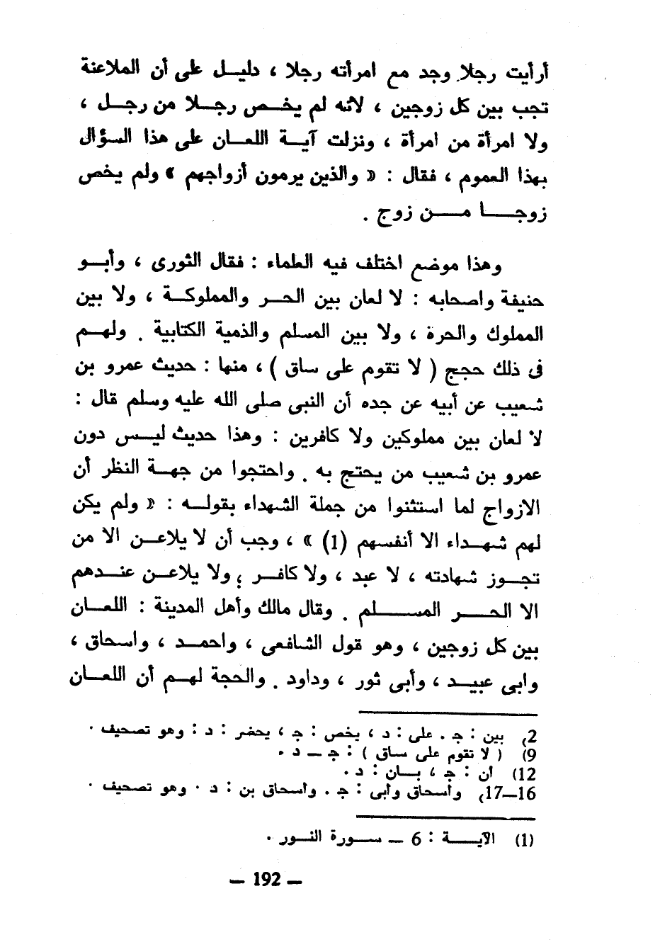 أَرَأَيْتَ رَجُلًا وَجَدَ مَعَ امْرَأَتِهِ رَجُلًا دَلِيلٌ عَلَى أَنَّ الْمُلَاعَنَةَ تَجِبُ بَيْنَ كُلِّ زَوْجَيْنِ لِأَنَّهُ لَمْ يَخُصَّ رَجُلًا مِنْ رَجُلٍ وَلَا امْرَأَةً مِنِ امْرَأَةٍ وَنَزَلَتْ آيَةُ اللِّعَانِ عَلَى هَذَا السُّؤَالِ بِهَذَا الْعُمُومِ فَقَالَ وَالَّذِينَ يَرْمُونَ أَزْوَاجَهُمْ وَلَمْ يَخُصَّ زَوْجًا مِنْ زَوْجٍ وَهَذَا مَوْضِعٌ اخْتَلَفَ فِيهِ الْعُلَمَاءُ فَقَالَ الثَّوْرِيُّ وَأَبُو حَنِيفَةَ وَأَصْحَابُهُ لَا لِعَانَ بَيْنَ الْحُرِّ وَالْمَمْلُوكَةِ وَلَا بَيْنَ الْمَمْلُوكِ وَالْحُرَّةِ وَلَا بَيْنَ الْمُسْلِمِ وَالذِّمِّيَّةِ الْكِتَابِيَّةِ وَلَهُمْ فِي ذَلِكَ حُجَجٌ (لَا تَقُومُ عَلَى سَاقٍ) مِنْهَا حَدِيثُ عَمْرِو بْنِ شُعَيْبٍ عَنْ أَبِيهِ عَنْ جَدِّهِ أَنَّ النَّبِيَّ صَلَّى اللَّهُ عَلَيْهِ وَسَلَّمَ قَالَ لَا لِعَانَ بَيْنَ مَمْلُوكَيْنِ وَلَا كَافِرَيْنِ وَهَذَا حَدِيثٌ لَيْسَ دُونَ عَمْرِو بْنِ شُعَيْبٍ مَنْ يُحْتَجُّ بِهِ وَاحْتَجُّوا مِنْ جِهَةِ النَّظَرِ أَنَّ الْأَزْوَاجَ لَمَّا اسْتُثْنُوا مِنْ جُمْلَةِ الشُّهَدَاءِ بِقَوْلِهِ وَلَمْ يَكُنْ لَهُمْ شُهَدَاءُ إِلَّا أَنْفُسُهُمْ وَجَبَ أَنْ لَا يُلَاعِنَ إِلَّا مَنْ تَجُوزُ شَهَادَتُهُ لَا عَبْدٌ وَلَا كَافِرٌ وَلَا يُلَاعِنُ عِنْدَهُمْ إِلَّا الْحُرُّ الْمُسْلِمُ وَقَالَ مَالِكٌ وَأَهْلُ الْمَدِينَةِ اللِّعَانُ بَيْنَ كُلِّ زَوْجَيْنِ وَهُوَ قَوْلُ الشَّافِعِيِّ وَأَحْمَدَ وَإِسْحَاقَ وَأَبِي عُبَيْدٍ وَأَبِي ثَوْرٍ وَدَاوُدَ وَالْحُجَّةُ لَهُمْ أن اللعان