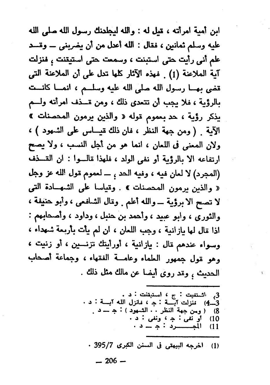 ابْنُ أُمَيَّةَ امْرَأَتَهُ قِيلَ لَهُ وَاللَّهِ لَيَجْلِدَنَّكَ رَسُولُ اللَّهِ صَلَّى اللَّهُ عَلَيْهِ وَسَلَّمَ ثَمَانِينَ فَقَالَ اللَّهُ أَعْدَلُ مِنْ أَنْ يَضْرِبَنِي وَقَدْ عَلِمَ أَنِّي رَأَيْتُ حَتَّى اسْتَبَنْتُ وَسَمِعْتُ حَتَّى اسْتَيْقَنْتُ فَنَزَلَتْ آيَةُ الْمُلَاعَنَةِ فَهَذِهِ الْآثَارُ كُلُّهَا تَدُلُّ عَلَى أَنَّ الْمُلَاعَنَةَ الَّتِي قَضَى بِهَا رَسُولُ اللَّهِ صَلَّى اللَّهُ عَلَيْهِ وَسَلَّمَ إنما كَانَتْ بِالرُّؤْيَةِ فَلَا يَجِبُ أَنْ تَتَعَدَّى ذَلِكَ وَمَنْ قَذَفَ امْرَأَتَهُ وَلَمْ يَذْكُرْ رُؤْيَةً حُدَّ بِعُمُومِ قَوْلِهِ وَالَّذِينَ يَرْمُونَ الْمُحْصَنَاتِ الْآيَةَ (وَمِنْ جِهَةِ النَّظَرِ فَإِنَّ ذَلِكَ قِيَاسٌ عَلَى الشُّهُودِ) وَلِأَنَّ الْمَعْنَى فِي اللِّعَانِ إِنَّمَا هُوَ مِنْ أَجْلِ النَّسَبِ وَلَا يَصِحُّ ارْتِفَاعُهُ إِلَّا بِالرُّؤْيَةِ أَوْ نَفْيِ الْوَلَدِ فَلِهَذَا قَالُوا إِنَّ الْقَذْفَ (الْمُجَرَّدَ) لَا لِعَانَ فِيهِ وَفِيهِ الْحَدُّ لِعُمُومِ قَوْلِ اللَّهِ عَزَّ وَجَلَّ وَالَّذِينَ يَرْمُونَ الْمُحْصَنَاتِ وَقِيَاسًا عَلَى الشَّهَادَةِ الَّتِي لَا تَصِحُّ إِلَّا بِرُؤْيَةٍ وَاللَّهُ أَعْلَمُ وَقَالَ الشَّافِعِيُّ وَأَبُو حَنِيفَةَ وَالثَّوْرِيُّ وَأَبُو عُبَيْدٍ وَأَحْمَدُ بْنُ حَنْبَلٍ وَدَاوُدُ وَأَصْحَابُهُمْ إِذَا قَالَ لَهَا يَا زَانِيَةً وَجَبَ اللِّعَانُ إِنْ لَمْ يَأْتِ بِأَرْبَعَةِ شُهَدَاءَ وَسَوَاءٌ عِنْدَهُمْ قَالَ يَا زَانِيَةً أَوْ رَأَيْتُكِ تَزْنِينَ أَوْ زَنَيْتِ وَهُوَ قَوْلُ جُمْهُورِ الْعُلَمَاءِ وَعَامَّةِ الْفُقَهَاءِ وَجَمَاعَةِ أَصْحَابِ الْحَدِيثِ وَقَدْ رُوِيَ أَيْضًا عَنْ مَالِكٍ مِثْلُ ذَلِكَ