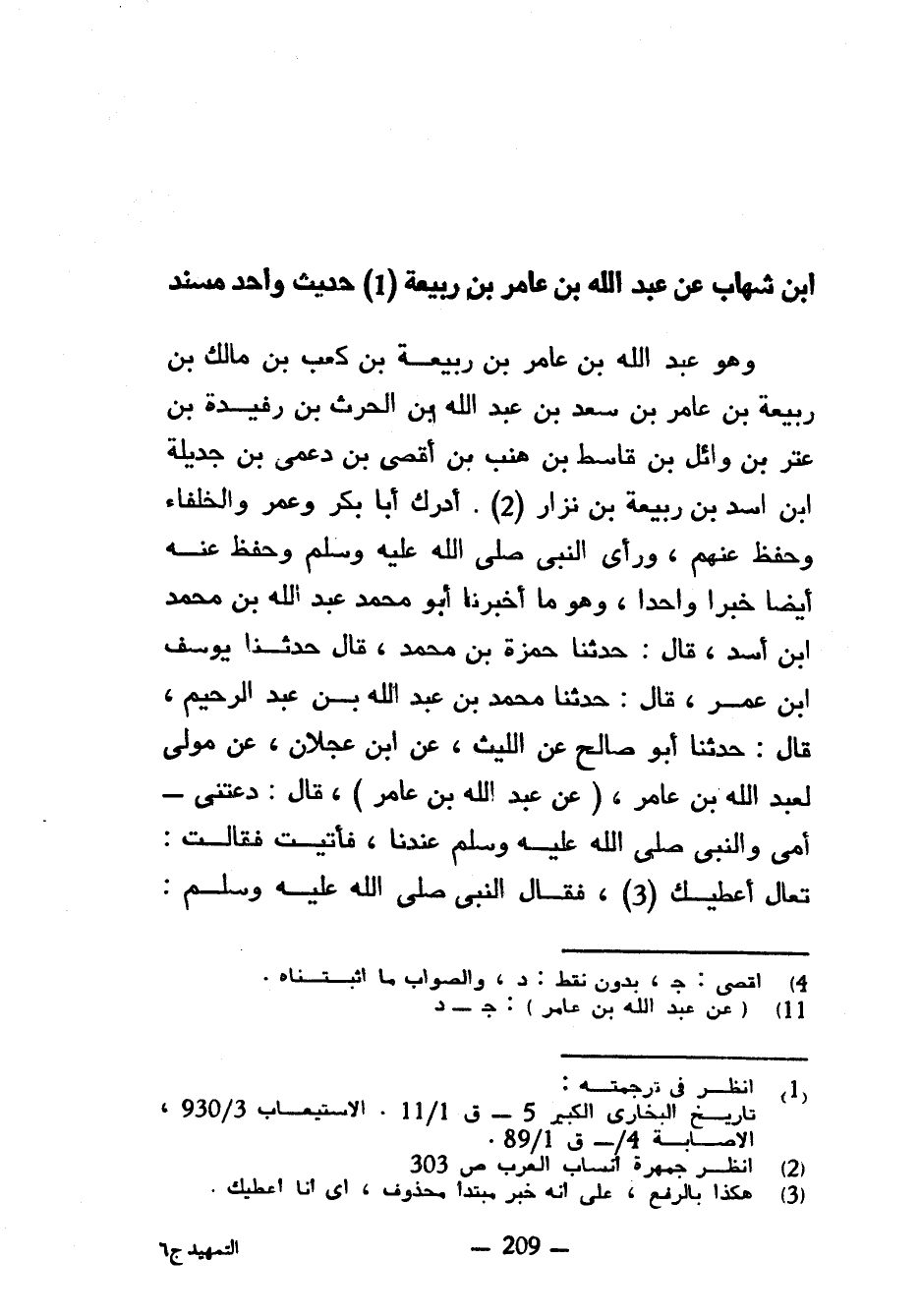 ابن شهاب عَنْ عَبْدِ اللَّهِ بْنِ عَامِرِ بْنِ رَبِيعَةَ حَدِيثٌ وَاحِدٌ مُسْنَدٌ وَهُوَ عَبْدُ اللَّهِ بْنُ عَامِرِ بْنِ رَبِيعَةَ بْنِ كَعْبِ بْنِ مَالِكِ بْنِ رَبِيعَةَ بْنِ عَامِرِ بْنِ سعد بن عبد الله بن الحرث بن رفيدة بن عتر بْنِ وَائِلِ بْنِ قَاسِطِ بْنِ هِنْبِ بْنِ أقصى بن دعمى بن جديلة ابن أَسَدِ بْنِ رَبِيعَةَ بْنِ نِزَارٍ أَدْرَكَ أَبَا بَكْرٍ وَعُمَرَ وَالْخُلَفَاءَ وَحَفِظَ عَنْهُمْ وَرَأَى النَّبِيَّ صَلَّى اللَّهُ عَلَيْهِ وَسَلَّمَ وَحَفِظَ عَنْهُ أَيْضًا خَبَرًا وَاحِدًا وَهُوَ مَا أَخْبَرَنَا أَبُو مُحَمَّدٍ عَبْدُ اللَّهِ بْنُ مُحَمَّدِ بْنِ أَسَدٍ قَالَ حَدَّثَنَا حَمْزَةُ بْنُ مُحَمَّدٍ قَالَ حَدَّثَنَا يُوسُفُ ابن عُمَرَ قَالَ حَدَّثَنَا مُحَمَّدُ بْنُ عَبْدِ اللَّهِ بْنِ عَبْدِ الرَّحِيمِ قَالَ حَدَّثَنَا أَبُو صَالِحٍ عَنِ اللَّيْثِ عَنِ ابْنِ عِجْلَانَ عَنْ مَوْلًى لِعَبْدِ اللَّهِ بْنِ عَامِرٍ (عَنْ عَبْدِ اللَّهِ بْنِ عَامِرٍ) قَالَ دَعَتْنِي أُمِّي وَالنَّبِيُّ صَلَّى اللَّهُ عَلَيْهِ وَسَلَّمَ عِنْدَنَا فَأَتَيْتُ فَقَالَتْ تَعَالَ أُعْطِيكَ فَقَالَ النَّبِيُّ صَلَّى اللَّهُ عَلَيْهِ وَسَلَّمَ