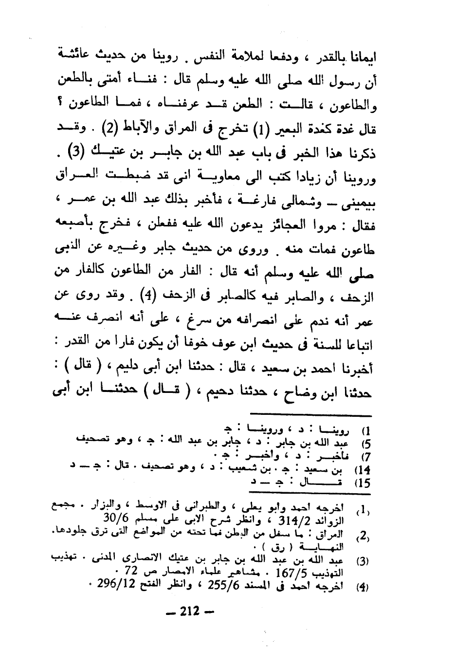 إِيمَانًا بِالْقَدَرِ وَدَفْعًا لِمَلَامَةِ النَّفْسِ رُوِّينَا مِنْ حَدِيثِ عَائِشَةَ أَنَّ رَسُولَ اللَّهِ صَلَّى اللَّهُ عَلَيْهِ وَسَلَّمَ قَالَ فَنَاءُ أُمَّتِي بِالطَّعْنِ وَالطَّاعُونِ قَالَتِ الطَّعْنُ قَدْ عَرَفْنَاهُ فَمَا الطَّاعُونُ قَالَ غُدَّةٌ كَغُدَّةِ الْبَعِيرِ تَخْرُجُ فِي الْمَرَاقِ وَالْآبَاطِ وَقَدْ ذَكَرْنَا هَذَا الْخَبَرَ فِي بَابِ عَبْدِ اللَّهِ بْنِ جَابِرِ بْنِ عَتِيكٍ وَرُوِّينَا أَنَّ زِيَادًا كَتَبَ إِلَى مُعَاوِيَةَ أَنِّي قَدْ ضَبَطْتُ الْعِرَاقَ بِيَمِينِي وَشِمَالِي فَارِغَةٌ فَأُخْبِرَ بِذَلِكَ عَبْدُ اللَّهِ بْنُ عُمَرَ فَقَالَ مُرُوا الْعَجَائِزَ يَدْعُونَ اللَّهَ عَلَيْهِ فَفَعَلْنَ فَخَرَجَ بِأُصْبُعِهِ طَاعُونٌ فَمَاتَ مِنْهُ وَرُوِيَ مِنْ حَدِيثِ جَابِرٍ وَغَيْرِهِ عَنِ النَّبِيِّ صَلَّى اللَّهُ عَلَيْهِ وَسَلَّمَ أَنَّهُ قَالَ الْفَارُّ مِنَ الطَّاعُونِ كَالْفَارِّ مِنَ الزَّحْفِ وَالصَّابِرُ فِيهِ كَالصَّابِرِ فِي الزَّحْفِ وَقَدْ رُوِيَ عَنْ عُمَرَ أَنَّهُ نَدِمَ عَلَى انْصِرَافِهِ مِنْ سَرْغَ عَلَى أَنَّهُ انْصَرَفَ عَنْهُ اتِّبَاعًا لِلسُّنَّةِ فِي حَدِيثِ ابْنِ عَوْفٍ خَوْفًا أَنْ يَكُونَ فَارًّا مِنَ الْقَدَرِ أَخْبَرَنَا أَحْمَدُ بْنُ سَعِيدٍ قَالَ حَدَّثَنَا ابْنُ أَبِي دُلَيْمٍ (قَالَ) حَدَّثَنَا ابْنُ وَضَّاحٍ حَدَّثَنَا دُحَيْمٌ (قَالَ) حَدَّثَنَا ابْنُ أَبِي