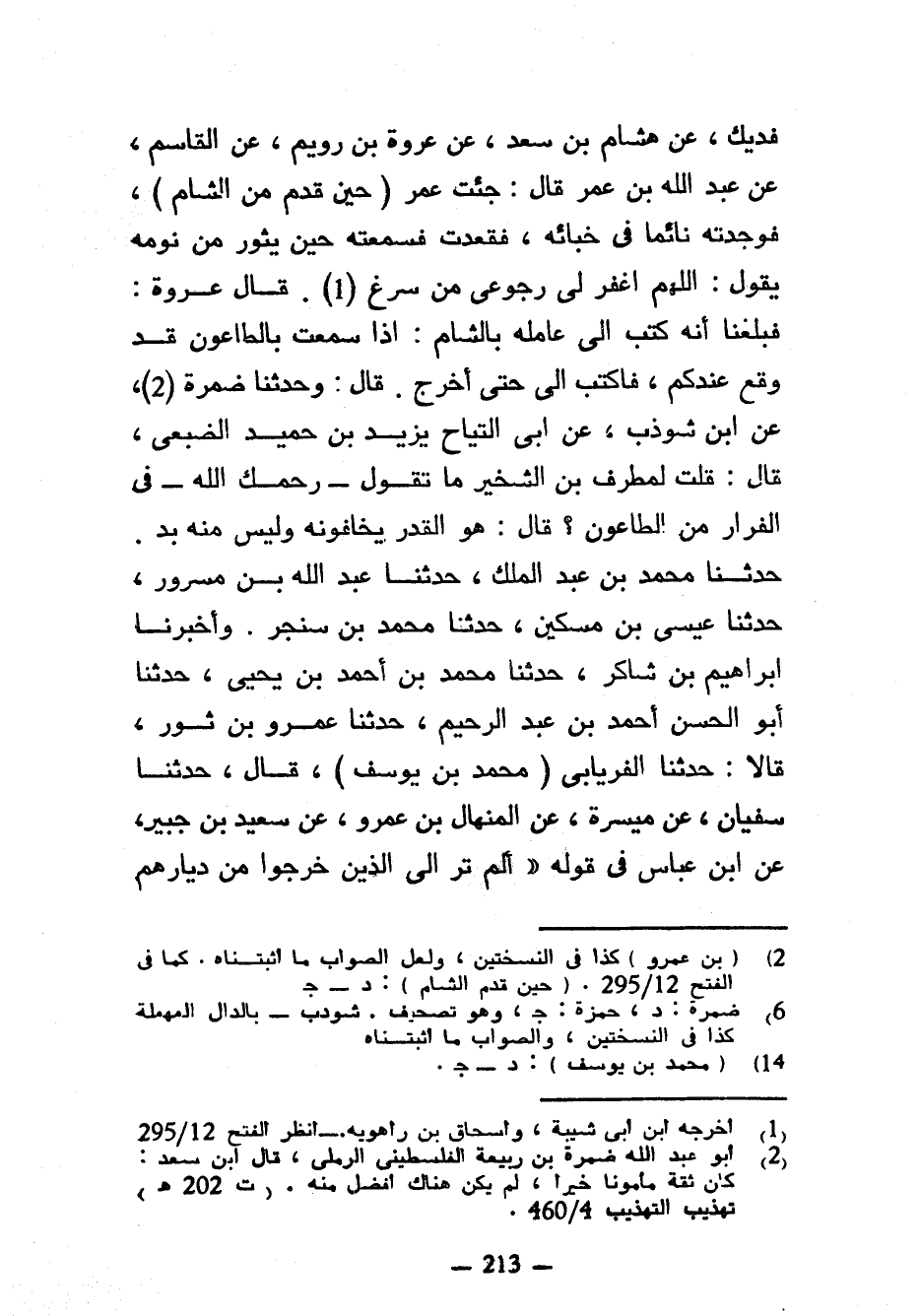 فُدَيْكٍ عَنْ هِشَامِ بْنِ سَعْدٍ عَنْ عُرْوَةَ بْنِ رُوَيْمٍ عَنِ الْقَاسِمِ عَنْ عَبْدِ اللَّهِ بْنِ عُمَرَ قَالَ جِئْتُ عُمَرَ (حِينَ قَدِمَ مِنْ الشَّامِ) فَوَجَدْتُهُ نَائِمًا فِي خِبَائِهِ فَقَعَدْتُ فَسَمِعْتُهُ حِينَ يَثُورُ مِنْ نَوْمِهِ يَقُولُ اللَّهُمَّ اغْفِرْ لِي رُجُوعِي مِنْ سَرْغَ قَالَ عُرْوَةُ فَبَلَغَنَا أَنَّهُ كَتَبَ إِلَى عَامِلِهِ بِالشَّامِ إِذَا سَمِعْتَ بِالطَّاعُونِ قَدْ وَقَعَ عِنْدَكُمْ فَاكْتُبْ إِلَيَّ حَتَّى أَخْرُجَ قَالَ وَحَدَّثَنَا ضَمْرَةُ عَنِ ابْنِ شَوْذَبٍ عَنْ أَبِي التَّيَّاحِ يَزِيدَ بْنِ حُمَيْدٍ الضُّبَعِيِّ قَالَ قُلْتُ لِمُطَرِّفِ بْنِ الشِّخِّيرِ مَا تَقُولُ رَحِمَكَ اللَّهُ فِي الْفِرَارِ مِنَ الطَّاعُونِ قَالَ هُوَ الْقَدَرُ يَخَافُونَهُ وَلَيْسَ مِنْهُ بُدٌّ حَدَّثَنَا مُحَمَّدُ بْنُ عَبْدِ الْمَلِكِ حَدَّثَنَا عَبْدُ اللَّهِ بْنُ مَسْرُورٍ حَدَّثَنَا عِيسَى بْنُ مِسْكِينٍ حَدَّثَنَا مُحَمَّدُ بْنُ سَنْجَرٍ وَأَخْبَرَنَا إِبْرَاهِيمُ بْنُ شَاكِرٍ حَدَّثَنَا مُحَمَّدُ بْنُ أَحْمَدَ بْنِ يَحْيَى حَدَّثَنَا أَبُو الْحَسَنِ أَحْمَدُ بْنُ عَبْدِ الرَّحِيمِ حَدَّثَنَا عَمْرُو بْنُ ثَوْرٍ قَالَا حَدَّثَنَا الْفِرْيَابيُّ (مُحَمَّدُ بْنُ يُوسُفَ) قَالَ حَدَّثَنَا سُفْيَانُ عَنْ مَيْسَرَةَ عَنِ الْمِنْهَالِ بْنِ عَمْرٍو عَنْ سَعِيدِ بْنِ جُبَيْرٍ عَنِ ابْنِ عَبَّاسٍ فِي قَوْلِهِ أَلَمْ تَرَ إِلَى الَّذِينَ خَرَجُوا مِنْ دِيَارِهِمْ