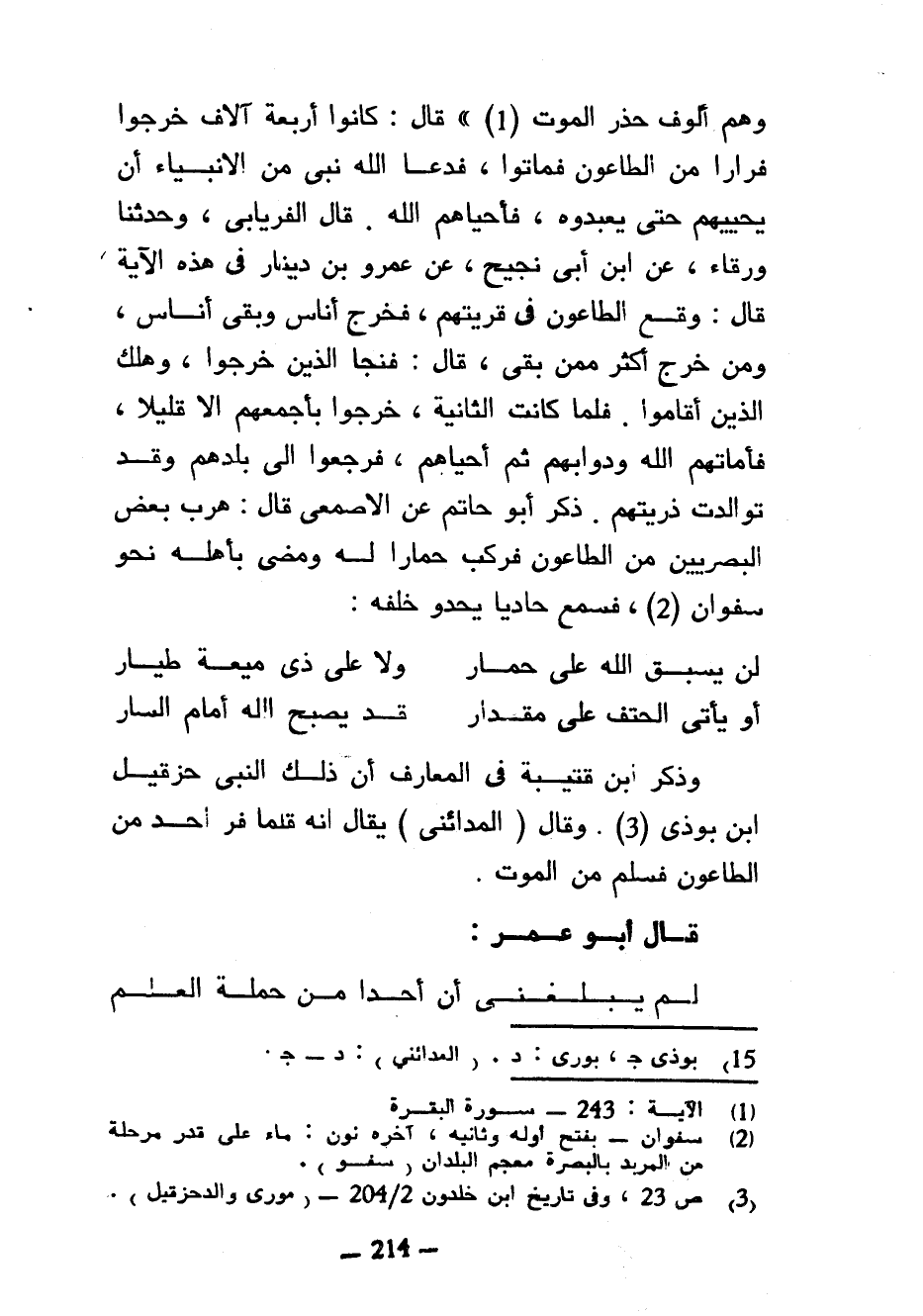 وَهُمْ أُلُوفٌ حَذَرَ الْمَوْتِ قَالَ كَانُوا أَرْبَعَةَ آلَافٍ خَرَجُوا فِرَارًا مِنَ الطَّاعُونِ فَمَاتُوا فَدَعَا اللَّهَ نَبِيٌّ مِنَ الْأَنْبِيَاءِ أَنْ يُحْيِيَهُمْ حَتَّى يَعْبُدُوهُ فَأَحْيَاهُمُ اللَّهُ قَالَ الْفِرْيَابيُّ وَحَدَّثَنَا وَرْقَاءُ عَنِ ابْنِ أَبِي نَجِيحٍ عَنْ عَمْرِو بْنِ دِينَارٍ فِي هَذِهِ الْآيَةِ قَالَ وَقَعَ الطَّاعُونُ فِي قَرْيَتِهِمْ فَخَرَجَ أُنَاسٌ وَبَقِيَ أُنَاسٌ وَمَنْ خَرَجَ أَكْثَرُ مِمَّنْ بَقِيَ قَالَ فَنَجَا الَّذِينَ خَرَجُوا وَهَلَكَ الَّذِينَ أَقَامُوا فَلَمَّا كَانَتِ الثَّانِيَةُ خَرَجُوا بِأَجْمَعِهِمْ إِلَّا قَلِيلًا فَأَمَاتَهُمُ اللَّهُ وَدَوَابَّهُمْ ثُمَّ أَحْيَاهُمْ فَرَجَعُوا إِلَى بَلَدِهِمْ وَقَدْ تَوَالَدَتْ ذُرِّيَّتُهُمْ ذَكَرَ أَبُو حَاتِمٍ عَنِ الْأَصْمَعِيِّ قَالَ هَرَبَ بَعْضُ الْبَصْرِيِّينَ مِنَ الطَّاعُونِ فَرَكِبَ حِمَارًا لَهُ وَمَضَى بِأَهْلِهِ نَحْوَ سَفْوَانَ فَسَمِعَ حَادِيًا يَحْدُو خَلْفَهُ ... لَنْ يُسْبَقَ اللَّهُ عَلَى حِمَارِ ... وَلَا عَلَى ذِي مَيْعَةٍ طَيَّارِ ... ... أَوْ يَأْتِي الْحَتْفُ عَلَى مِقْدَارِ ... قَدْ يُصْبِحُ اللَّهُ أَمَامَ السَّارِ ... وَذَكَرَ ابْنُ قُتَيْبَةَ فِي الْمَعَارِفِ أَنَّ ذَلِكَ النَّبِيَّ حِزْقِيلُ ابْنُ بُوذِي وَقَالَ (الْمَدَائِنِيُّ) يُقَالُ إِنَّهُ قَلَّمَا فَرَّ أَحَدٌ مِنَ الْطَاعُونَ فَسَلِمَ مِنَ الْمَوْتِ قَالَ أَبُو عُمَرَ لَمْ يَبْلُغْنِي أَنَّ أَحَدًا مِنْ حَمَلَةِ الْعِلْمِ