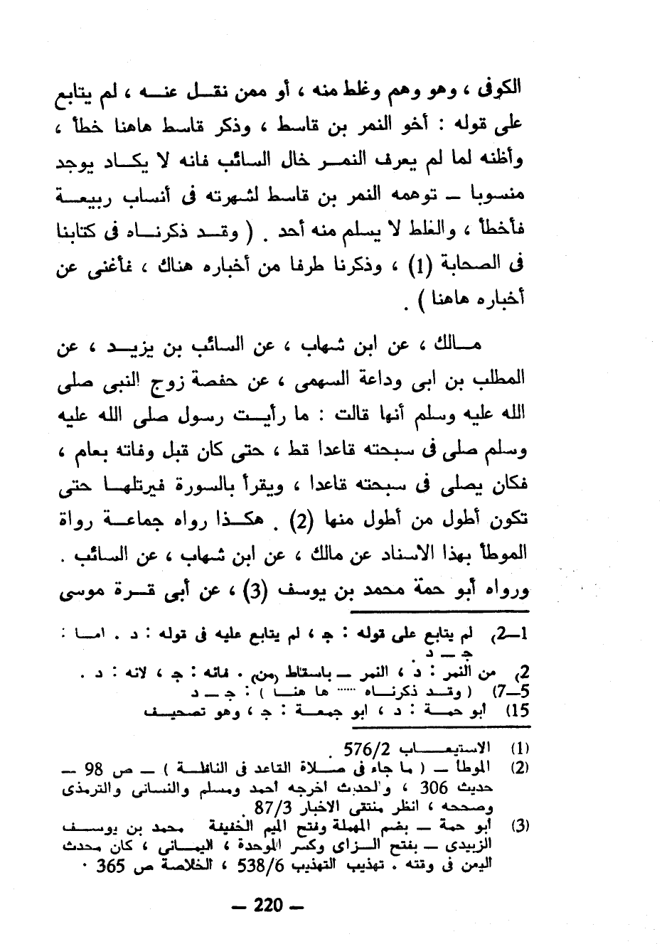 الْكُوفِيُّ وَهُوَ وَهْمٌ وَغَلَطٌ مِنْهُ أَوْ مِمَّنْ نَقَلَ عَنْهُ لَمْ يُتَابَعْ عَلَى قَوْلِهِ أَخُو النَّمِرِ بْنِ قَاسِطٍ وَذِكْرُ قَاسِطٍ هَاهُنَا خَطَأٌ وَأَظُنُّهُ لَمَّا لَمْ يُعْرَفِ النَّمِرُ خَالُ السَّائِبِ فَإِنَّهُ لَا يَكَادُ يُوجَدُ مَنْسُوبًا تَوَهَّمَهُ النَّمِرَ بْنَ قَاسِطٍ لِشُهْرَتِهِ فِي أَنْسَابِ رَبِيعَةَ فَأَخْطَأَ والغلط لا يسلم منه أحد (وقد ذكرنا فِي كِتَابِنَا فِي الصَّحَابَةِ (1) وَذَكَرْنَا طَرَفًا مِنْ أَخْبَارِهِ هُنَاكَ فَأَغْنَى عَنْ أَخْبَارِهِ هَاهُنَا) مَالِكٌ عَنِ ابْنِ شِهَابٍ عَنِ السَّائِبِ بْنِ يَزِيدَ عَنِ الْمُطَّلِبِ بْنِ أَبِي وَدَاعَةَ السَّهْمِيِّ عَنْ حَفْصَةُ زَوْجُ النَّبِيِّ صَلَّى اللَّهُ عَلَيْهِ وَسَلَّمَ أَنَّهَا قَالَتْ مَا رَأَيْتُ رَسُولَ اللَّهِ صَلَّى اللَّهُ عَلَيْهِ وَسَلَّمَ صَلَّى فِي سُبْحَتِهِ قَاعِدًا قَطُّ حَتَّى كَانَ قَبْلَ وَفَاتِهِ بِعَامٍ فَكَانَ يُصَلِّي فِي سُبْحَتِهِ قَاعِدًا وَيَقْرَأُ بِالسُّورَةِ فَيُرَتِّلُهَا حَتَّى تَكُونَ أَطْوَلَ مِنْ أَطْوَلَ مِنْهَا هَكَذَا رَوَاهُ جَمَاعَةُ رُوَاةِ الْمُوَطَّإِ بِهَذَا الْإِسْنَادِ عَنْ مَالِكٍ عَنِ ابْنِ شِهَابٍ عَنِ السَّائِبِ وَرَوَاهُ أَبُو حُمَةَ مُحَمَّدُ بْنُ يُوسُفَ عَنْ أَبِي قرة موسى
