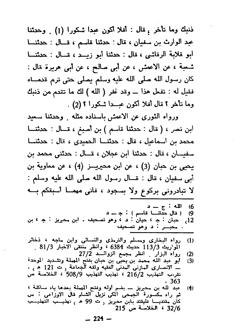 ذَنْبِكَ وَمَا تَأَخَّرَ قَالَ أَفَلَا أَكُونُ عَبْدًا شَكُورًا وَحَدَّثَنَا عَبْدُ الْوَارِثِ بْنُ سُفْيَانَ قَالَ حَدَّثَنَا قَاسِمٌ قَالَ حَدَّثَنَا أَبُو قِلَابَةَ الرِّقَاشِيُّ قَالَ حَدَّثَنَا أَبُو زَيْدٍ قَالَ حَدَّثَنَا شُعْبَةُ عَنِ الْأَعْمَشِ عَنْ أَبِي صَالِحٍ عَنْ أَبِي هُرَيْرَةَ قَالَ كَانَ رَسُولُ اللَّهِ صَلَّى اللَّهُ عَلَيْهِ وَسَلَّمَ يُصَلِّي حَتَّى تَرِمَ قَدَمَاهُ فَقِيلَ لَهُ تَفْعَلُ هَذَا وَقَدْ غَفَرَ (اللَّهُ) لَكَ مَا تَقَدَّمَ مِنْ ذَنْبِكَ وَمَا تَأَخَّرَ قَالَ أَفَلَا أَكُونُ عَبْدًا شَكُورًا وَرَوَاهُ الثَّوْرِيُّ عَنِ الْأَعْمَشِ بِإِسْنَادِهِ مِثْلَهُ وَحَدَّثَنَا سَعِيدُ بْنُ نَصْرٍ (قَالَ حَدَّثَنَا قَاسِمُ) بْنُ أَصْبَغَ قَالَ حَدَّثَنَا مُحَمَّدُ بْنُ إِسْمَاعِيلَ قَالَ حَدَّثَنَا الْحُمَيْدِيُّ قَالَ حَدَّثَنَا سُفْيَانُ قَالَ حدثنا ابن عجلان قَالَ حَدَّثَنِي مُحَمَّدُ بْنُ يَحْيَى بْنِ حَبَّانَ عَنِ ابْنِ مُحَيْرِيزٍ عَنْ مُعَاوِيَةَ بْنِ أَبِي سُفْيَانَ قَالَ قَالَ رَسُولُ اللَّهِ صَلَّى اللَّهُ عَلَيْهِ وَسَلَّمَ لَا تُبَادِرُونِي بِرُكُوعٍ وَلَا بِسُجُودٍ فَإِنِّي مَهْمَا أَسْبِقُكُمْ بِهِ
