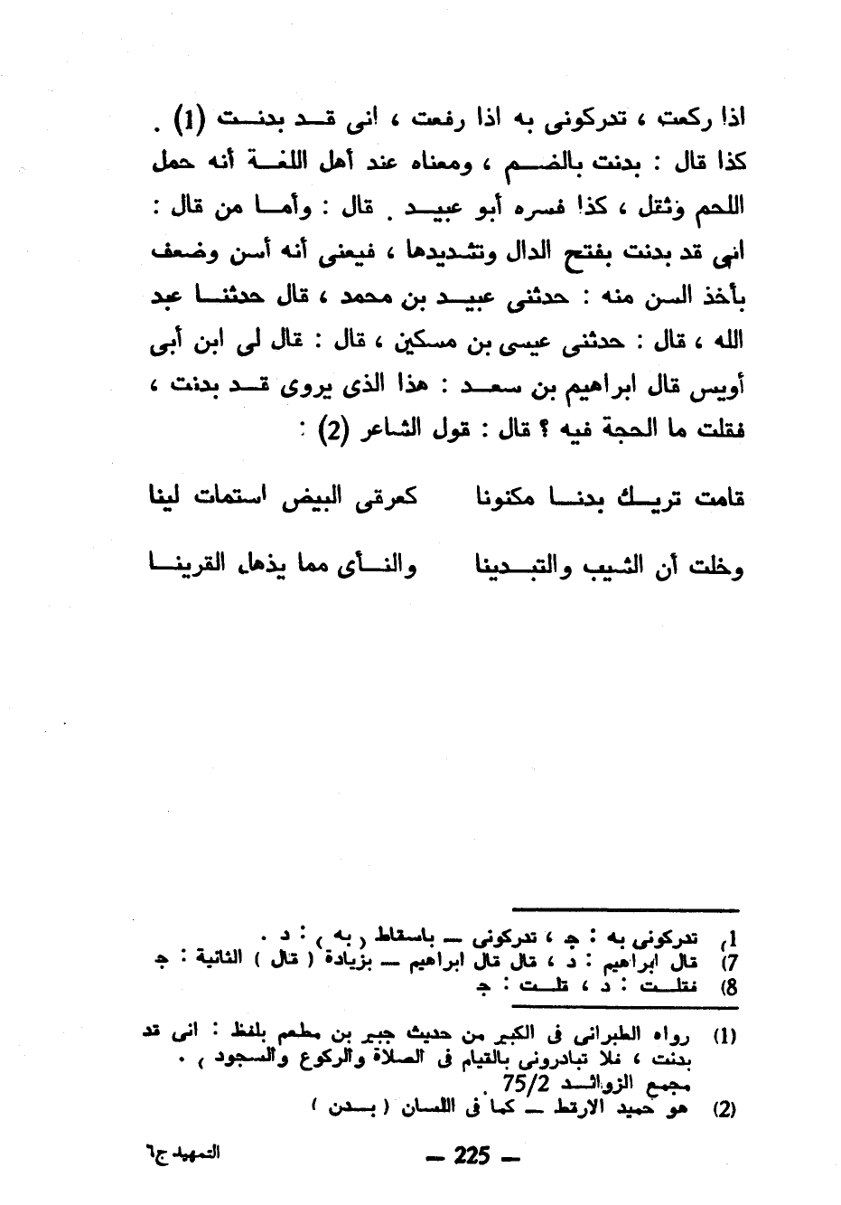 إِذَا رَكَعْتُ تُدْرِكُونِي بِهِ إِذَا رَفَعْتُ إِنِّي قَدْ بَدُنْتُ كَذَا قَالَ بَدُنْتُ بِالضَّمِّ وَمَعْنَاهُ عِنْدَ أَهْلِ اللُّغَةِ أَنَّهُ حَمَلَ اللَّحْمَ وَثَقُلَ كَذَا فَسَّرَهُ أَبُو عُبَيْدٍ قَالَ وَأَمَّا مَنْ قَالَ إِنِّي قَدْ بَدَّنْتُ بِفَتْحِ الدَّالِ وَتَشْدِيدِهَا فَيَعْنِي أَنَّهُ أَسَنَّ وَضَعُفَ بِأَخْذِ السِّنِّ مِنْهُ حَدَّثَنِي عُبَيْدُ بْنُ مُحَمَّدٍ قَالَ حَدَّثَنَا عَبْدُ اللَّهِ قَالَ حَدَّثَنِي عِيسَى بْنُ مِسْكِينٍ قَالَ قَالَ لِي ابْنُ أَبِي أُوَيْسٍ قَالَ إِبْرَاهِيمُ بْنُ سَعْدٍ هَذَا الَّذِي يَرْوِي قَدْ بَدَّنْتُ فَقُلْتُ مَا الْحُجَّةُ فِيهِ قَالَ قَوْلُ الشَّاعِرِ ... قَامَتْ تُرِيكَ بَدَنًا مَكْنُونَا ... كَعِرْقَيِ الْبِيضِ اسْتَمَاتَ لِينَا ... ... وَخِلْتَ أَنَّ الشَّيْبَ وَالتَّبْدِينَا ... ... وَالنَّأْيَ مِمَّا يذهل القرينا